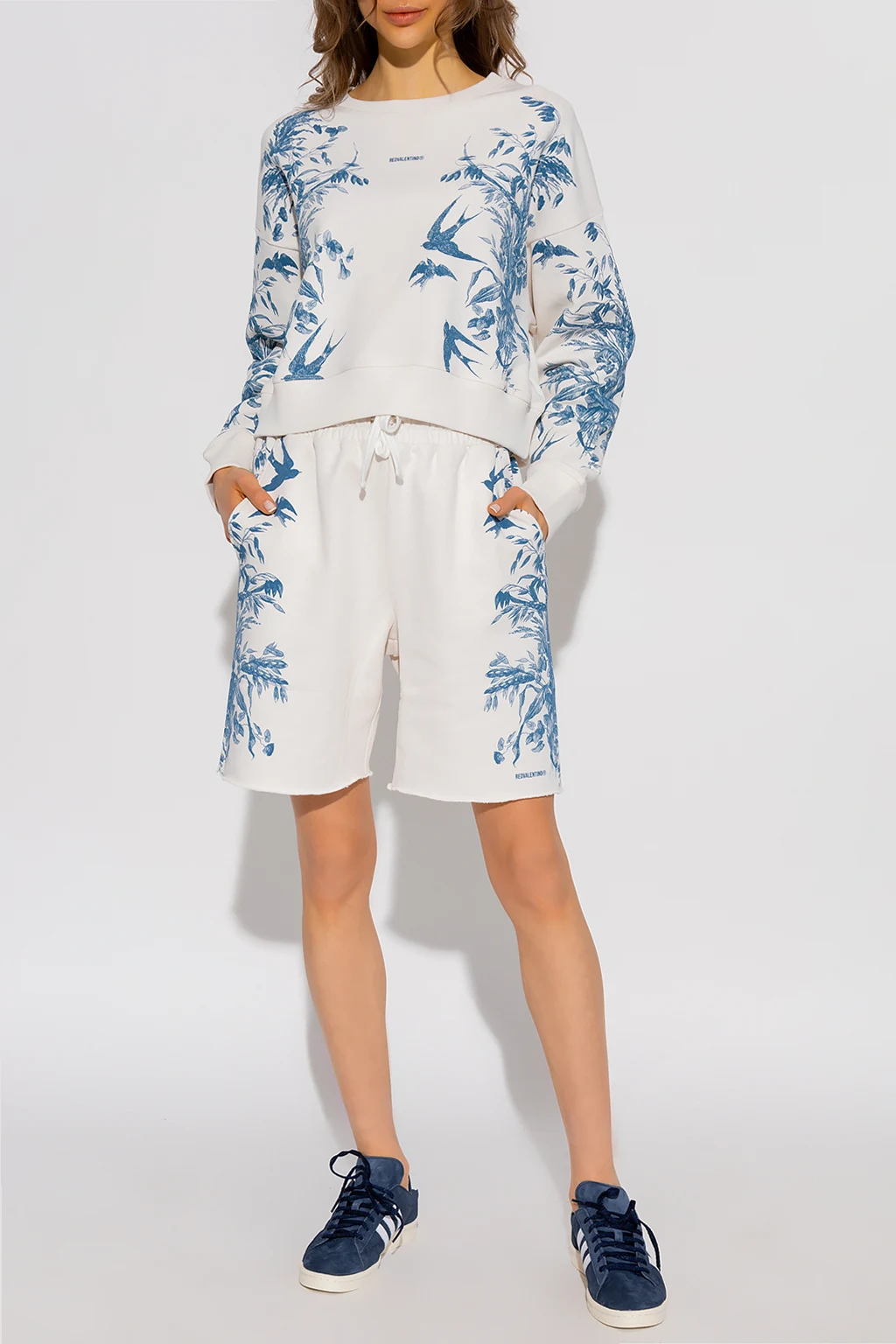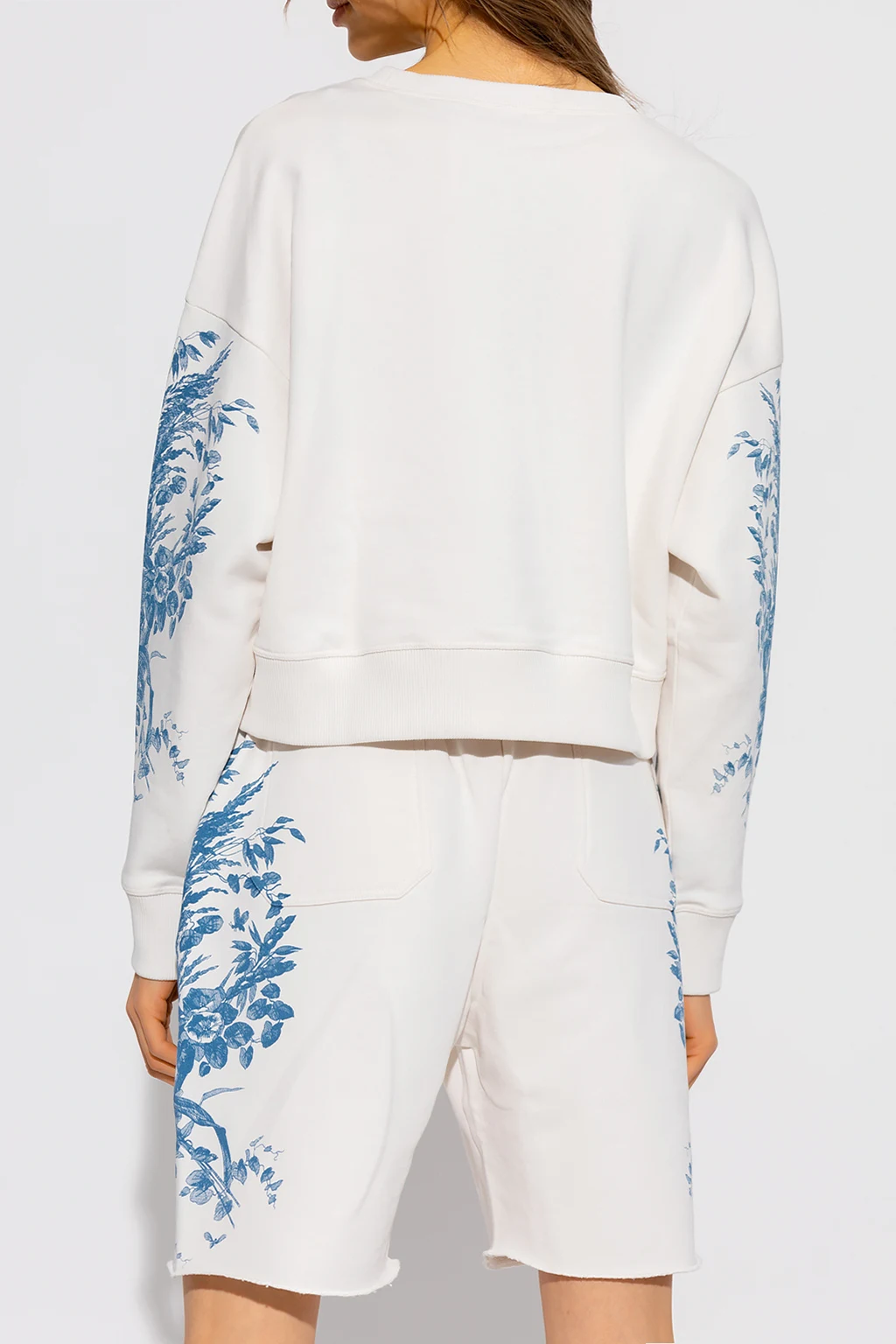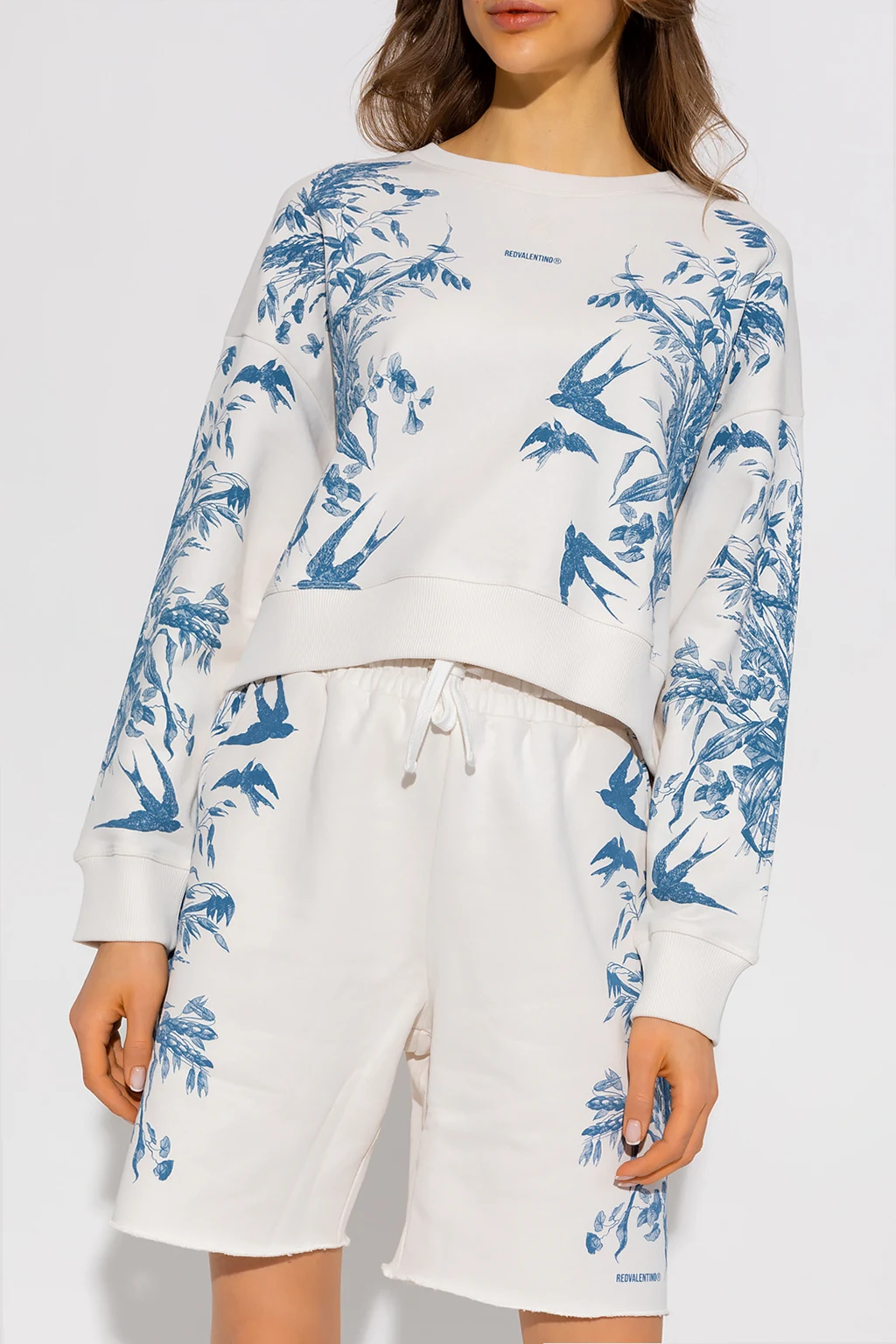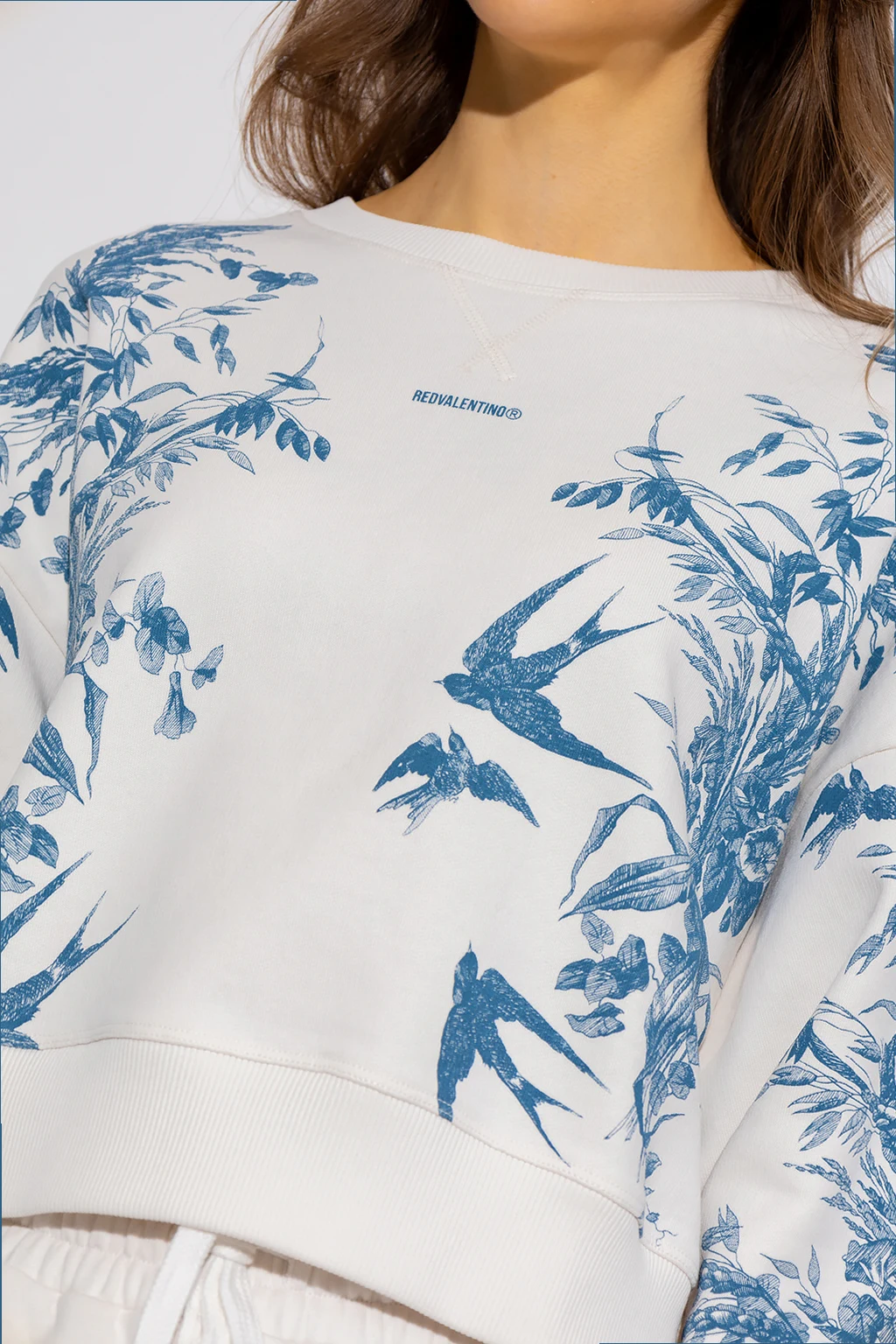 Biała bluza Red Valentino. Wykonana z bawełny. Ozdobiona wzorem z motywem kwiatowym oraz zwierzęcym i logo. Okrągły dekolt, dół i długie rękawy wykończone ściągaczem.