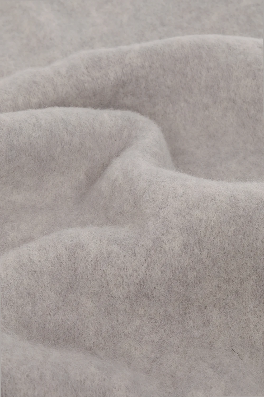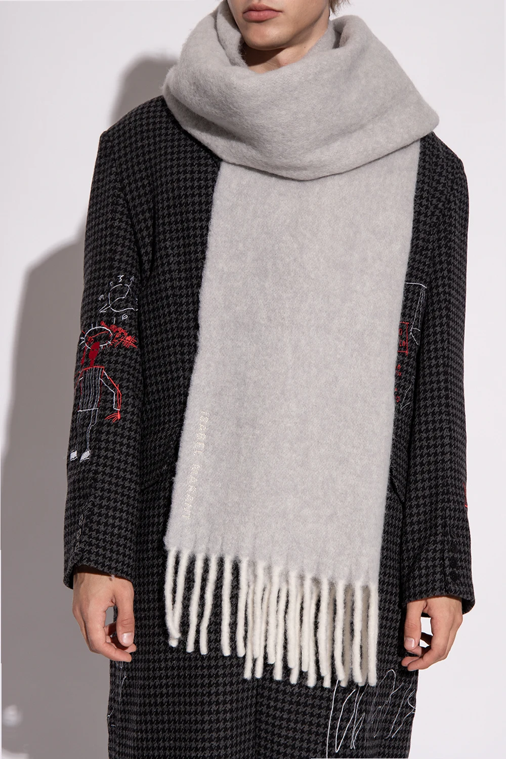Jasnoszary szal, model ‘Firna’ Isabel Marant. Wykonany z wełny z alpaki. Ozdobiony wyszytym logo. Dwa brzegi zakończone frędzlami.