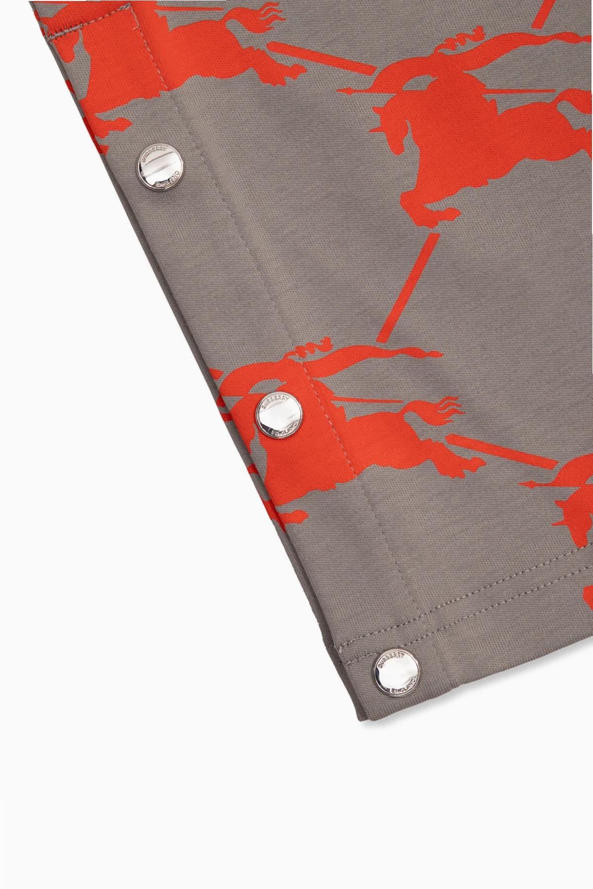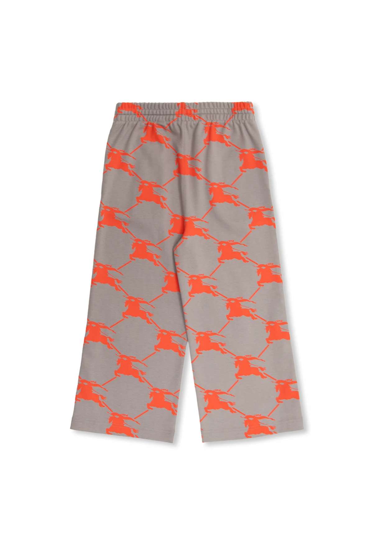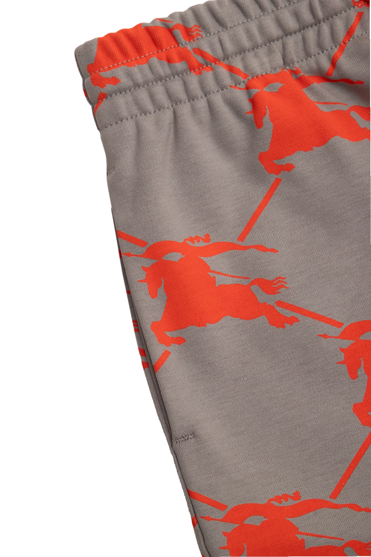 Szare spodnie dresowe , model ‘Rami’ Burberry Kids. Wykonane z bawełny. W pasie wszyta guma ściągana trokami. Ozdobione pomarańczowym wzorem z monogramem. Dwie wsuwane kieszenie. Długie nogawki o prostym kroju z zapięciem na zatrzaski po bokach.