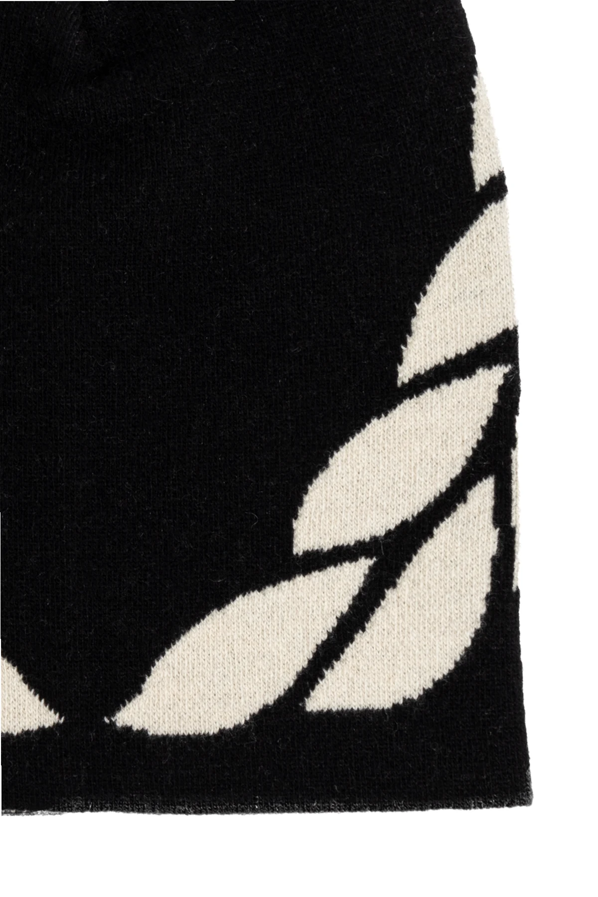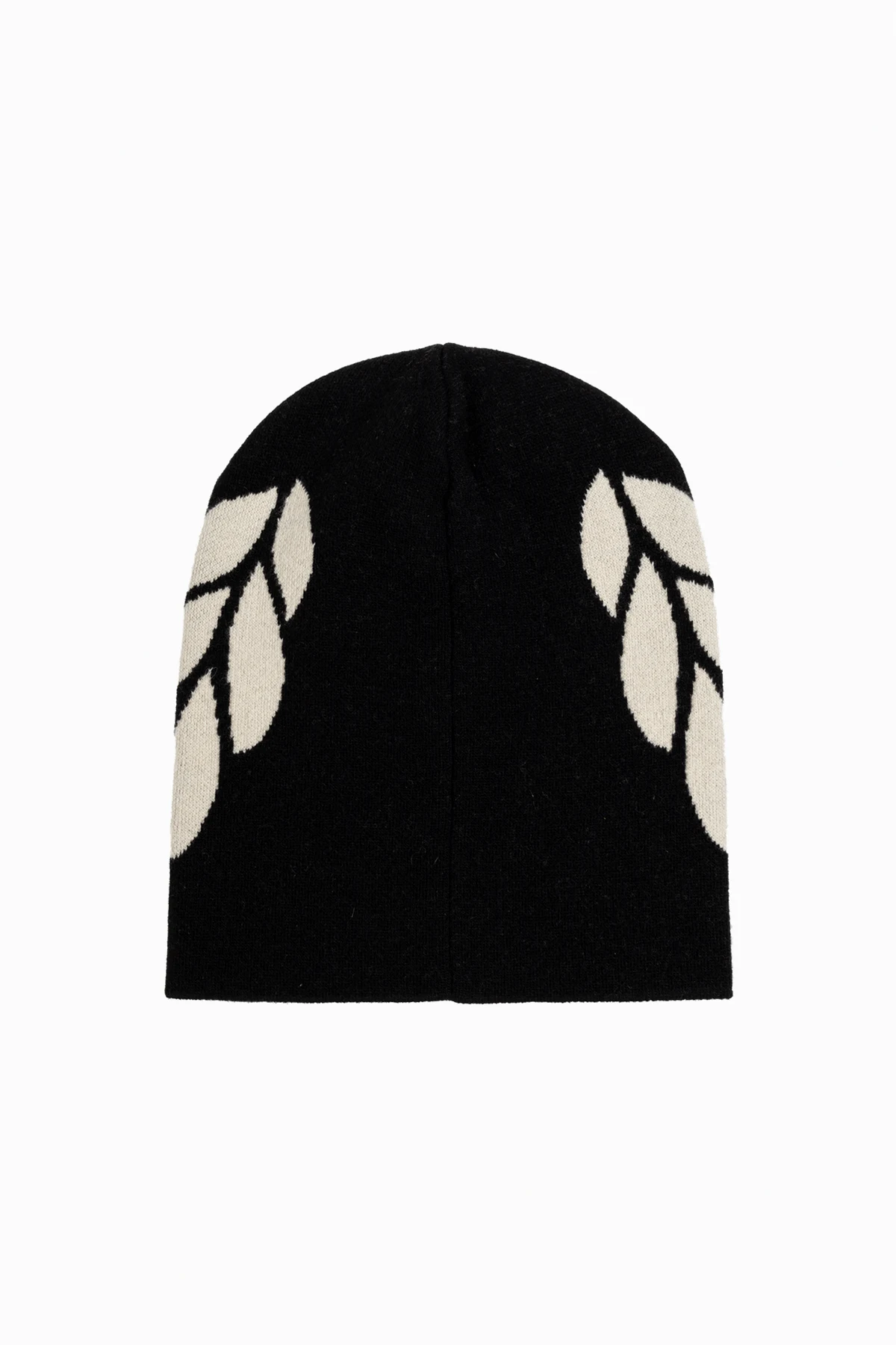 Wykonana z mieszanki najwyższej jakości materiałów – wełny, kaszmiru, poliamidu oraz elastanu, zapewnia wyjątkowy komfort i ciepło. Dominujący czarny kolor z kontrastującymi białymi liśćmi, które układają się w wieniec, nadaje czapce unikatowy charakter.