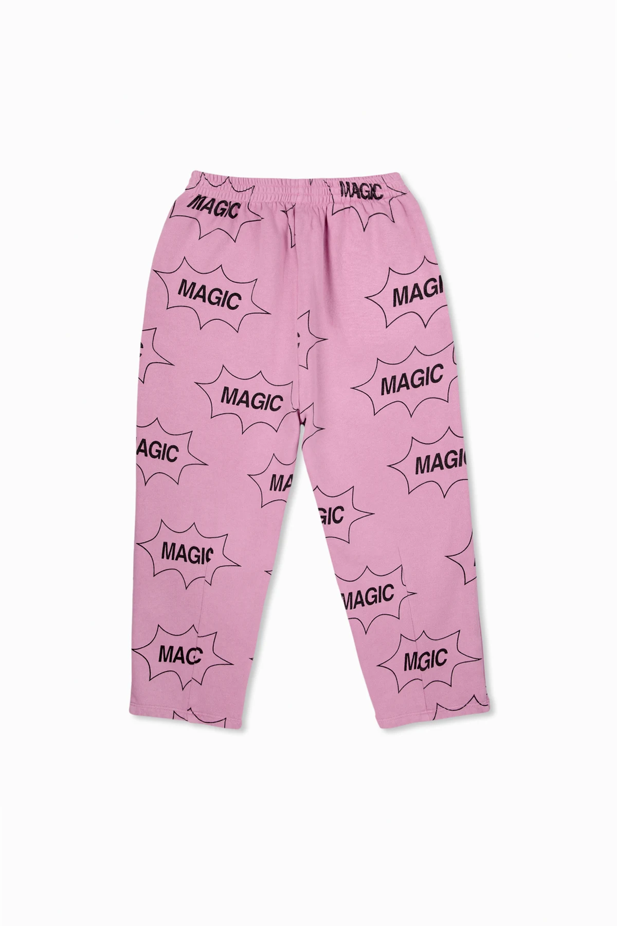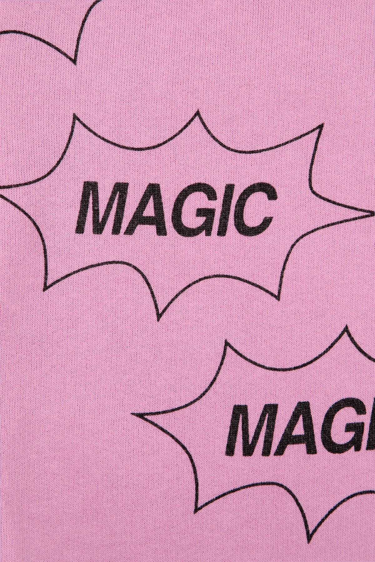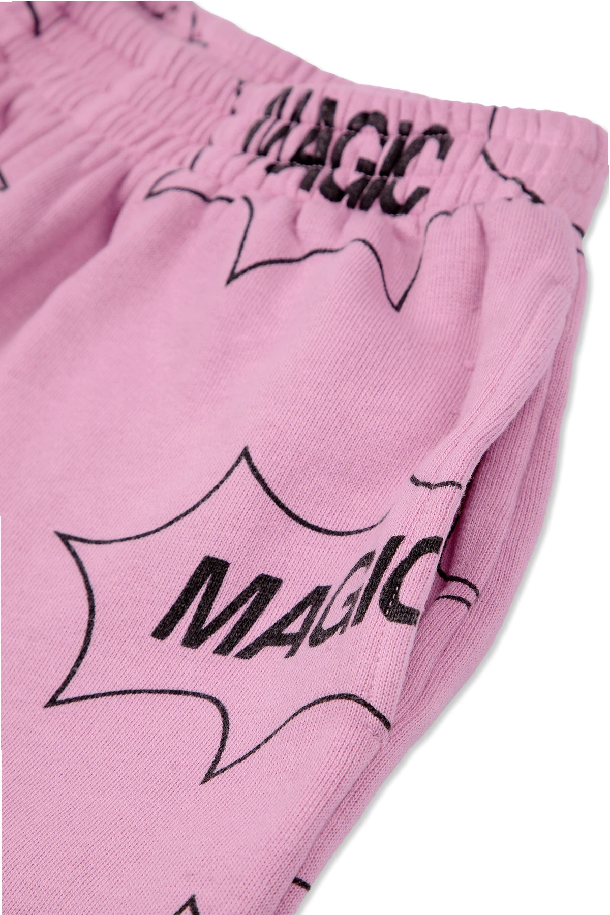 Spodnie wykonane są z 100% bawełny organicznej , co gwarantuje ich miękkość i elastyczność, typową dla najwyższej jakości odzieży dresowej. Dominujący jasnoróżowy kolor oraz wzór z czarnym napisem "MAGIC" w komiksowych dymkach nadają im nowoczesny i modny wygląd. Elastyczny pas w talii, również zdobiony napisem "MAGIC", dodaje spodniom dodatkowego charakteru i zapewnia komfort noszenia.