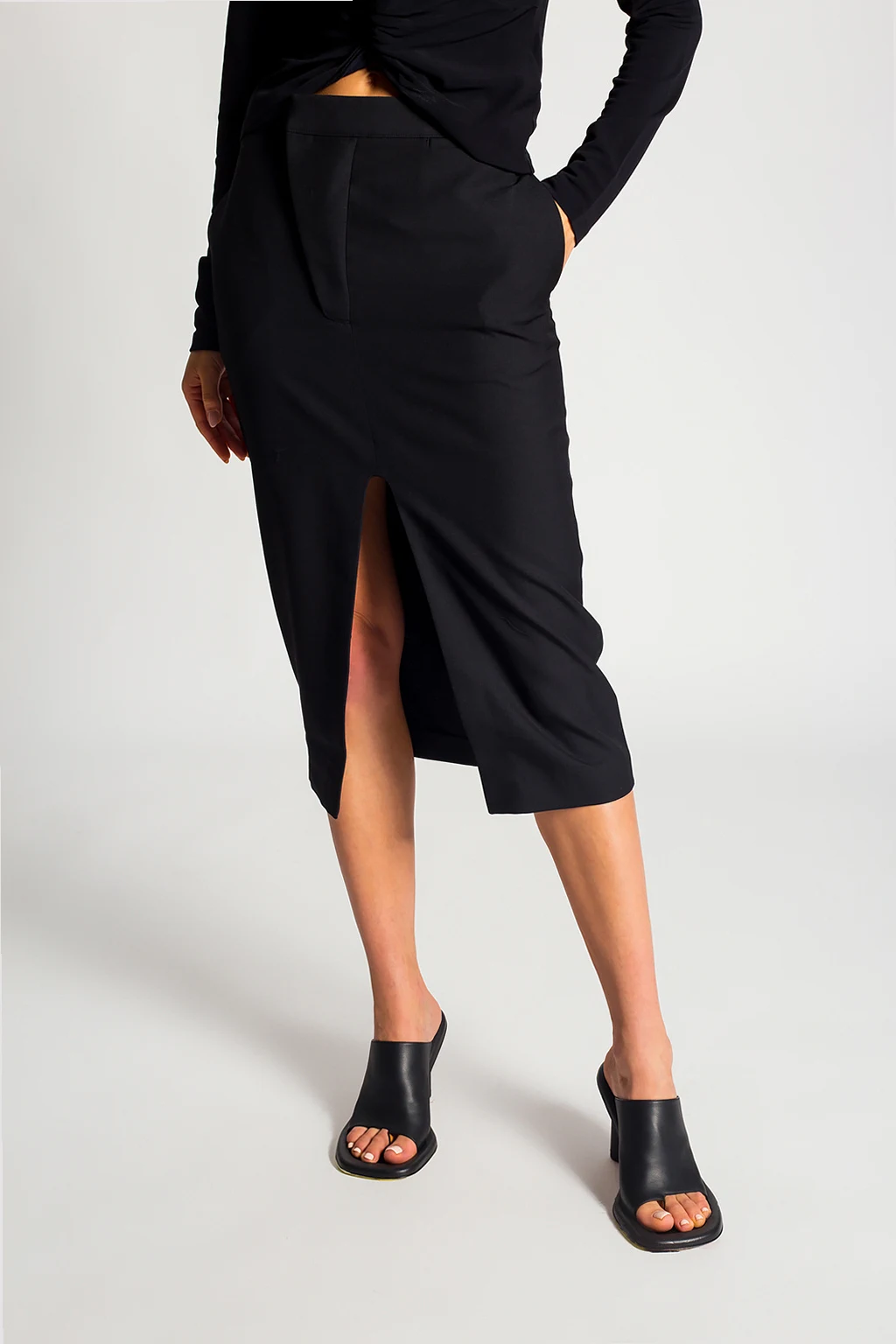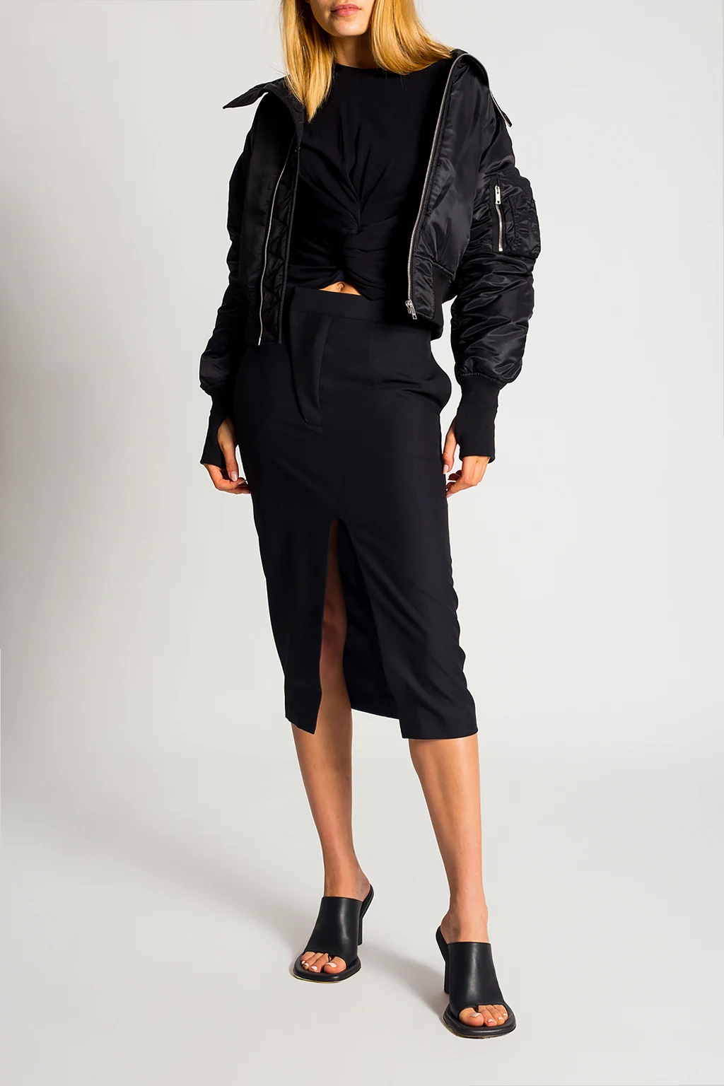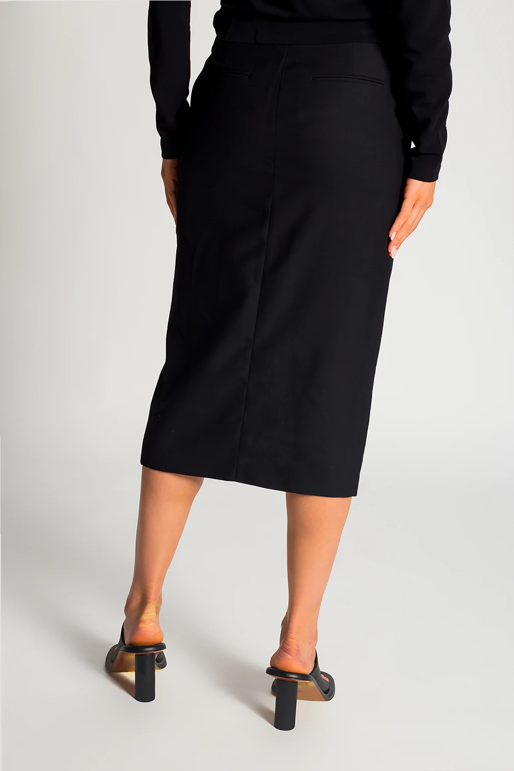 Czarna, wełniana spódnica z rozcięciem z przodu Ambush. Zapinana z przodu na zamek i zatrzaski. Trzy kieszenie, jedna z przodu i dwie z tyłu.