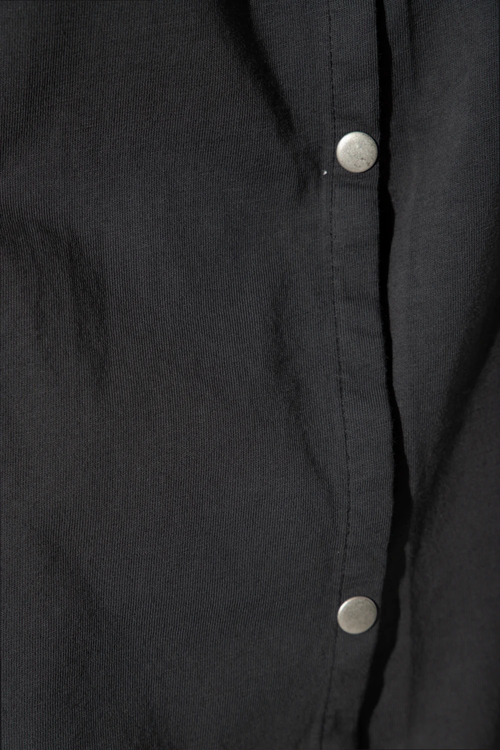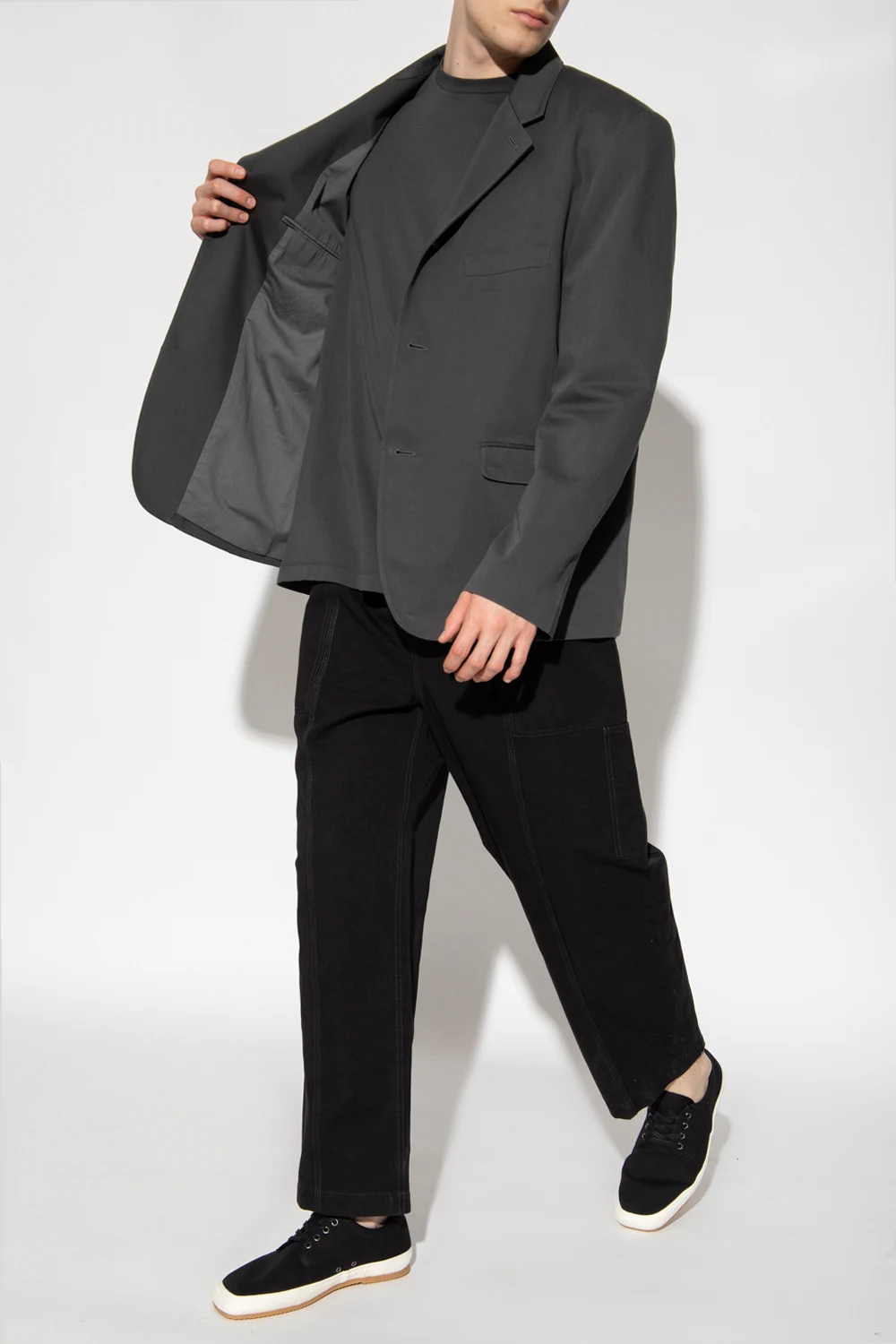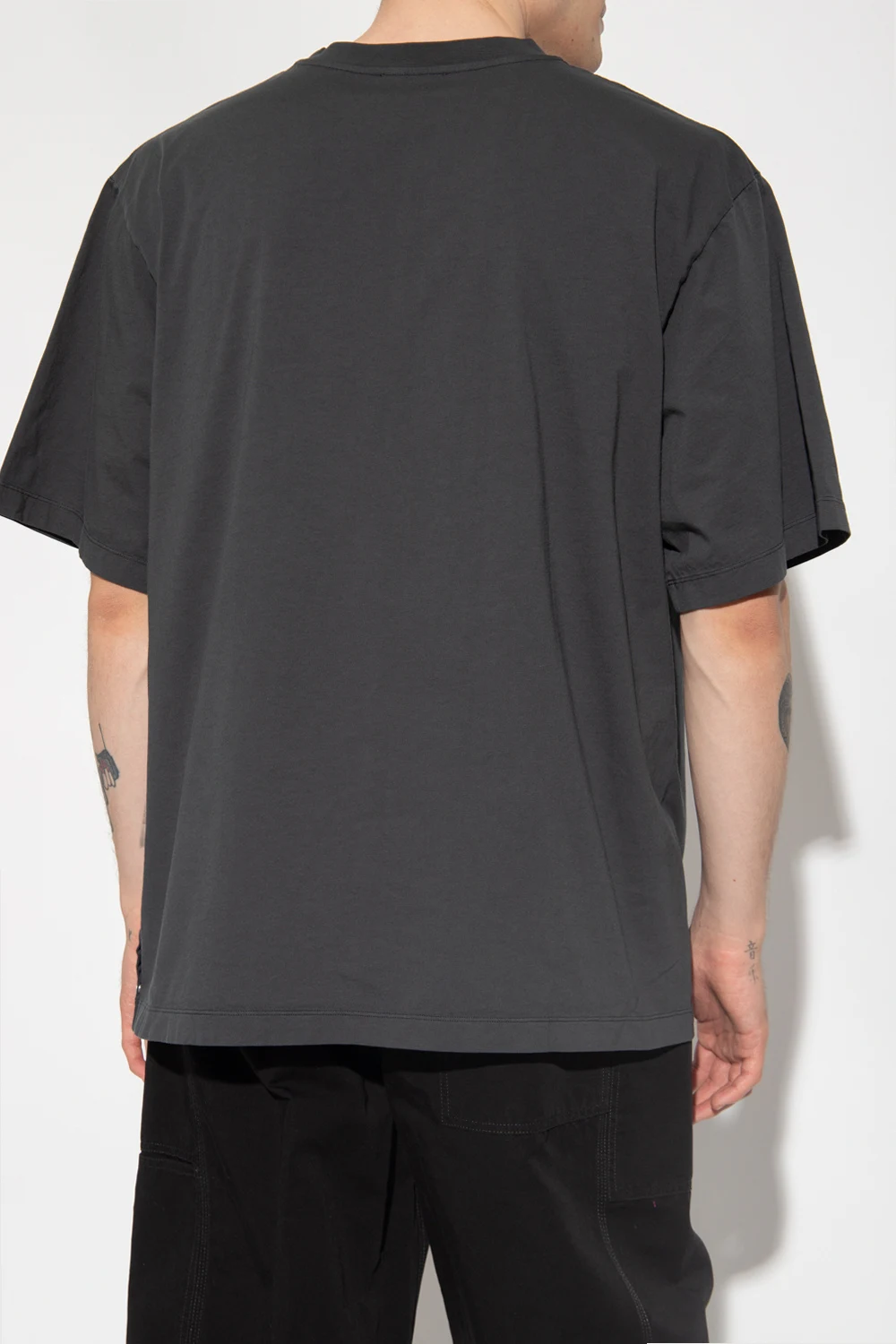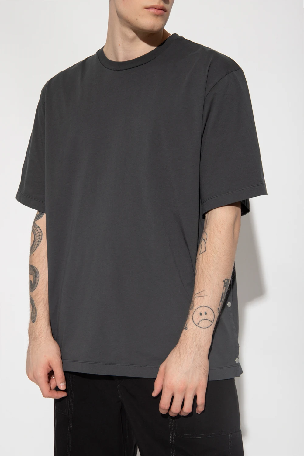 Ciemnoszary, bawełniany t-shirt Lemaire. Luźny krój, z boku zapinany na listwę z zatrzaskami. Okrągły dekolt zakończony ściągaczem, krótkie rękawy.
