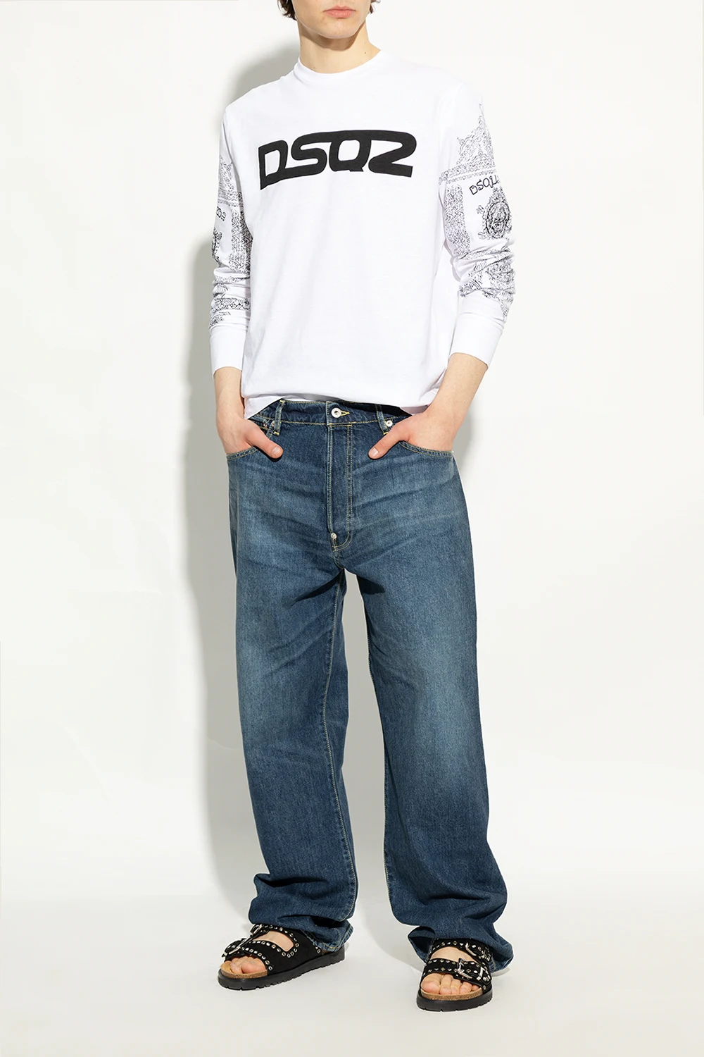 Czarne, zamszowe klapki Dsquared2. Zapinane na regulowane paski z klamrą. Ozdobione metalowymi ćwiekami w kolorze srebrnym. Z boku wytłoczone logo. Czarna, gumowa podeszwa.