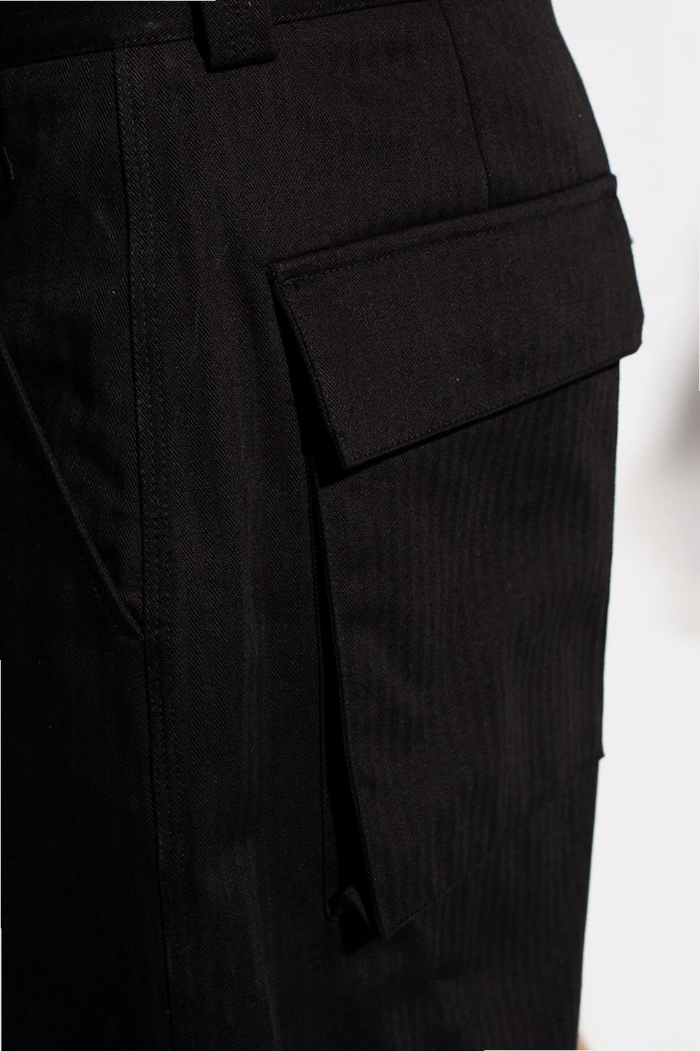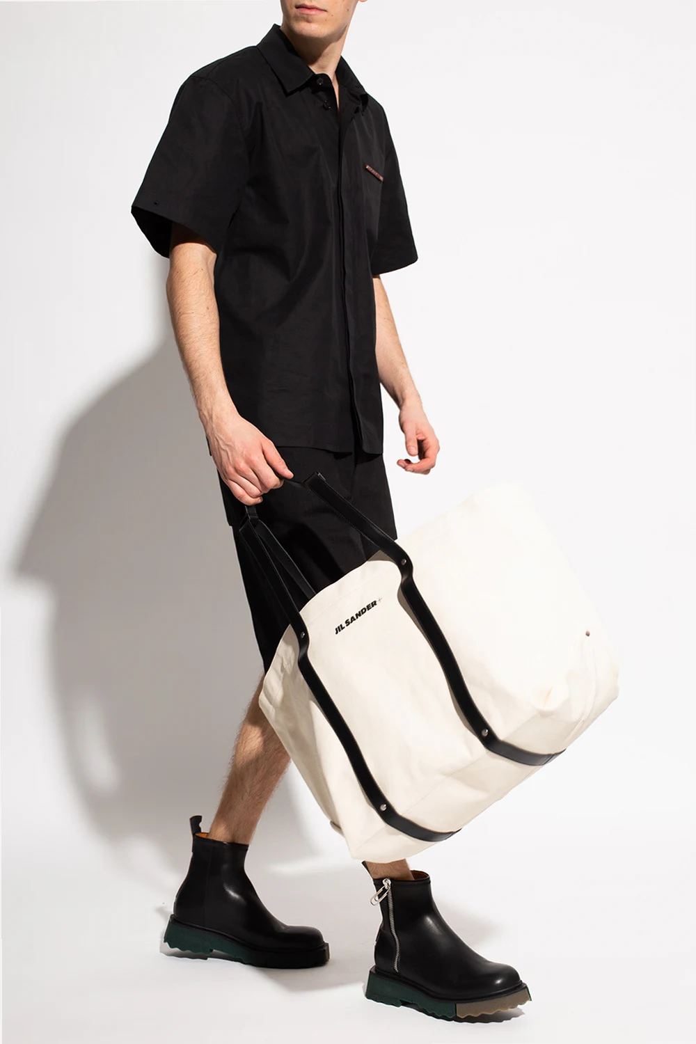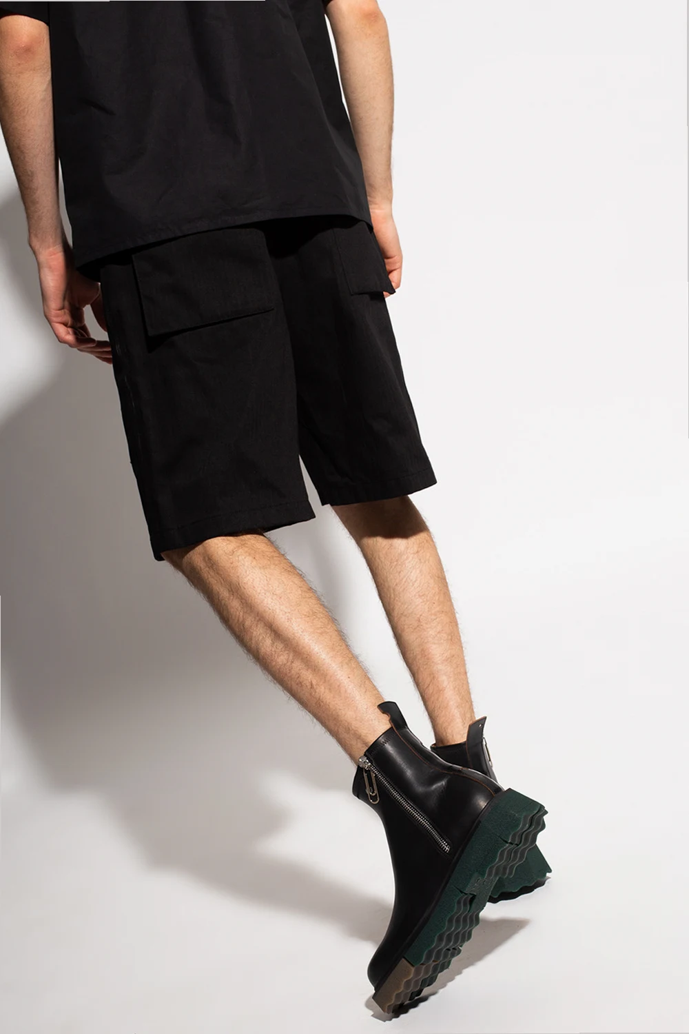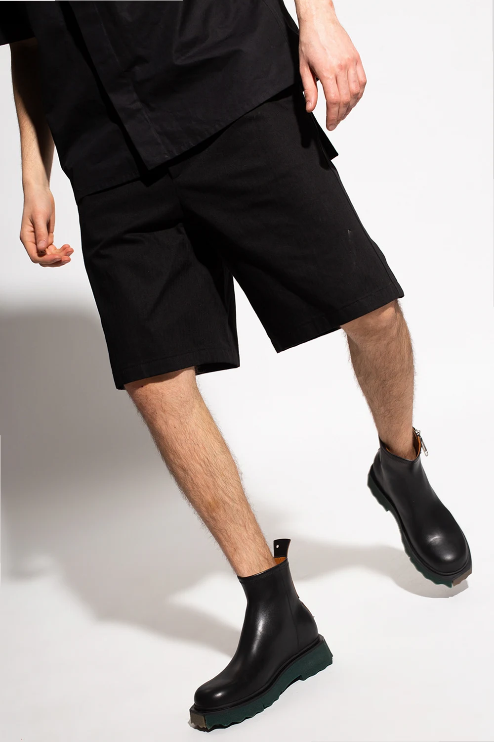 Czarne, bawełniane szorty Jil Sander. Zapinane na zamek i na guzik. Ozdobione czarno-białą naszywką. Z przodu dwie wsuwane kieszenie i dwie kieszenie zapinane na guzik.