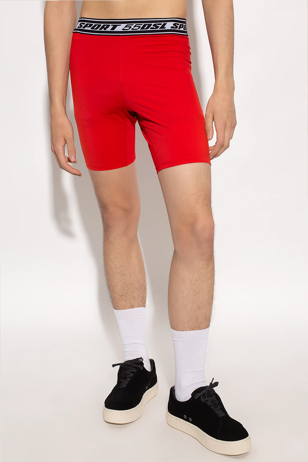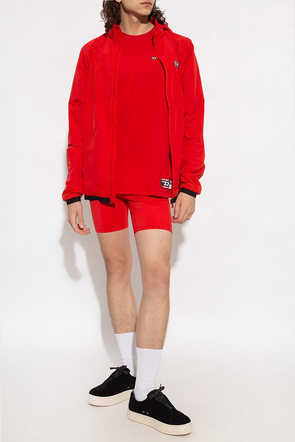 Czerwone, krótkie legginsy, model 'AMSB-SPRANT-WT18' Diesel, kolekcja ‘Sport 55DSL’. W pasie czarna guma z wyszytym białym logo. Nogawki ozdobione aplikacją z logo.