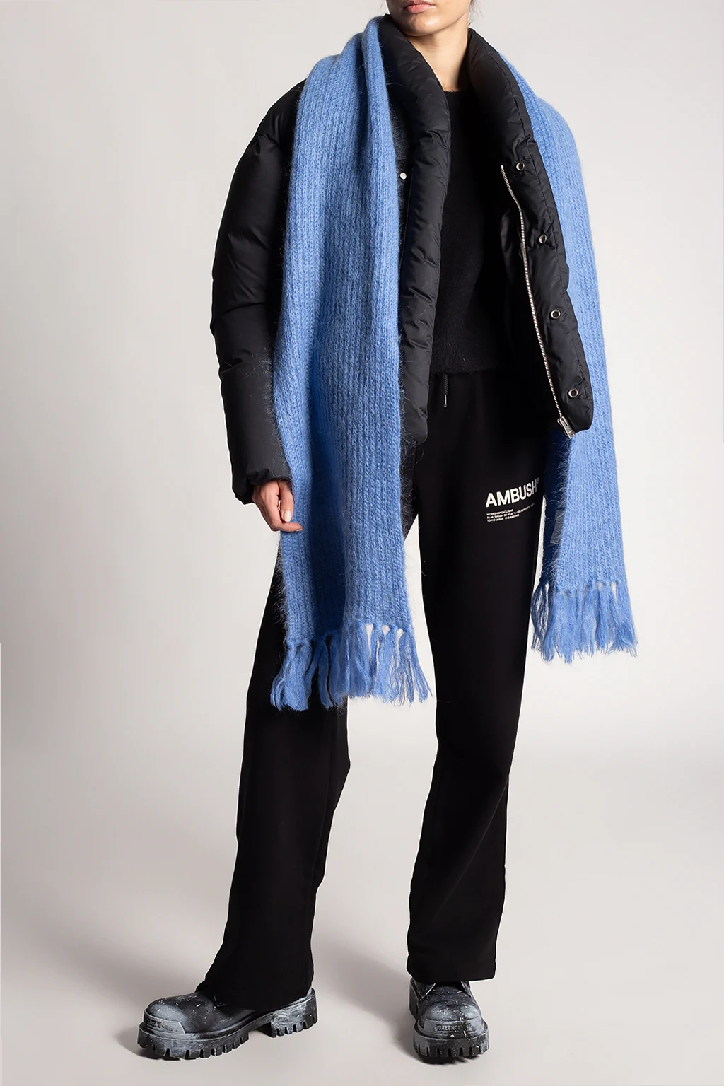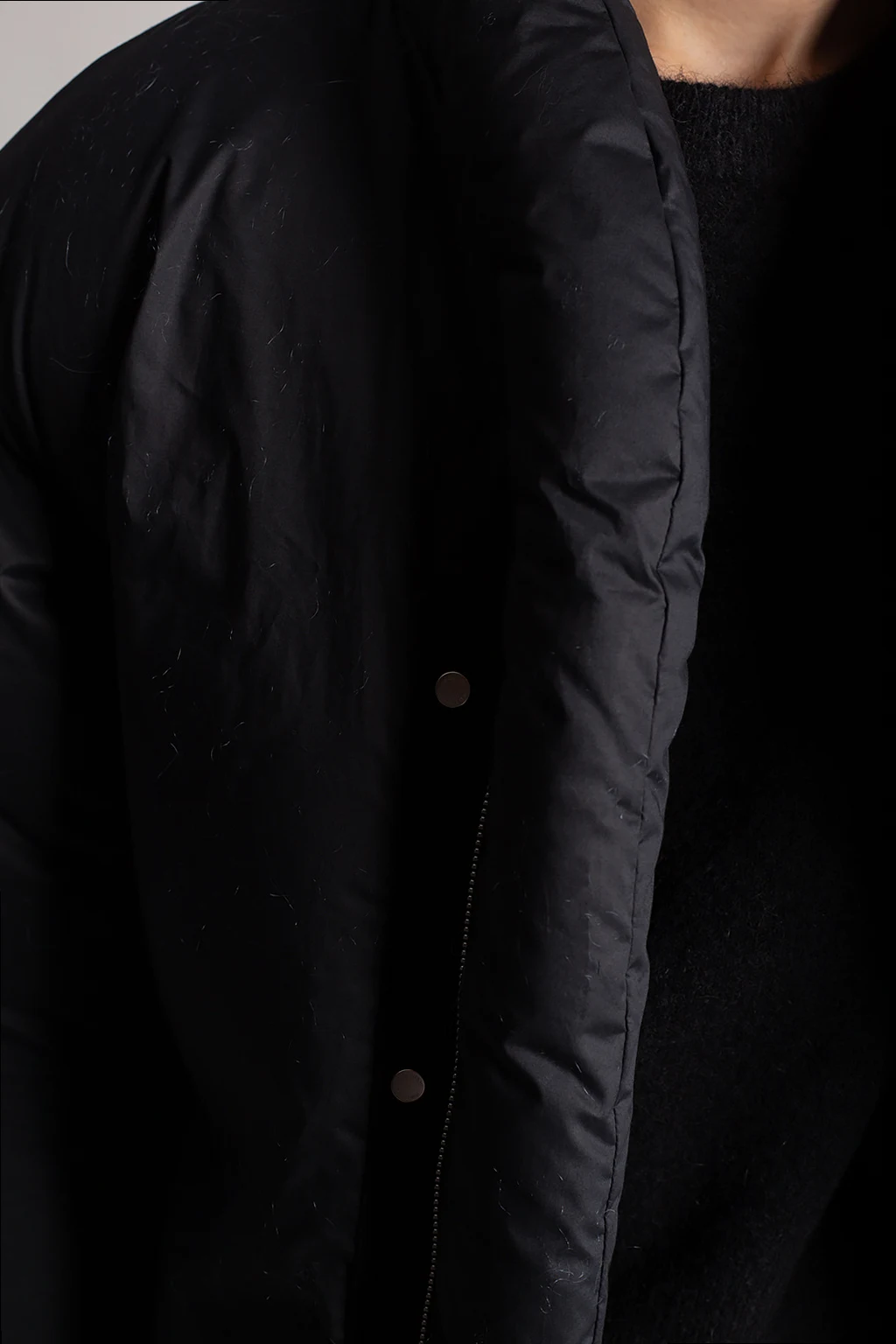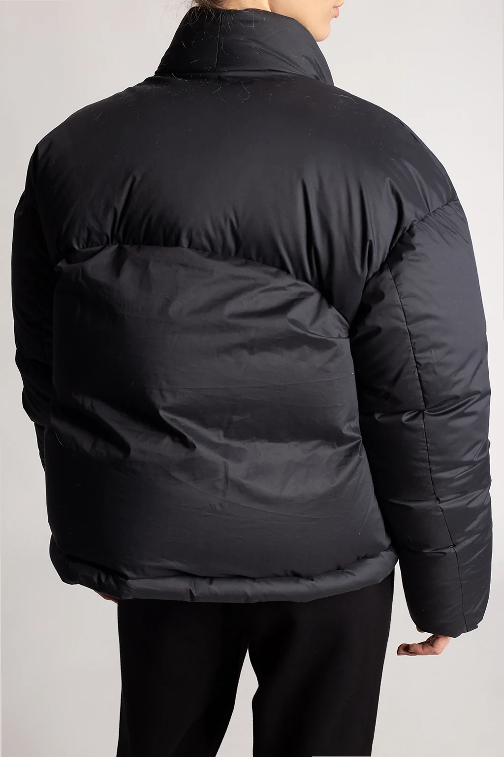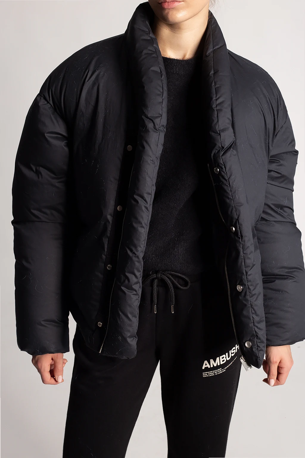 Czarna, bawełniana kurtka puchowa Ambush. Zapinana na zamek i zatrzaski. Ozdobiona naszywką z logo w kolorze czarno-białym. Z przodu dwie kieszenie zapinane na zamki. Długie rękawy zakończone ściągaczami. Metalowe elementy w kolorze srebrnym.