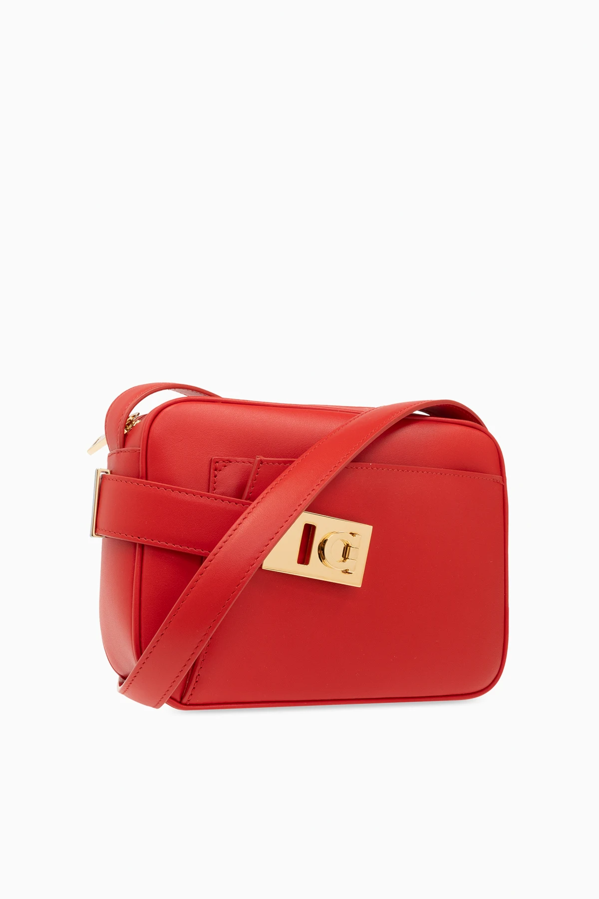 Prostokątny kształt z delikatnie zaokrąglonymi rogami oraz gładka tekstura podkreślają jej minimalistyczny, lecz elegancki charakter. Złote okucia, w tym zamek z kultowym logo 'Gancini', dodają blasku i prestiżu, tworząc doskonały kontrast z matową powierzchnią torby. Wyposażona w długi, płaski, regulowany pasek, torba oferuje wygodę i wszechstronność noszenia, zarówno przez ramię, jak i na skos.