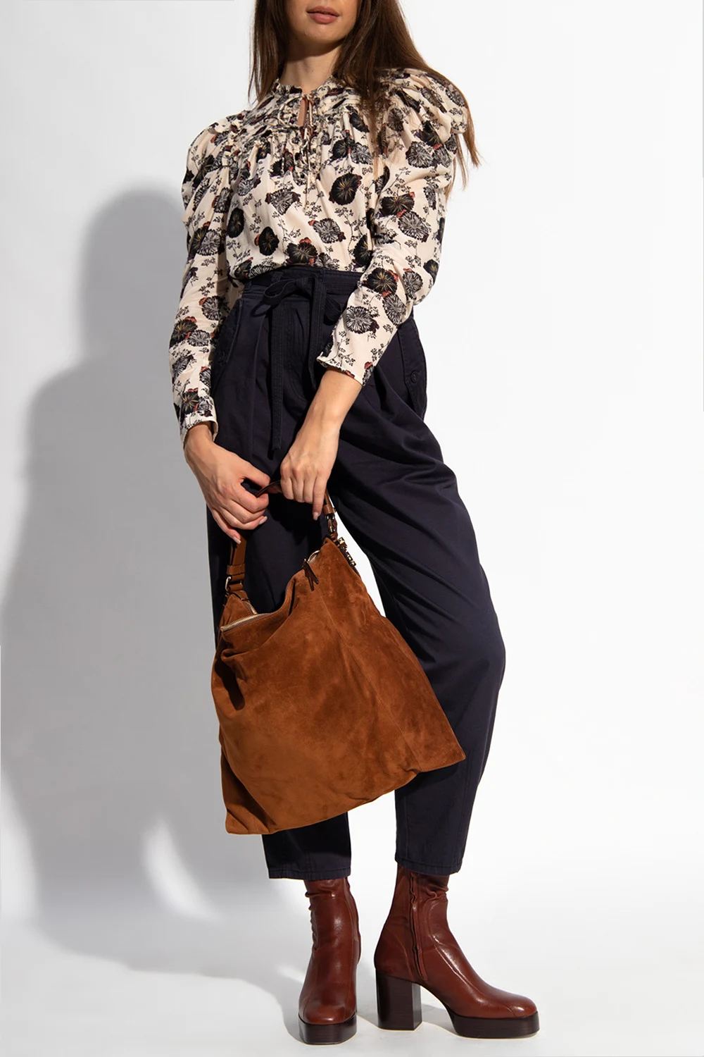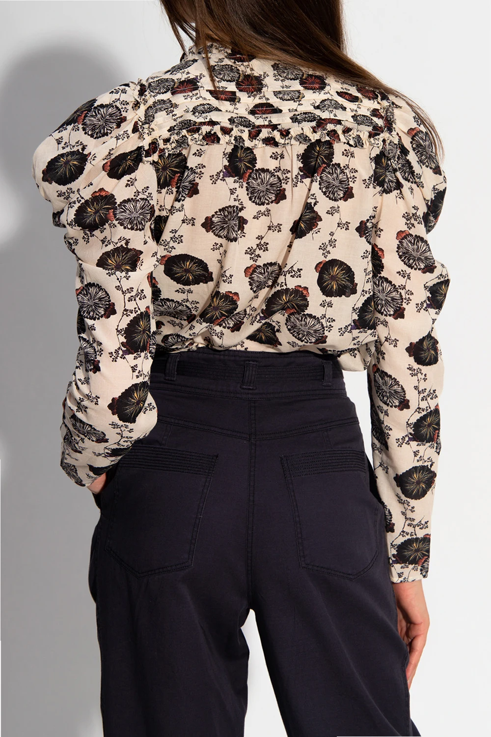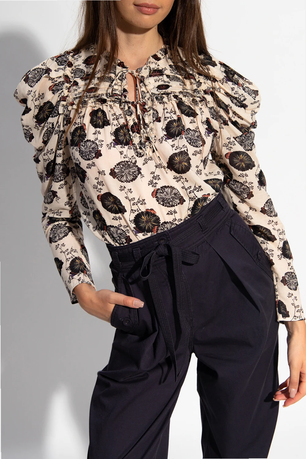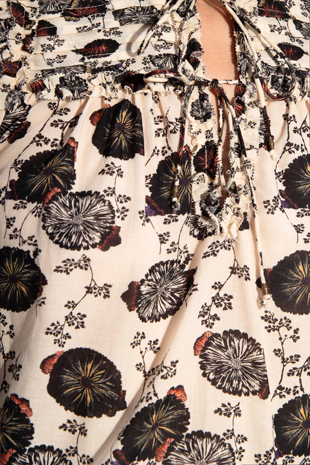 Kremowy top Ulla Johnson. Ozdobiony kolorowym nadrukiem z motywem kwiatowym. Dekoracyjne falbany. Okrągły dekolt z rozcięciem wiązanym trokami. Długie rękawy.