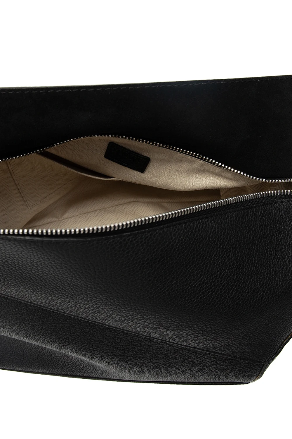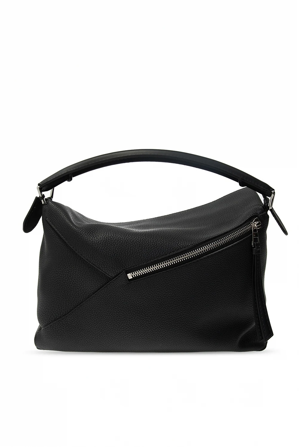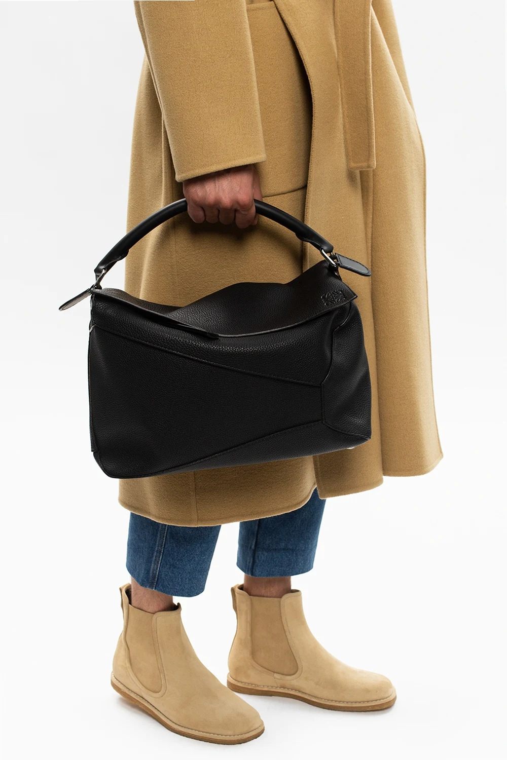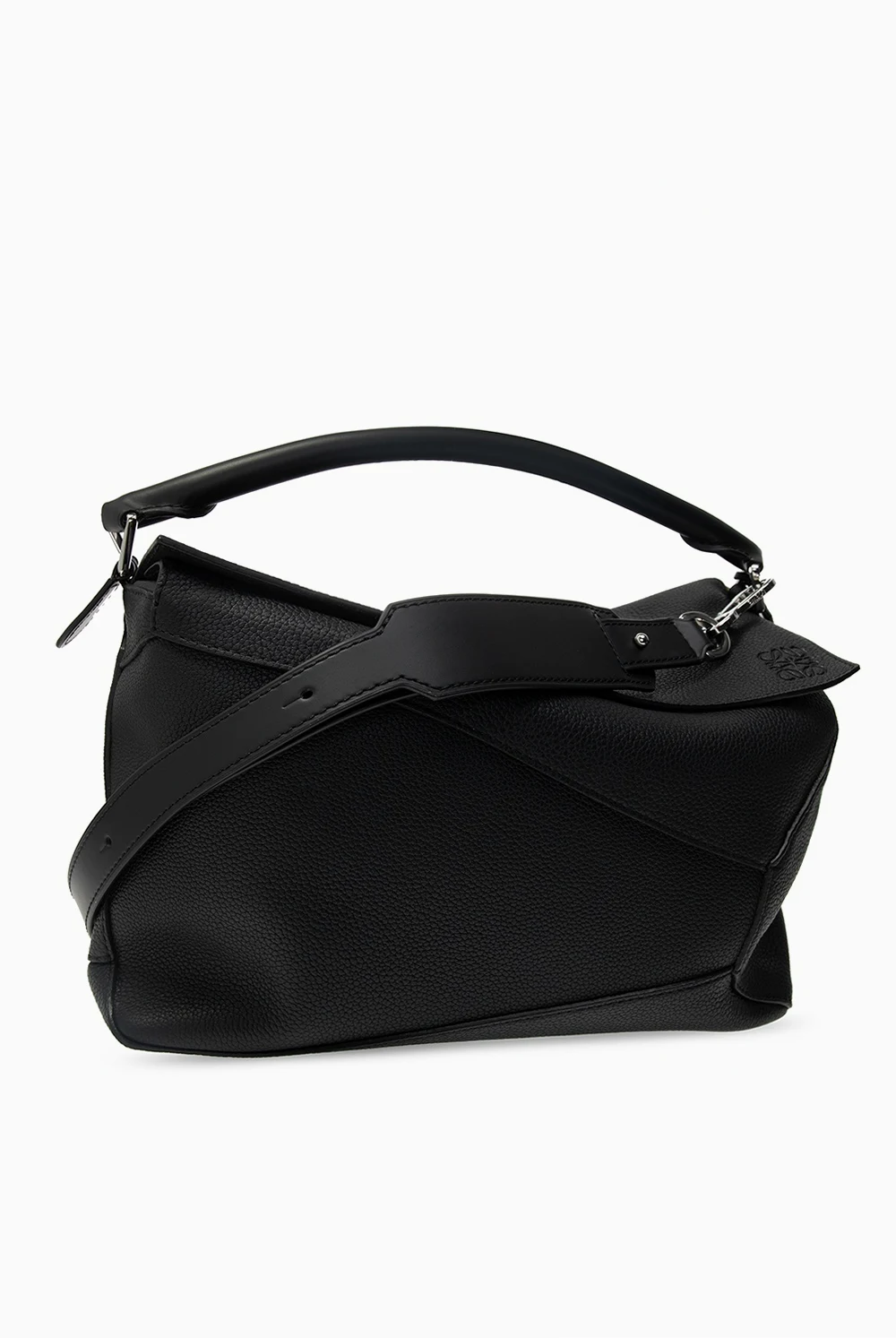 Czarna torba na ramię, model ‘Puzzle’ Loewe, rozmiar ‘large’. Wykonana z cielęcej skóry. Zamykana na zamek. Ozdobiona wytłoczonym logo. Z tyłu kieszeń zamykana na zamek. Półokrągła rączka. Odpinany, regulowany pasek. Wewnątrz komora i dwie wsuwane kieszeni. Metalowe elementy w kolorze srebrnym.