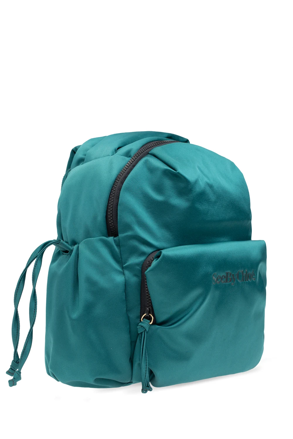Zielono-niebiesko-czarny plecak, model ‘Tilly’ See By Chloé. Zamykany na dwubiegunowy zamek. Ozdobiony wyszytym logo. Trzy kieszenie: jedna z przodu zapinana na zamek i po bokach kieszeń ściągana trokami. Półokrągła rączka. Regulowane szelki. Wewnątrz komora i wsuwana kieszeń.