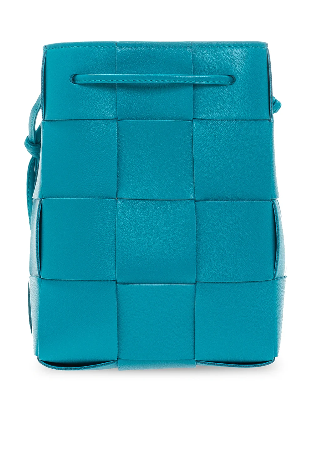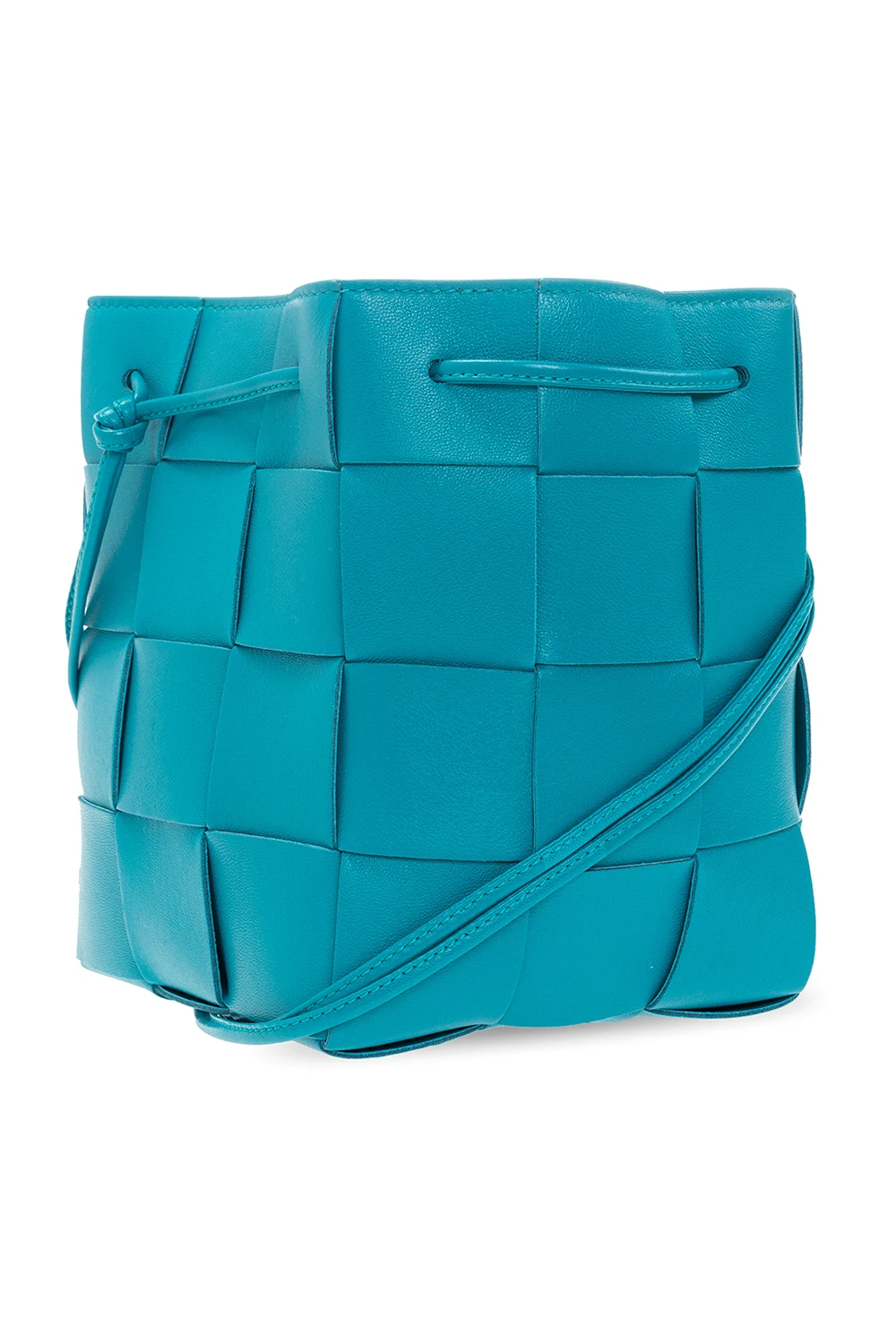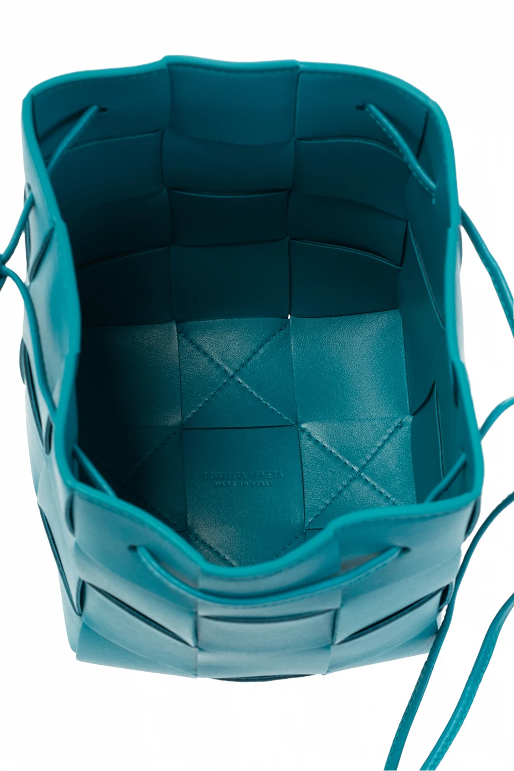 Niebiesko-zielona torba na ramię, model ‘Pouch’ Bottega Veneta. Ozdobiona charakterystyczną dla marki plecionką. Pas na ramię. Wewnątrz komora.