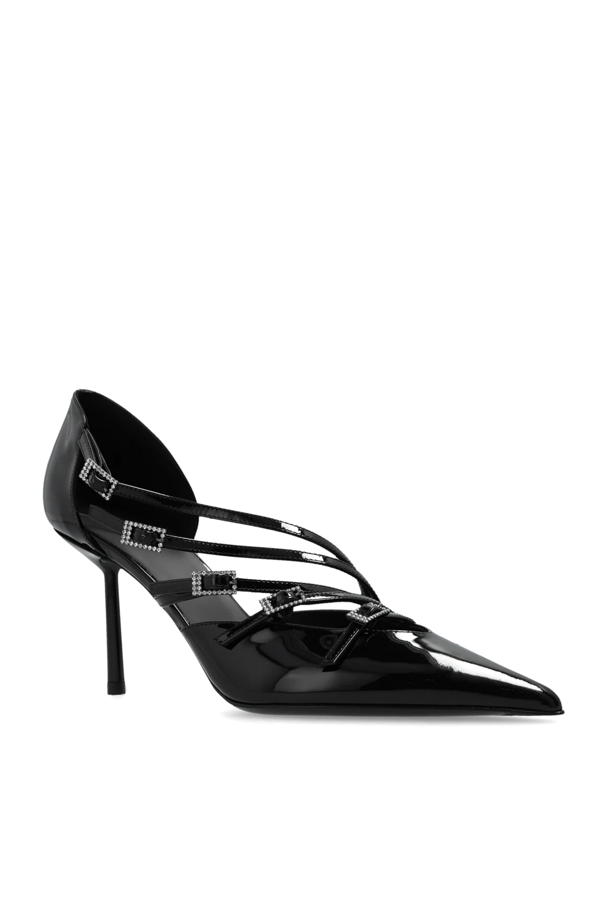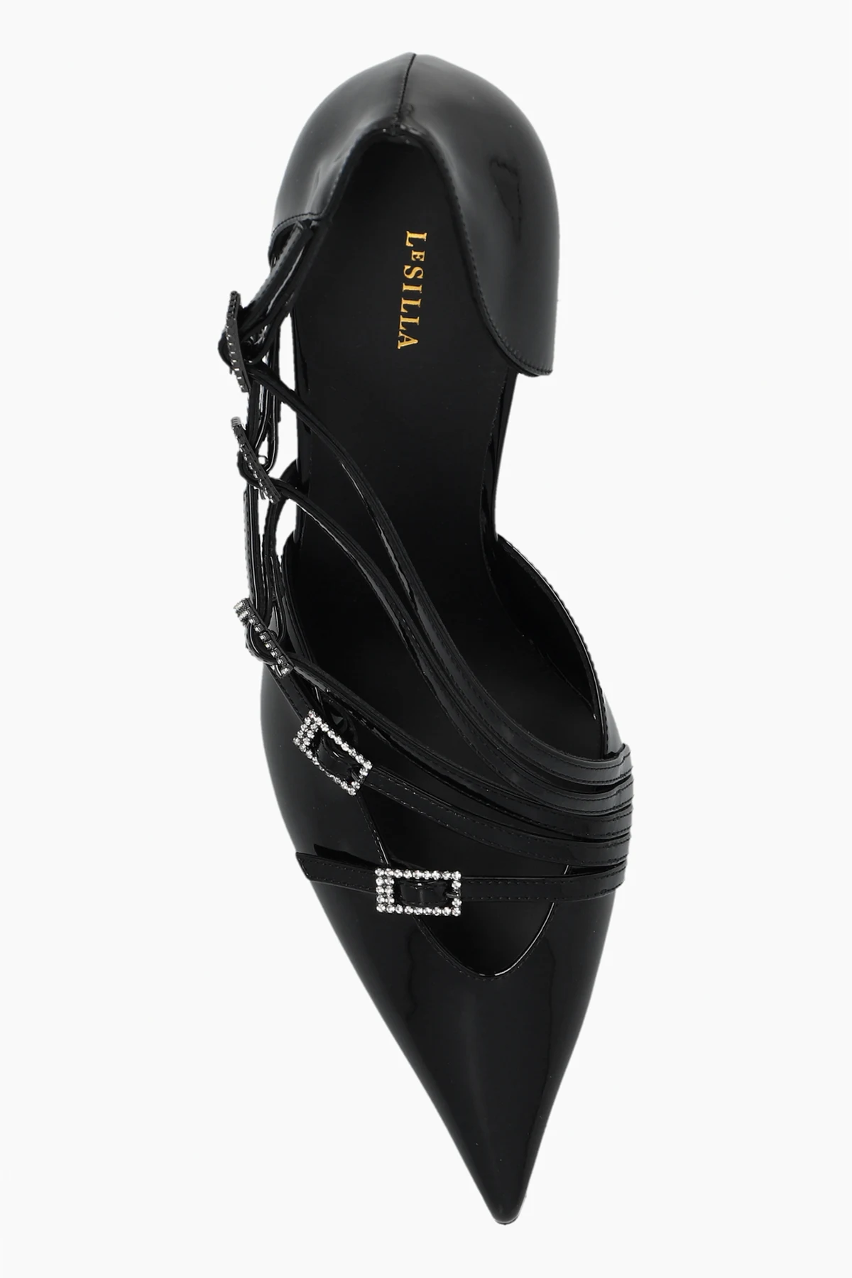 Buty posiadają kilka cienkich pasków, które krzyżują się na podbiciu stopy, ozdobionych klamrami z małymi, błyszczącymi kamieniami. Wnętrze buta wykończone jest czarną skórą, a na wkładce widnieje złoty napis "LE SILLA". Brak dodatkowych wzorów podkreśla ich elegancki charakter, czyniąc je idealnym wyborem na formalne okazje.