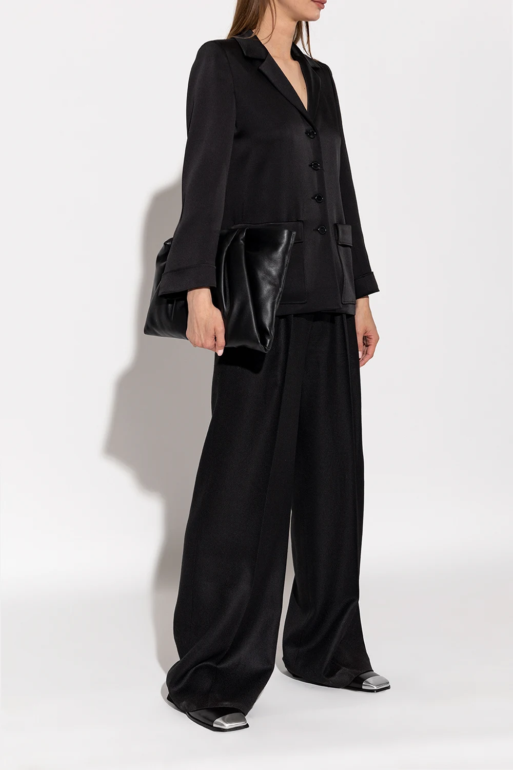 Czarne buty typu ‘loafers’, model ‘Lamiera’ Marsell. Wykonane z ręcznie malowanej skóry cielęcej. Kwadratowy nosek wykończony metalową aplikacją w kolorze srebrnym. Czarna, skórzana podeszwa wykończona gumą.
