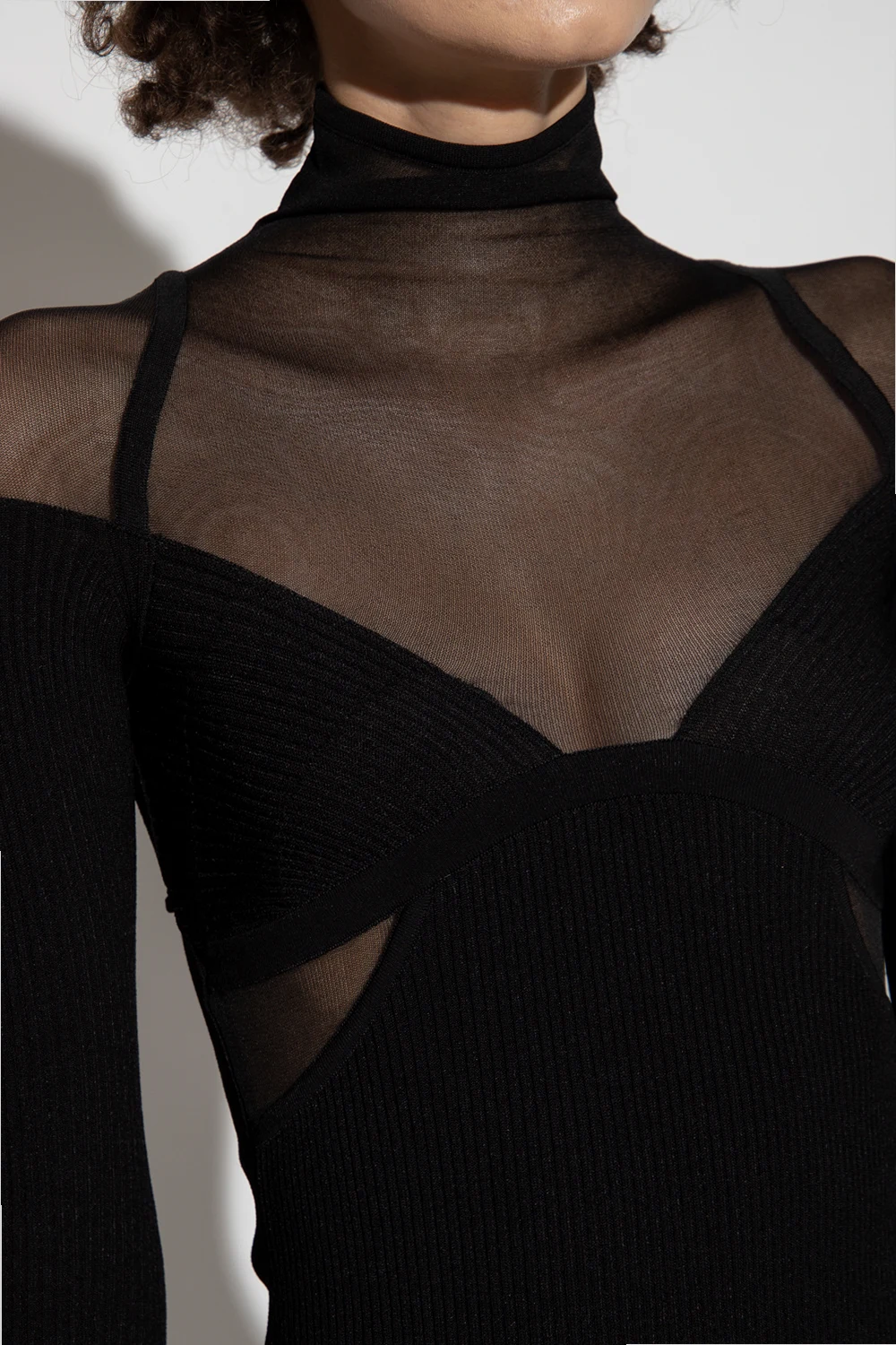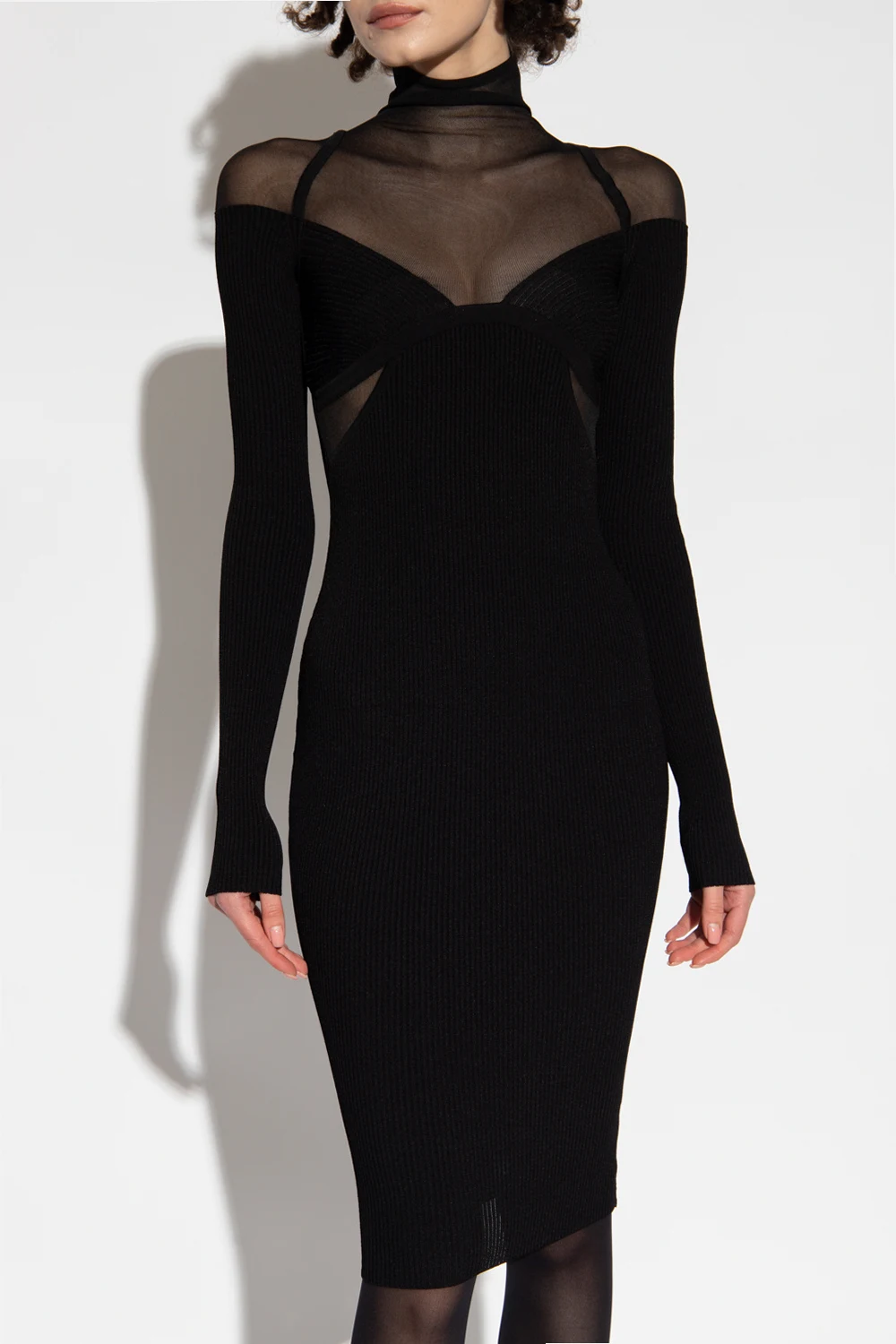 Czarna, prążkowana sukienka Nensi Dojaka. Zapinana z tyłu na kryty zamek. Dopasowany krój z dekoracyjnymi wycięciami. Transparentne wstawki oraz dekolt wykończony wysoką stójką. Długie rękawy.
