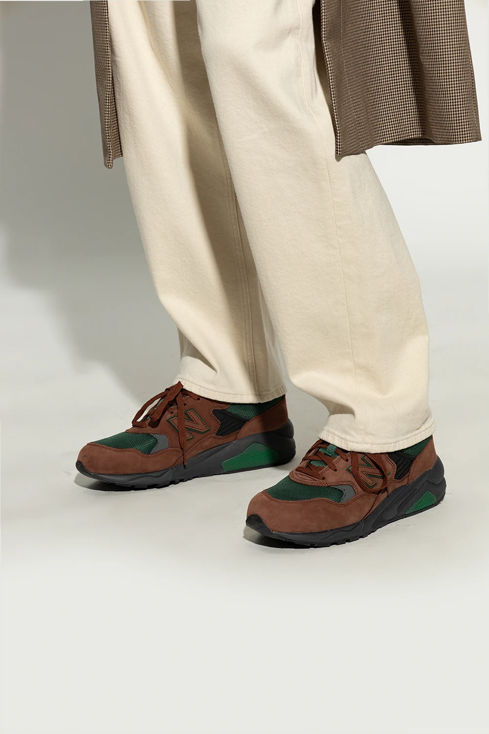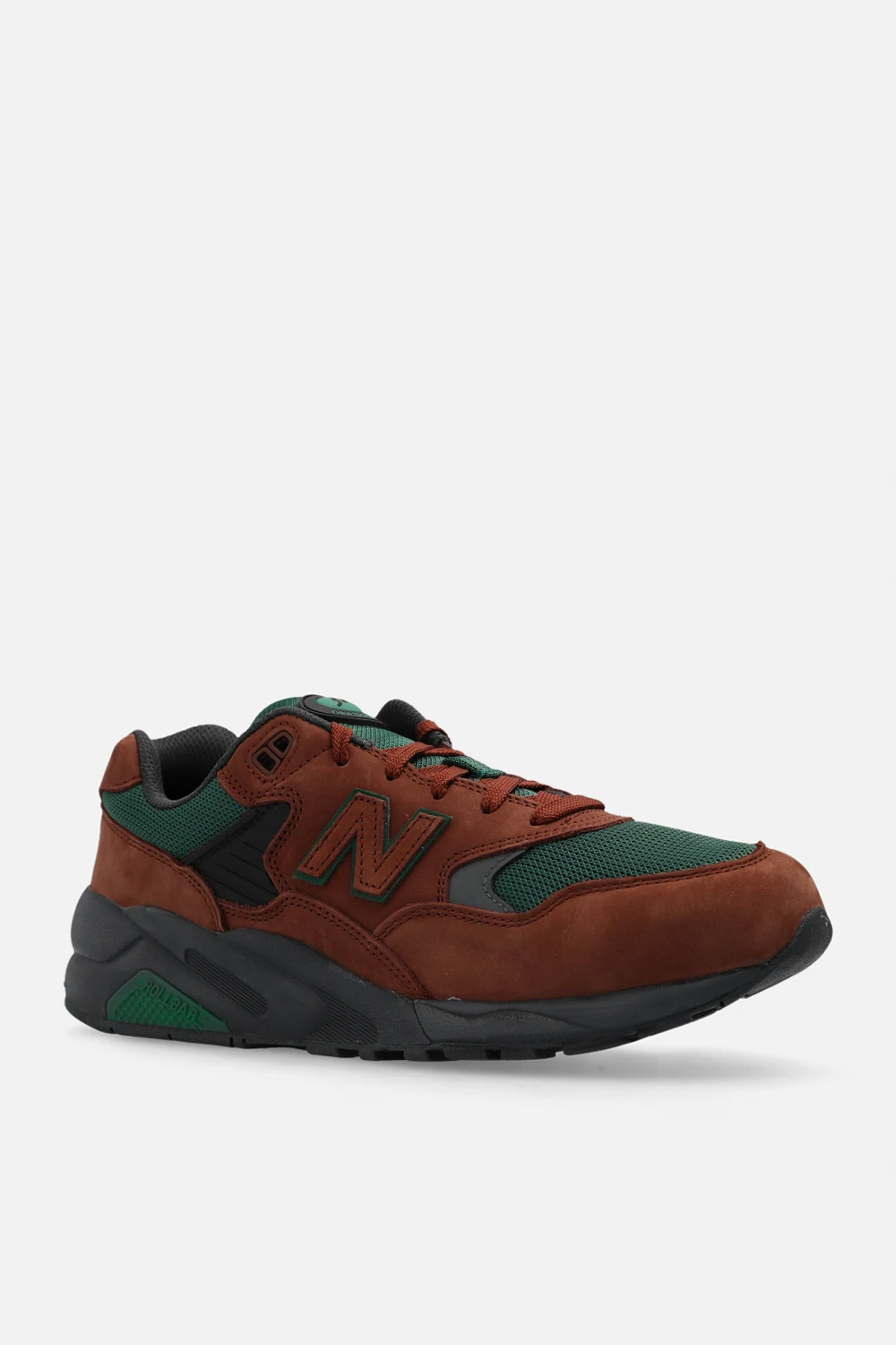 Brązowo-zielono-czarne, sznurowane buty sportowe, model ‘MT580RTB’ New Balance. Wykonane ze skóry i materiału. Ozdobione aplikacją z logo. Czarno-zielon a, gumowa podeszwa.