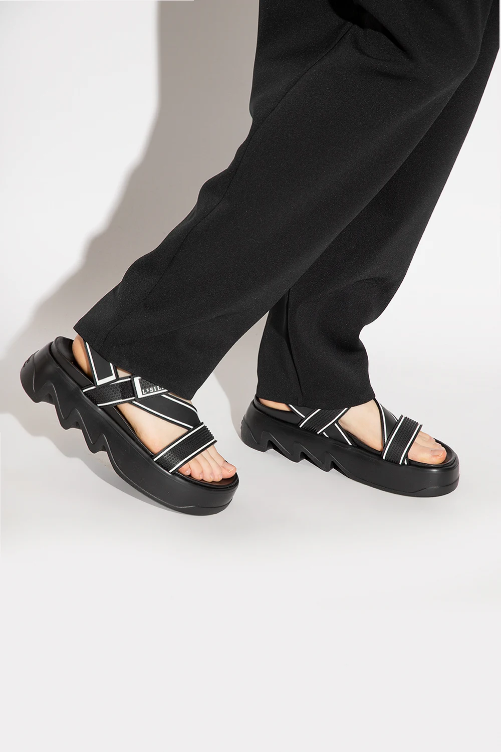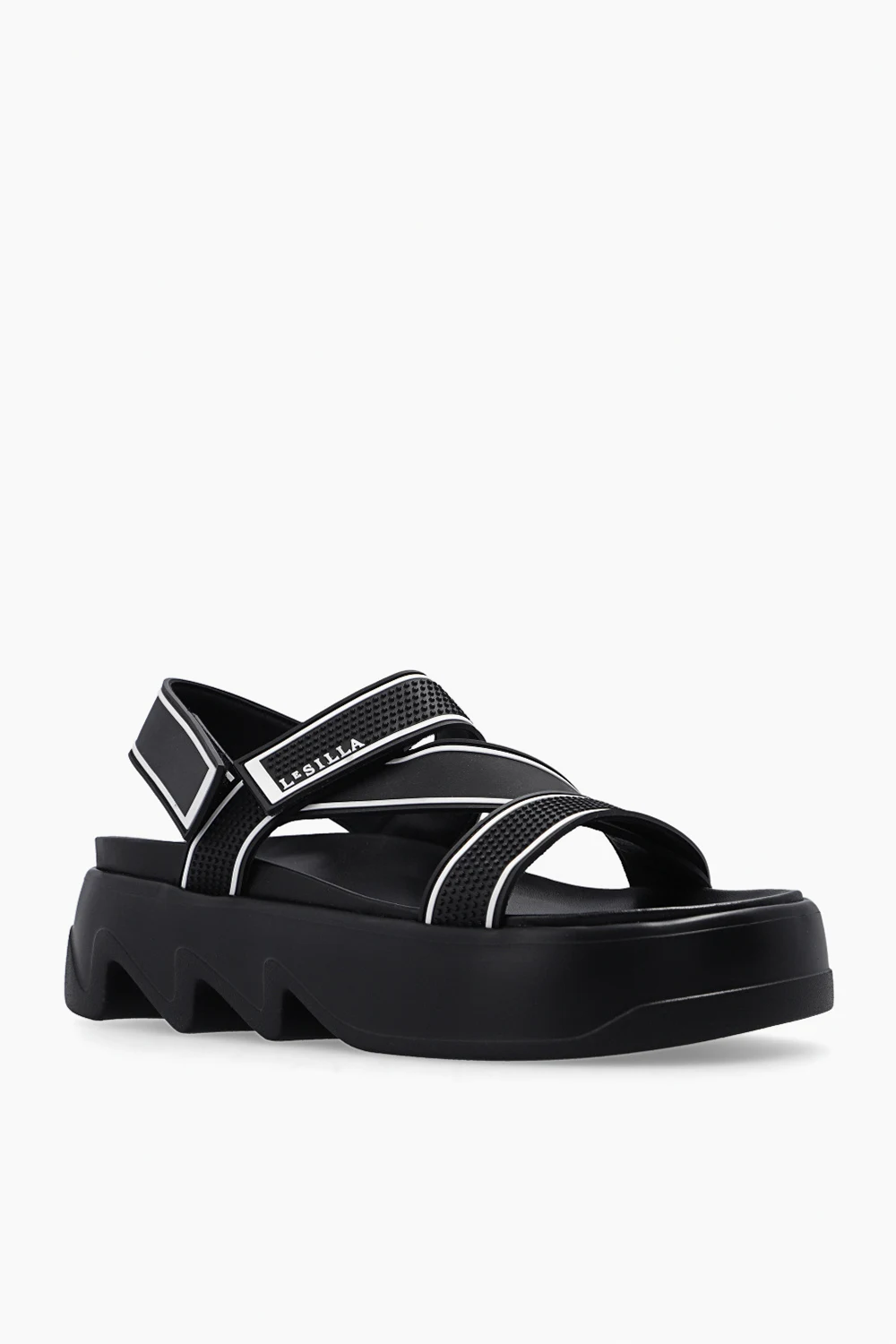 Czarne sandały na platformie Le Silla. Wykonane z gumowych pasków zapinanych na rzepy. Ozdobione białym logo oraz wypukłym wzorem. Czarna, gumowa podeszwa.