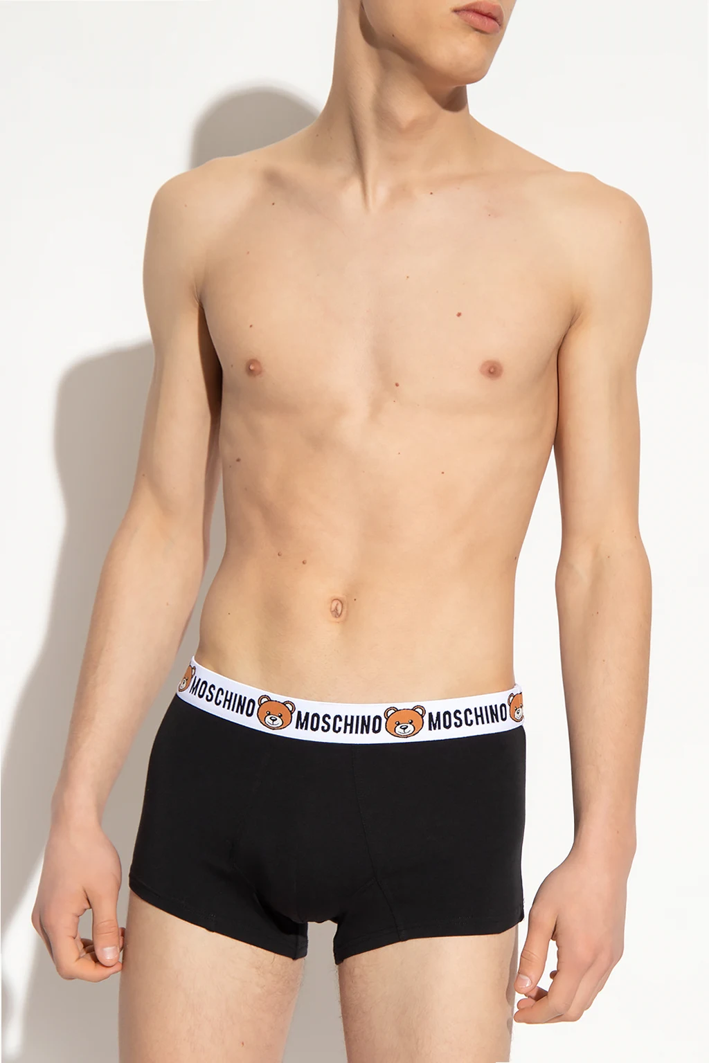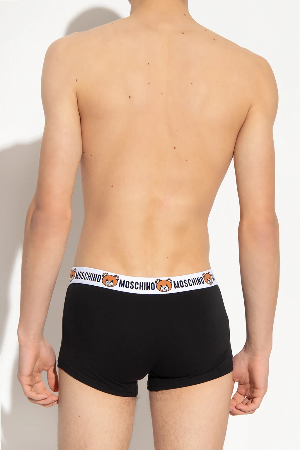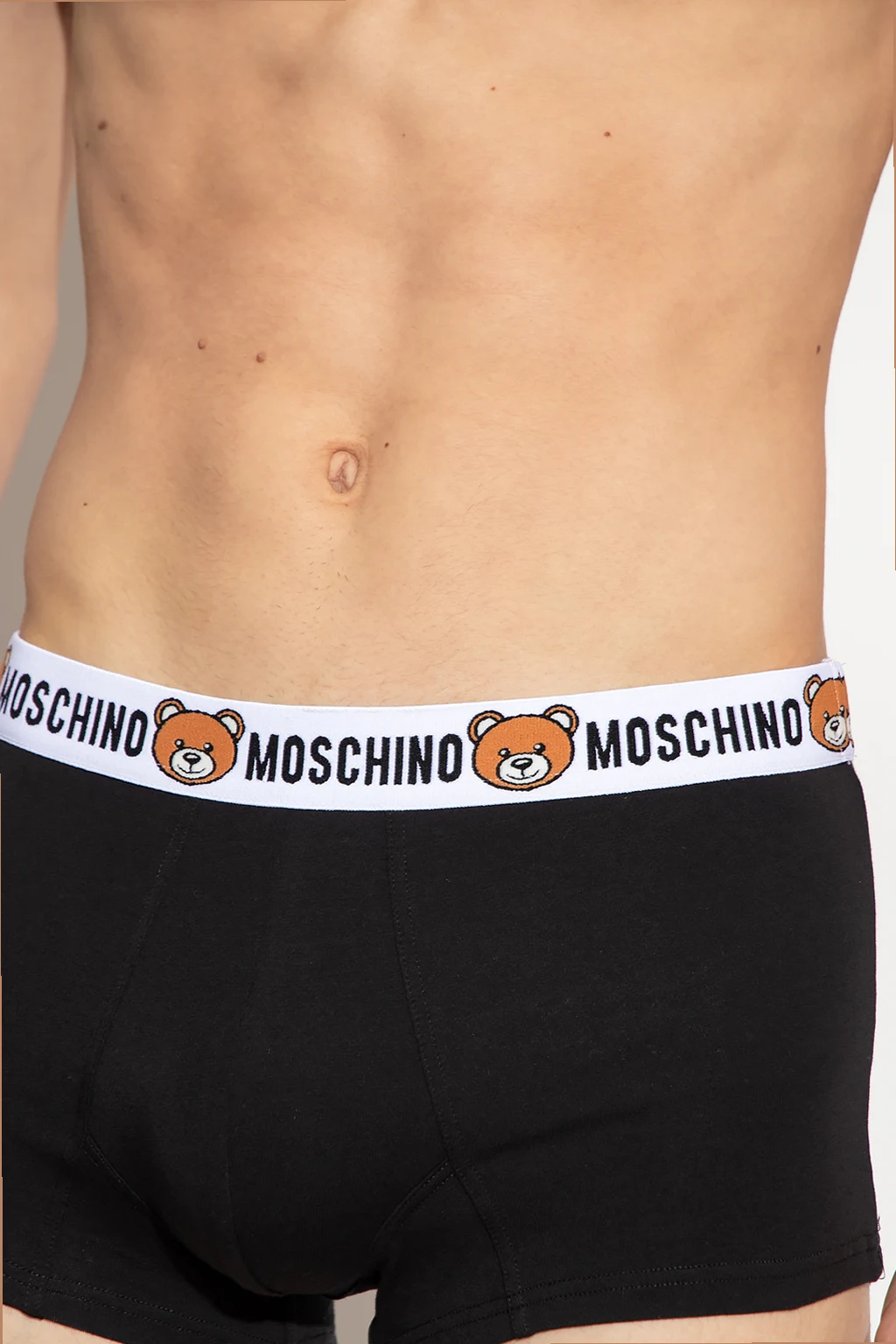 Czarny bawełniany dwupak bokserek Moschino. W pasie wszyta biała guma ozdobiona kolorowo wyszytym logo i charakterystycznym motywem misia.