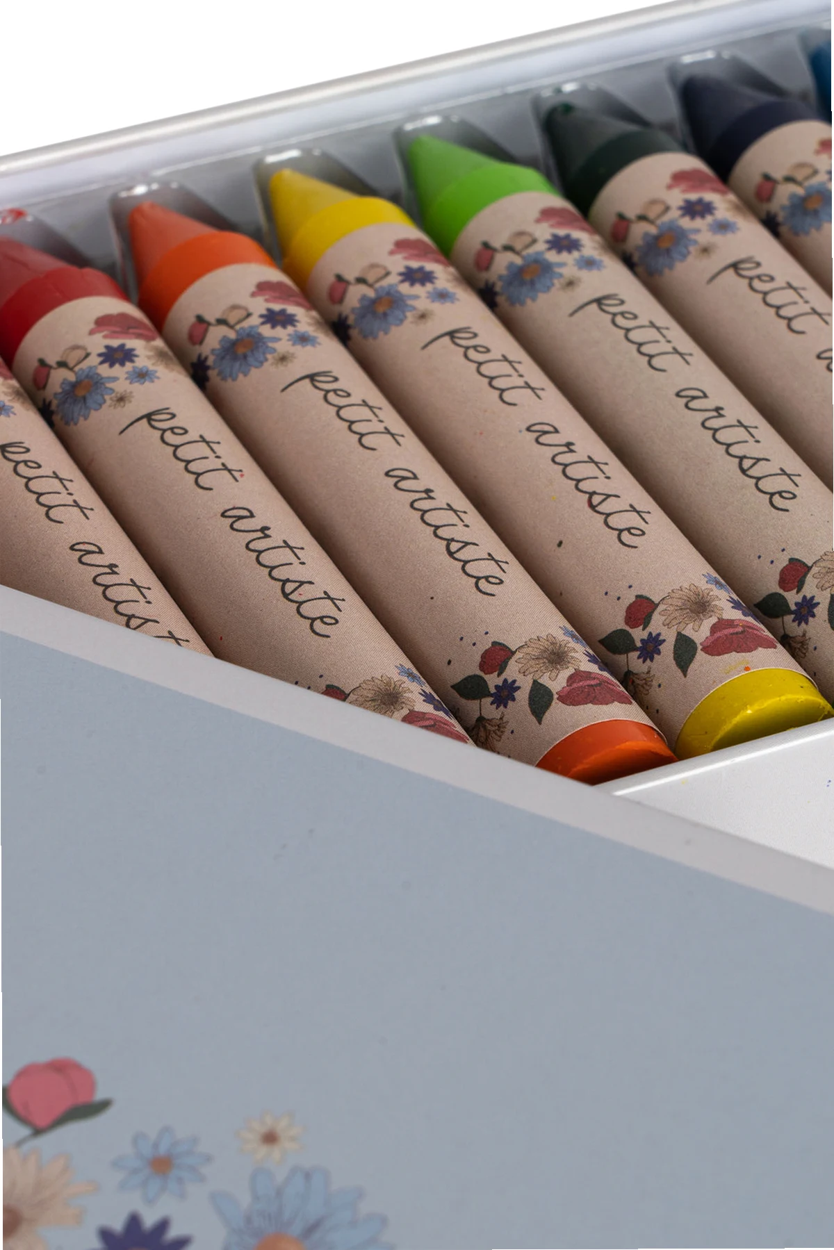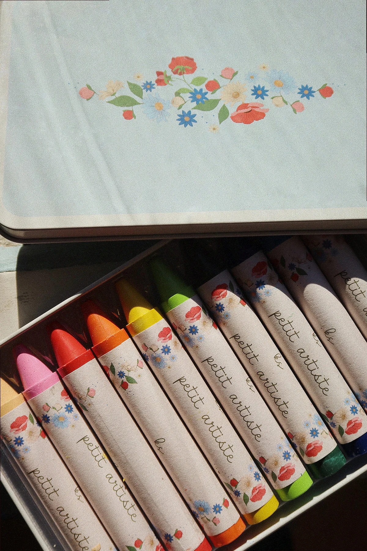 Zestaw dziesięciu kolorowych kredek Konges Slojd. Wykonane z pszczelego wosku. Zapakowane w szare, metalowe pudełko ozdobione wzorem z motywem kwiatowym.