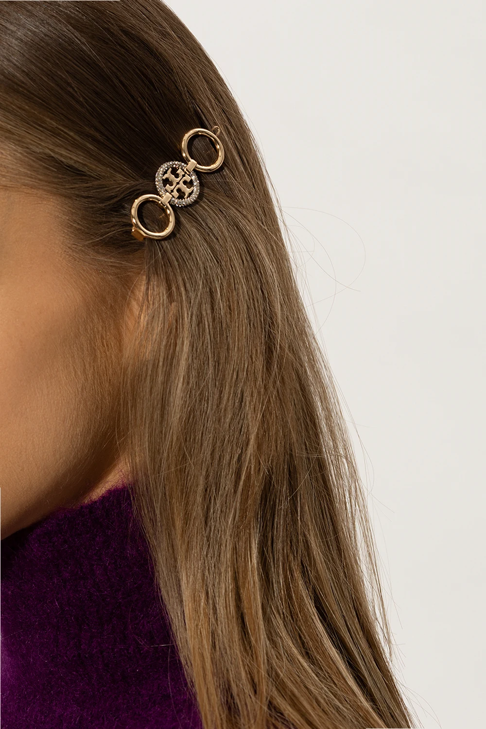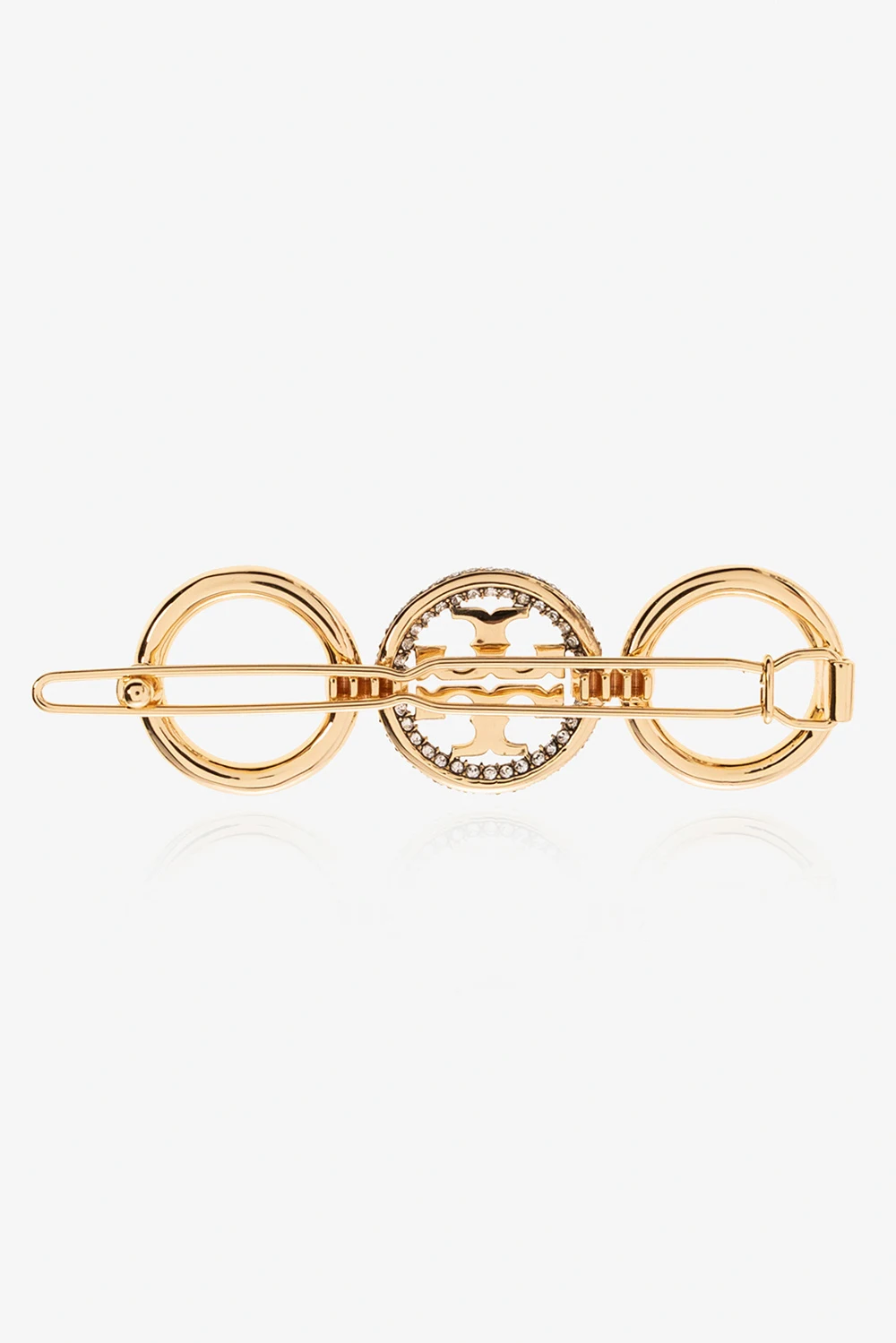 Mosiężna spinka do włosów w kolorze złotym, model ‘Miller’ Tory Burch. Ozdobiona aplikacją w kształcie trzech pierścieni, w tym jednym z umieszczonym w nim logo oraz wysadzanym techniką ‘pave’ połyskującymi kryształami.