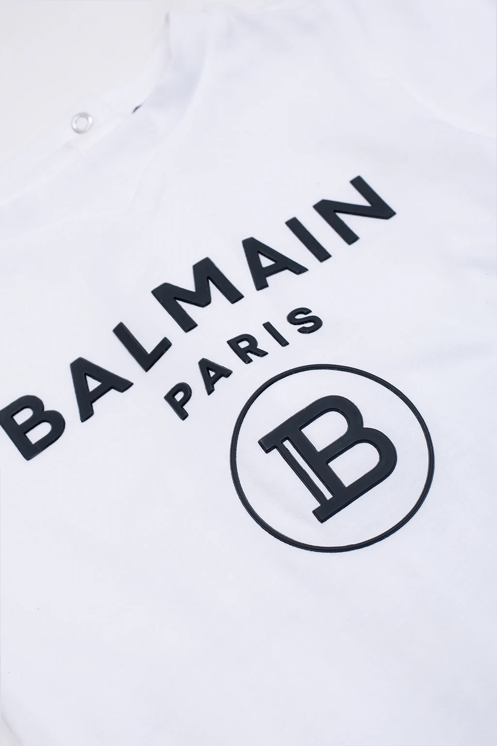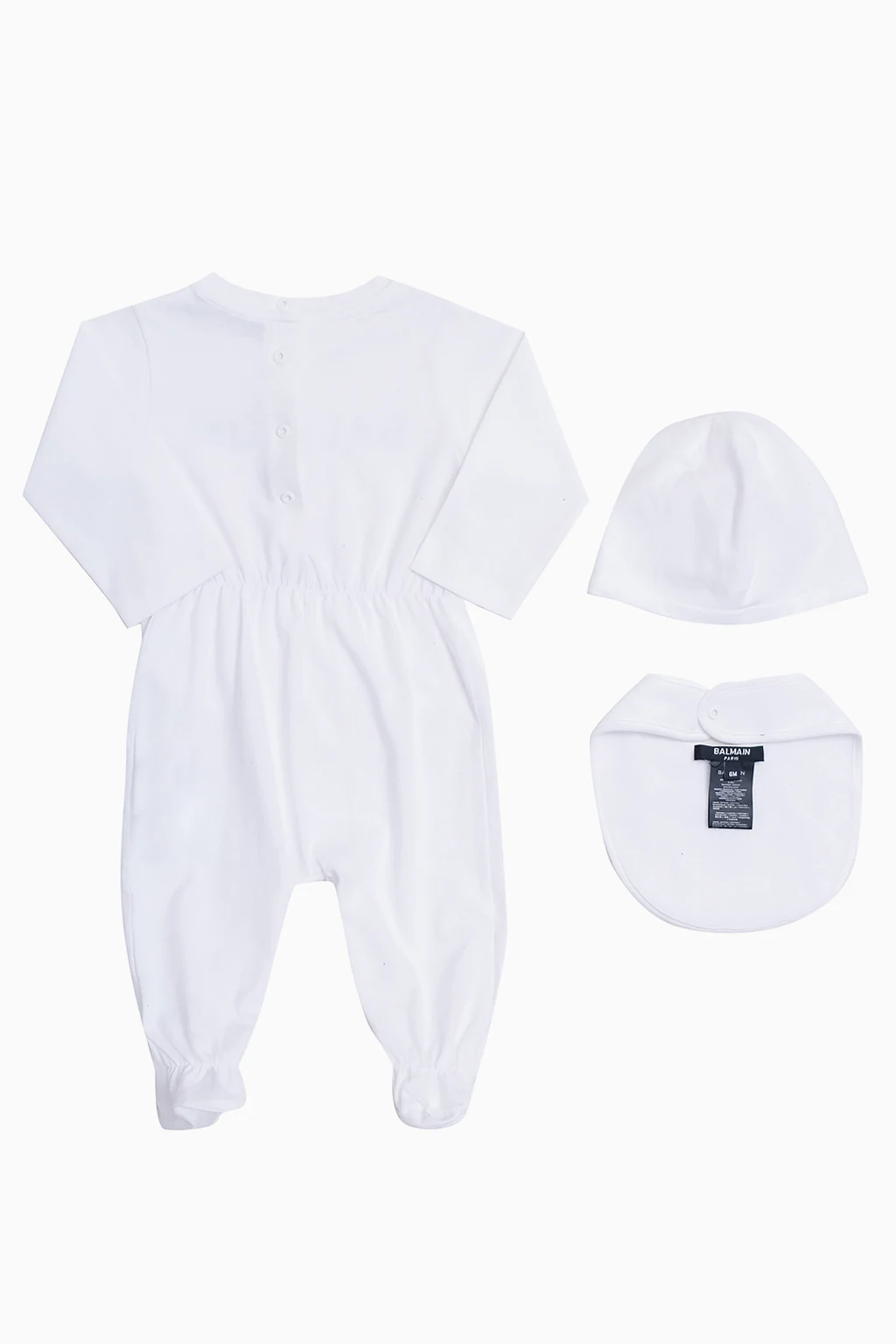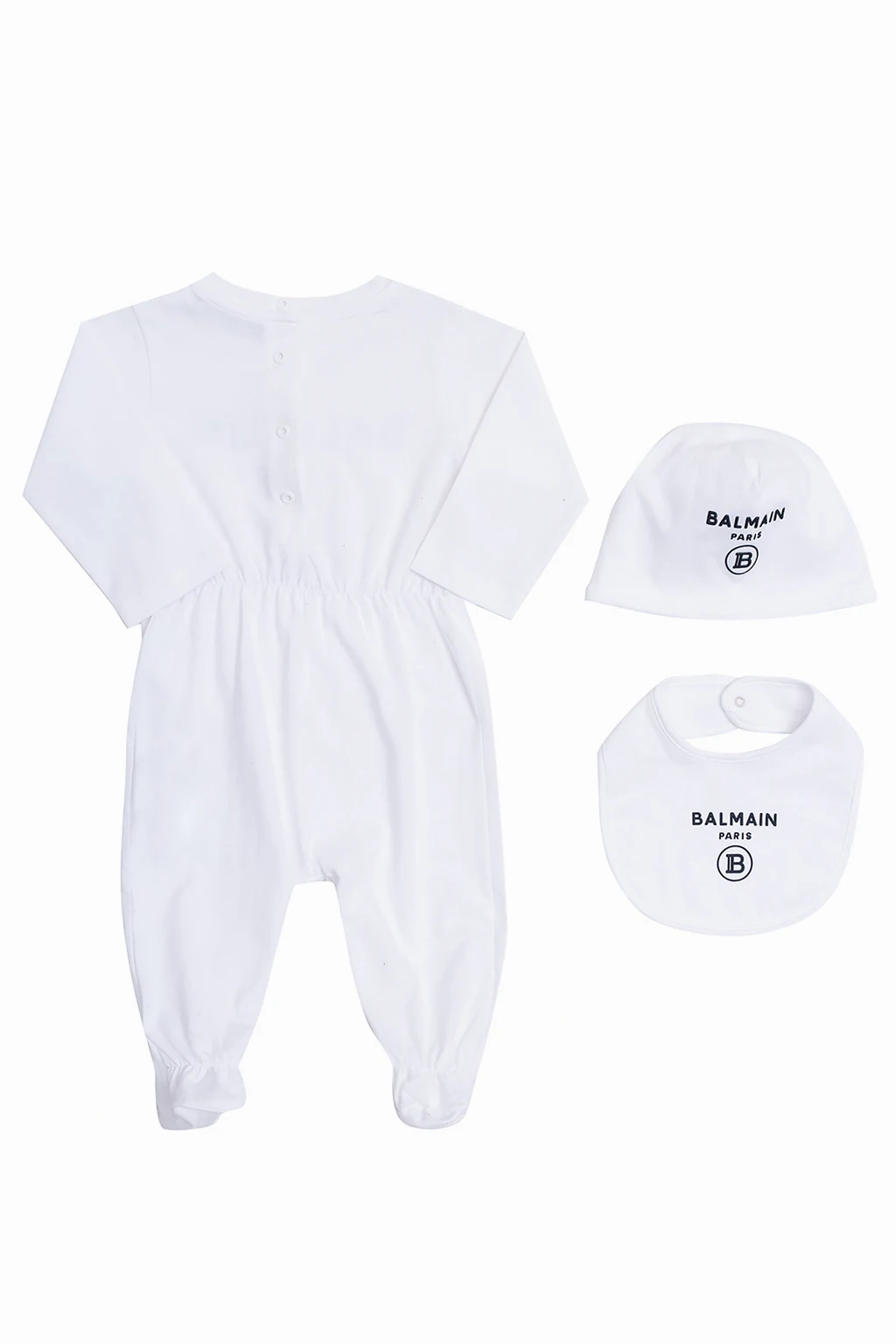 Biały, bawełniany zestaw: pajacyk, śliniak i czapka Balmain Kids. Ozdobiony czarnym, wypukłym logo.