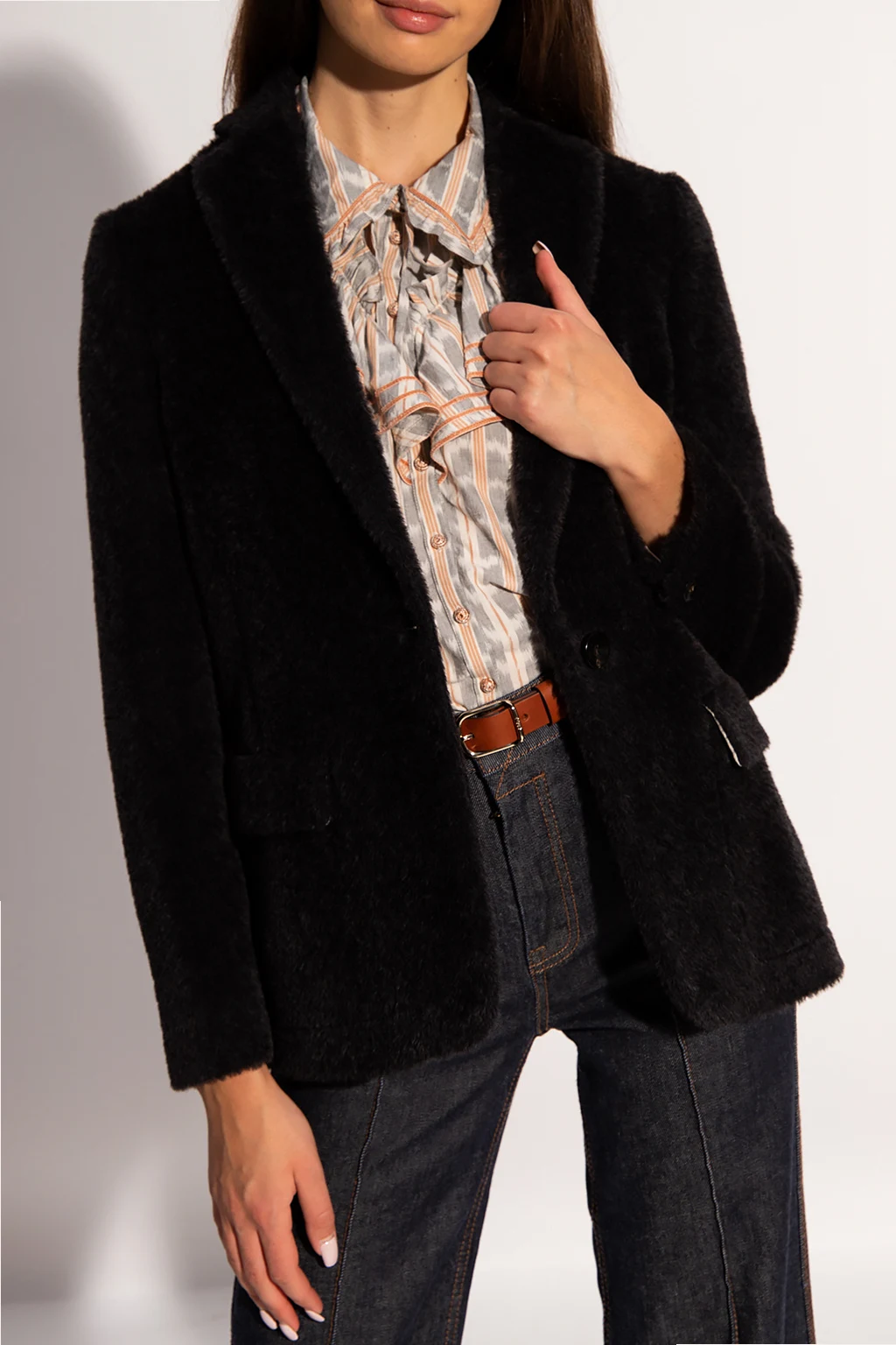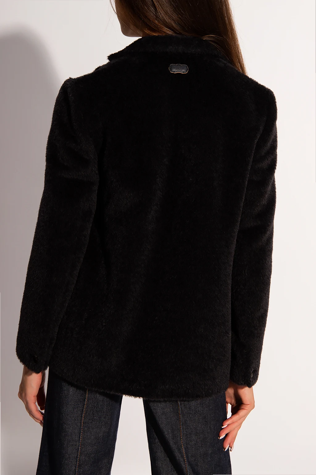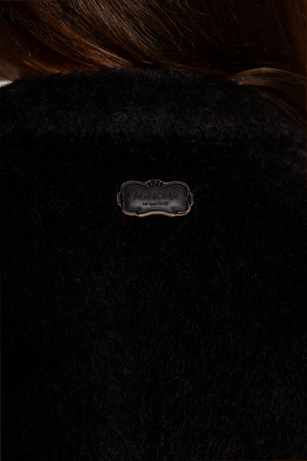 Czarna marynarka z otwartymi klapami Agnona. Wykonana z wełny oraz wełny z alpaki o specjalnej fakturze. Zapinana na guzik. Z przodu dwie kieszenie z patką. Długie rękawy. Z tyłu aplikacja z logo.