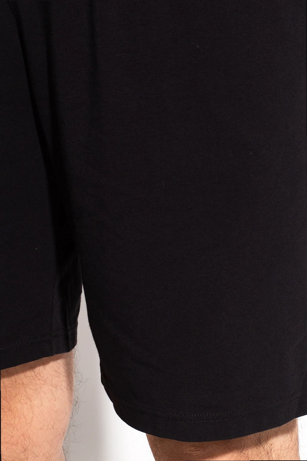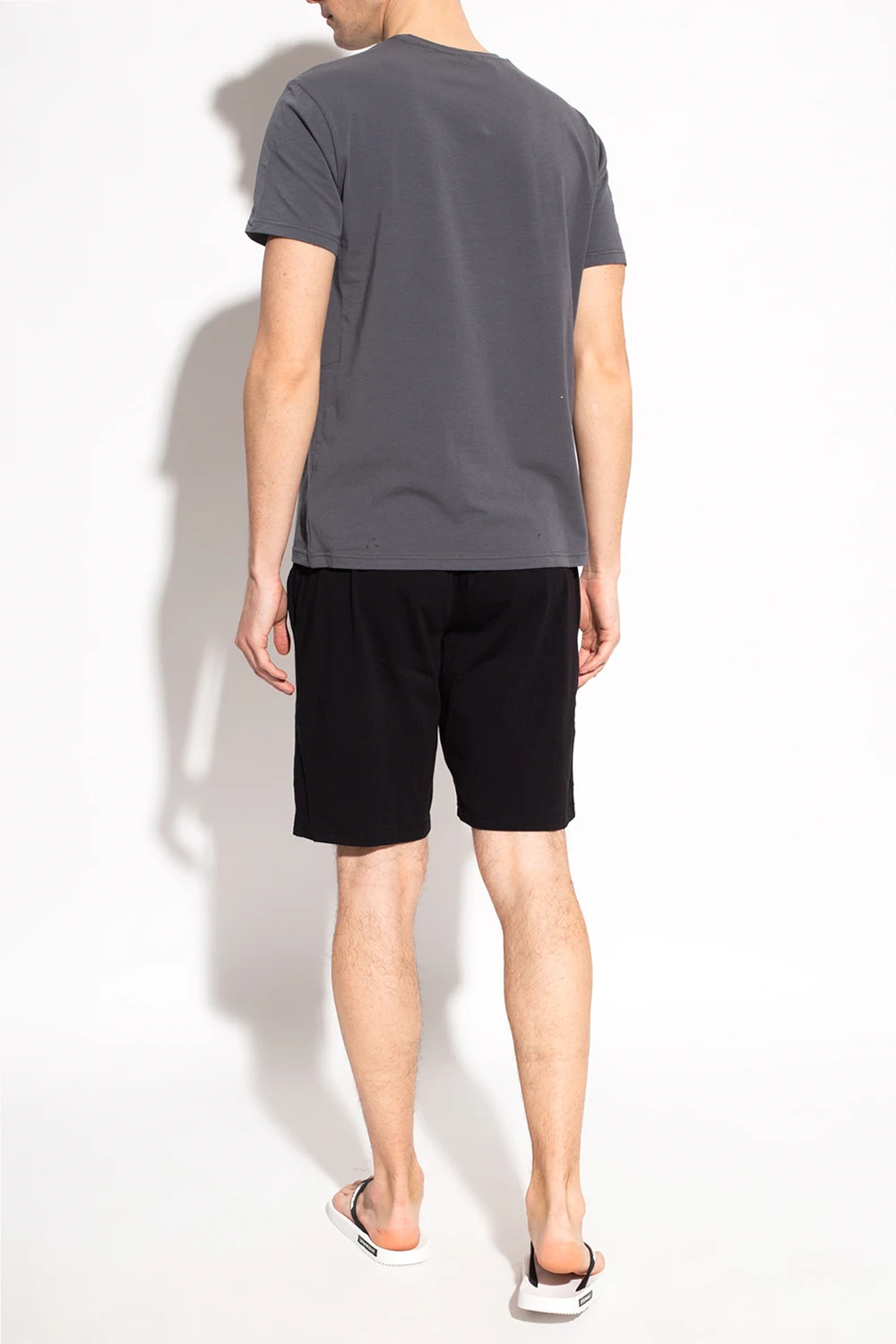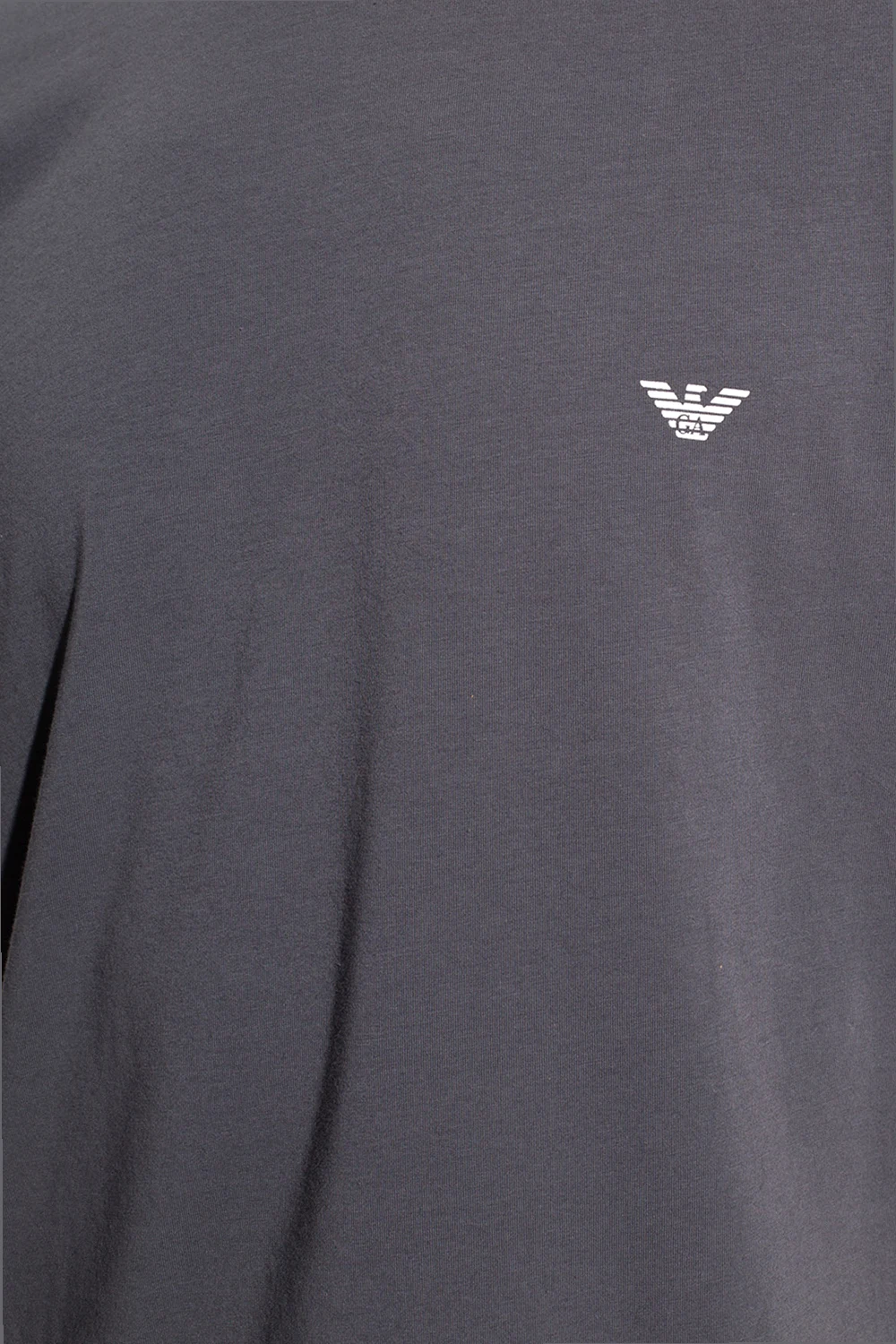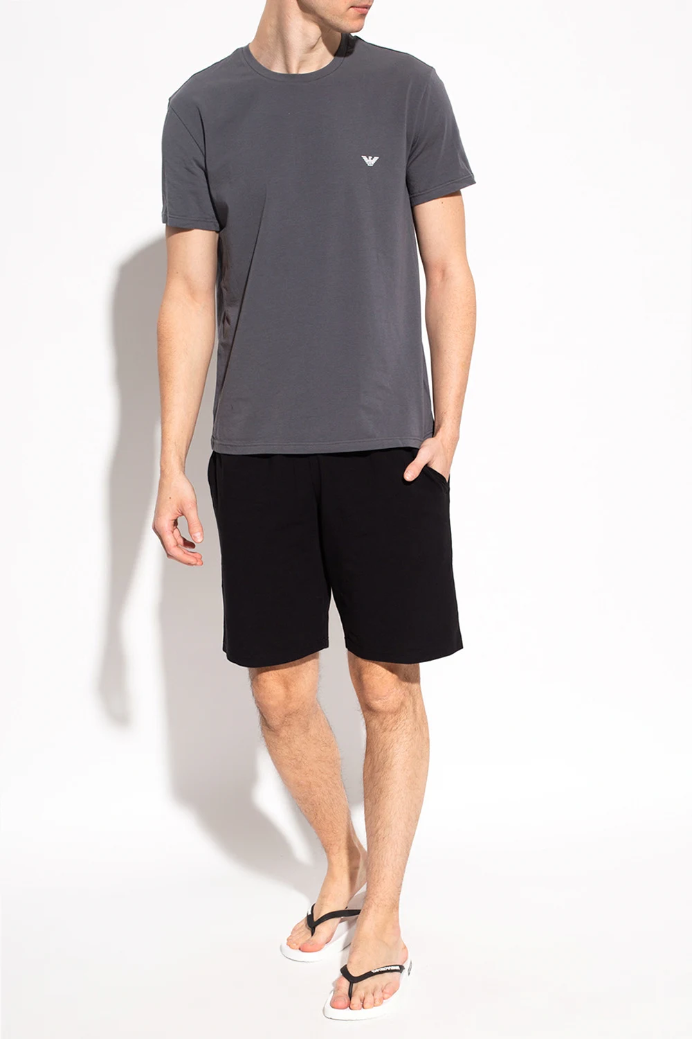 Bawełniana piżama Emporio Armani. Góra w kolorze szarym. Ozdobiona nadrukowanym logo w kolorze białym. Okrągły dekolt. Dół w kolorze czarnym. W pasie wszyta guma z wyszytym logo w kolorze białym. Krótkie nogawki.