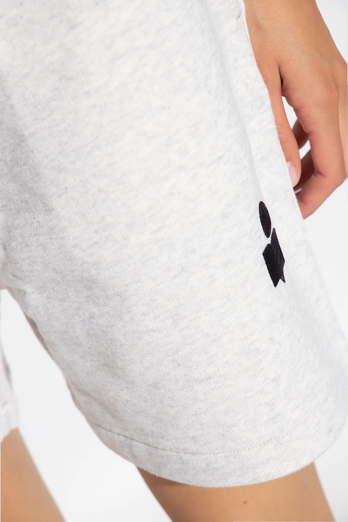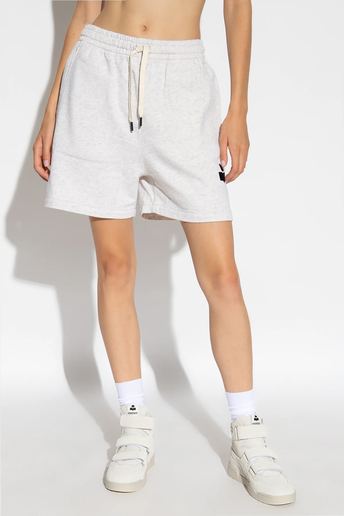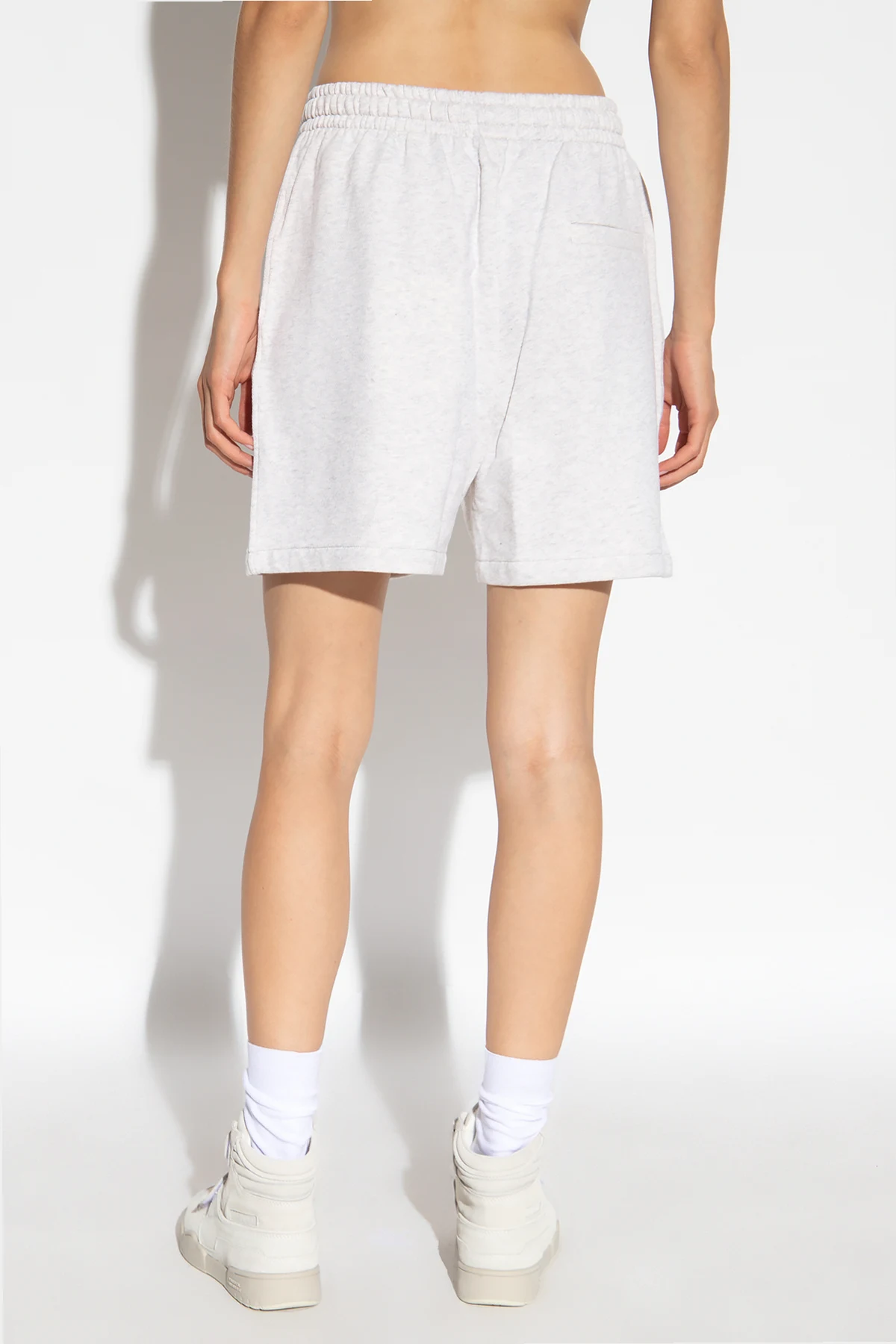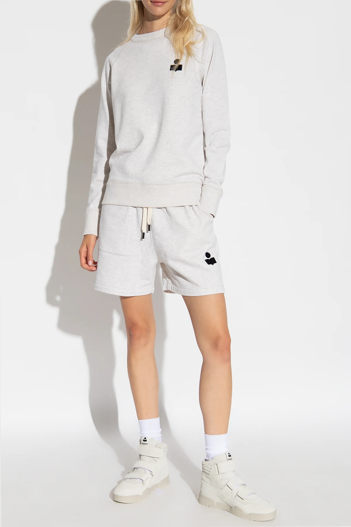 Kremowe, bawełniane szorty dresowe, model ‘Mirana’ Marant Etoile. W pasie ściągane trokami. Ozdobione aksamitnym logo w kolorze czarnym. Z przodu dwie wsuwane kieszenie, z tyłu jedna.