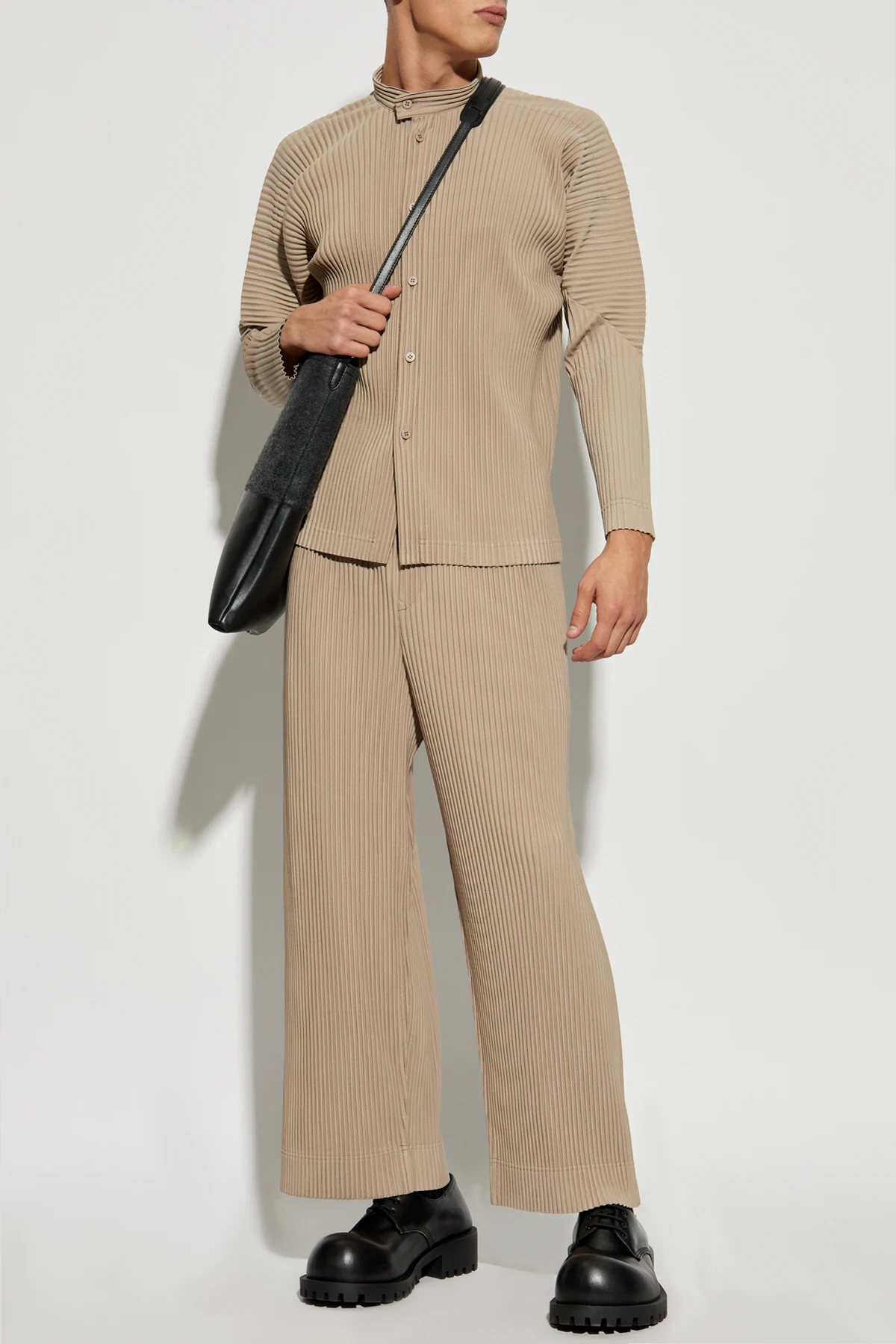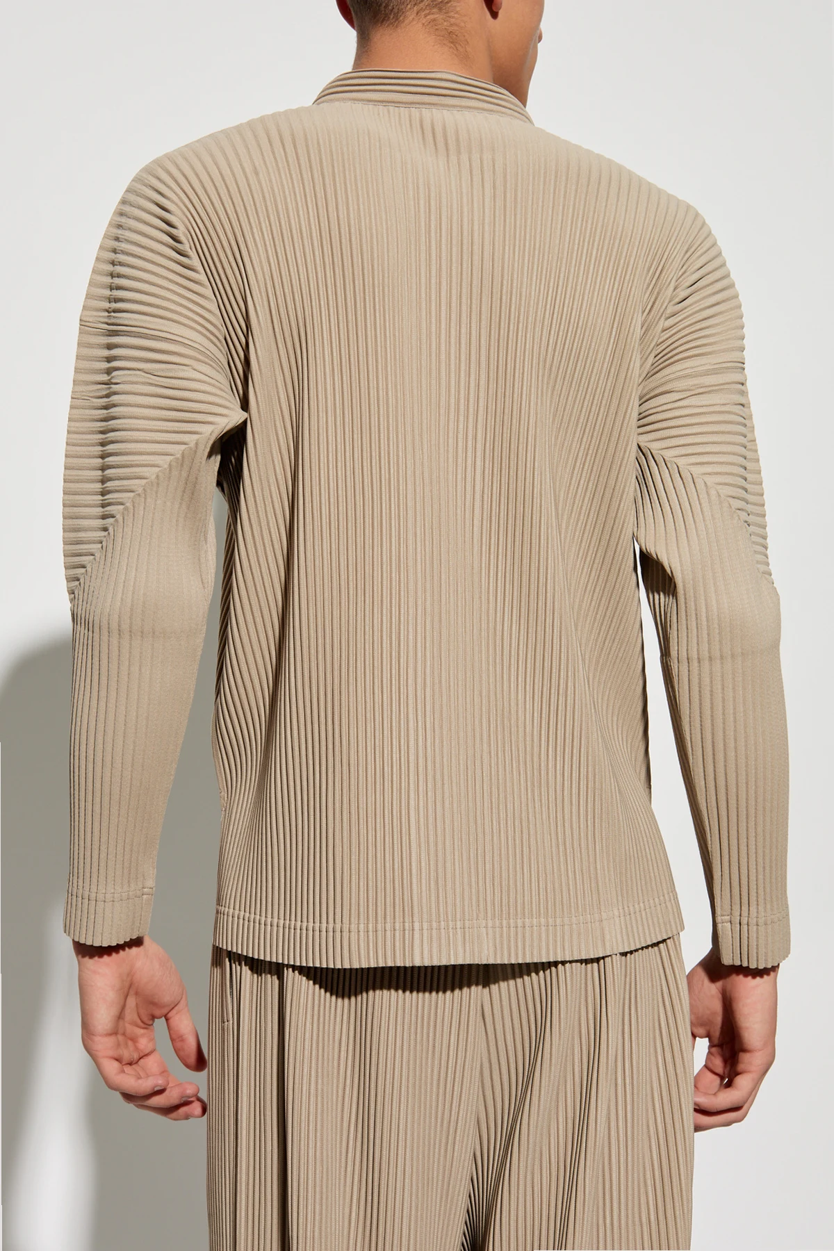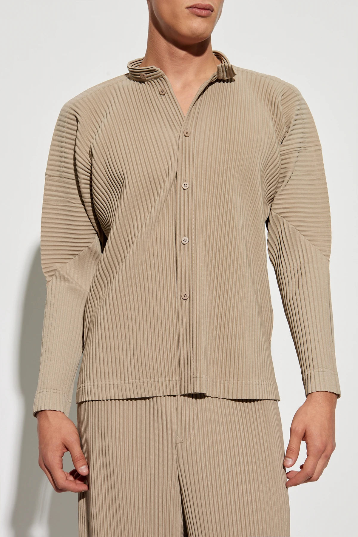 Plisowana koszula z kolekcji Homme Plissé Issey Miyake to synonim elegancji i komfortu. Ta beżowa koszula, wykonana z plisowanego materiału, wyróżnia się prostym, luźnym krojem oraz stójkowym kołnierzykiem, który dodaje jej wyjątkowego charakteru.