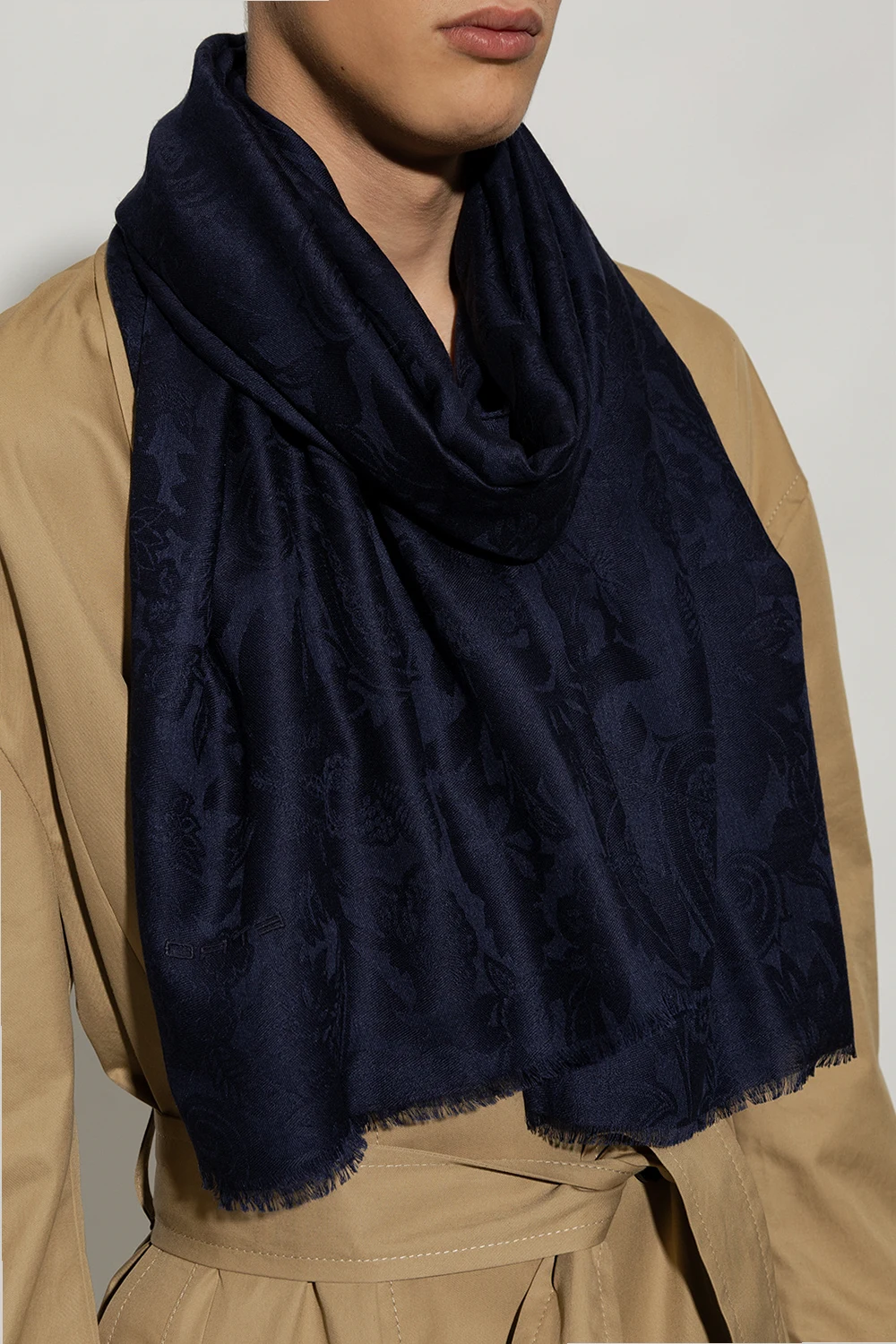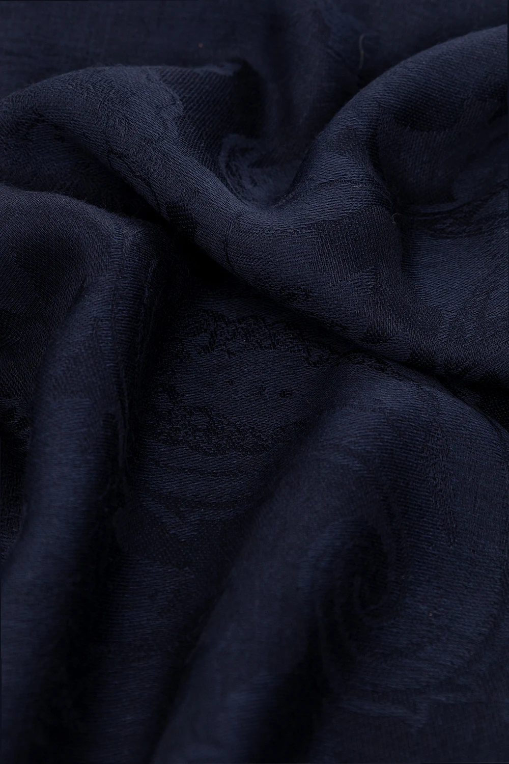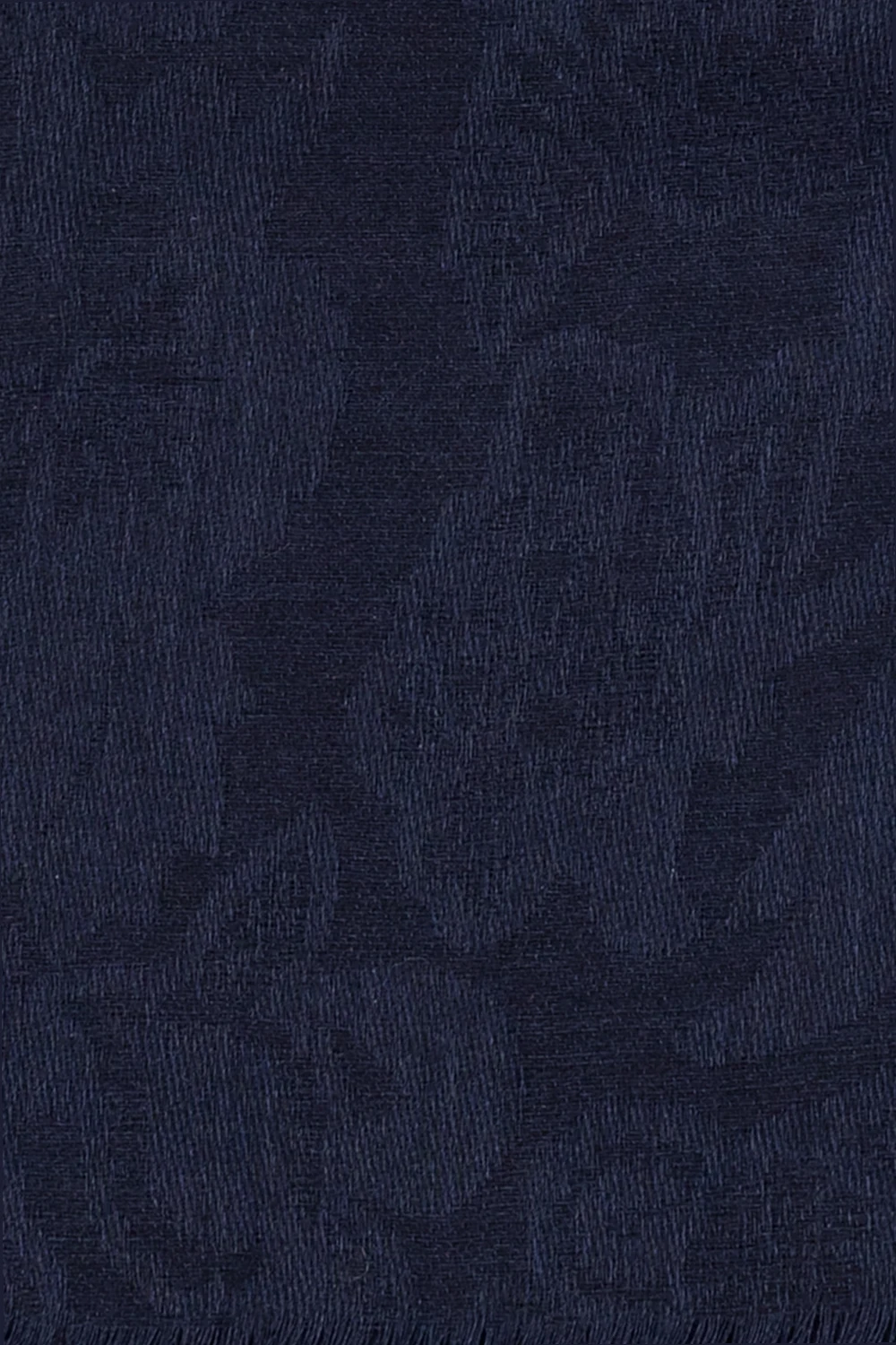 Granatowy szal Etro. Wykonany z wełny, jedwabiu i kaszmiru. Ozdobiony motywem kwiatowym. Surowo wykończone dwa brzegi.