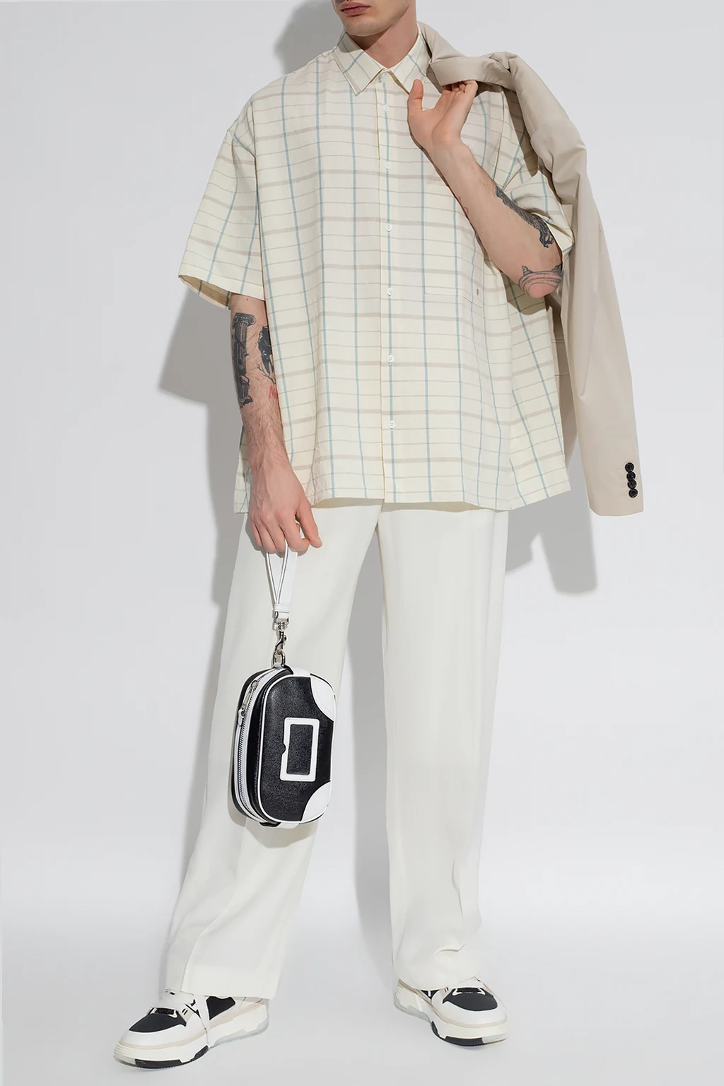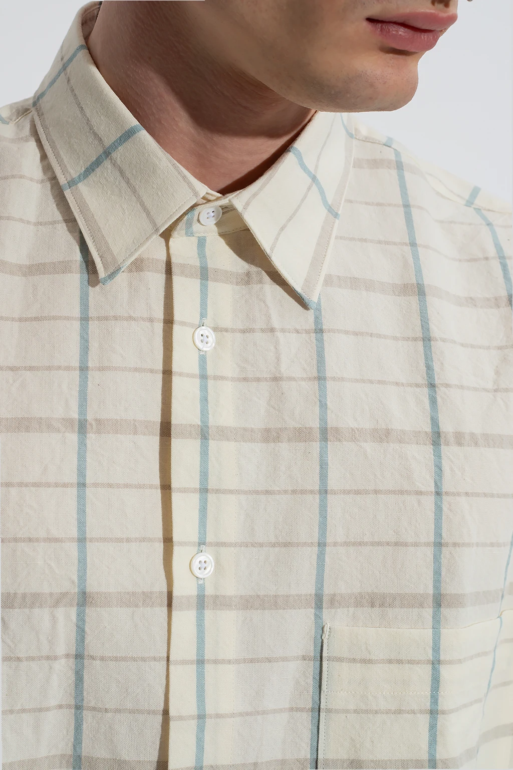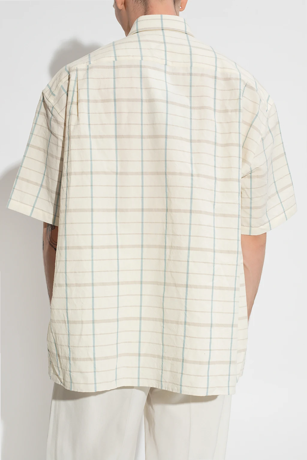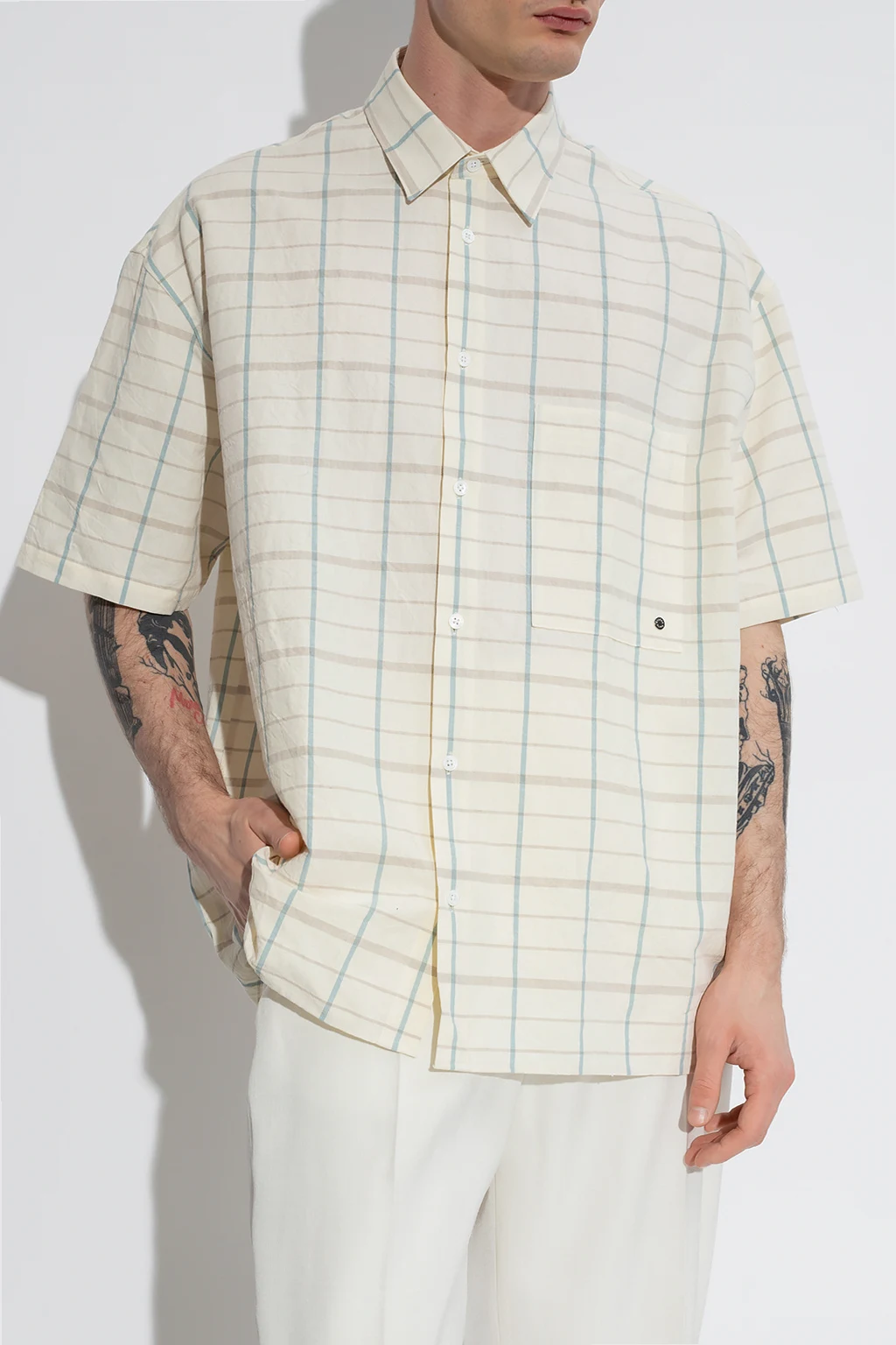 Kremowa koszula Etudes. Wykonana z bawełny i lnu. Zapinana na guziki. Ozdobiona niebiesko-szarym wzorem w kratę. Z przodu wsuwana kieszeń. Krótkie rękawy.