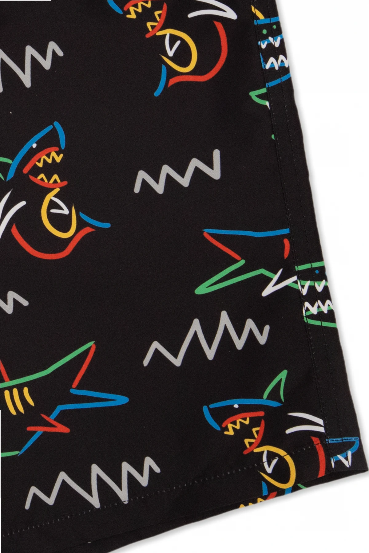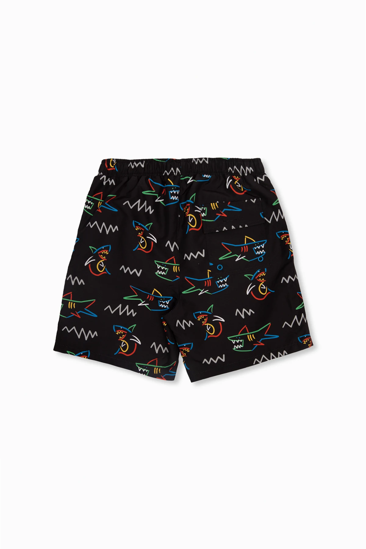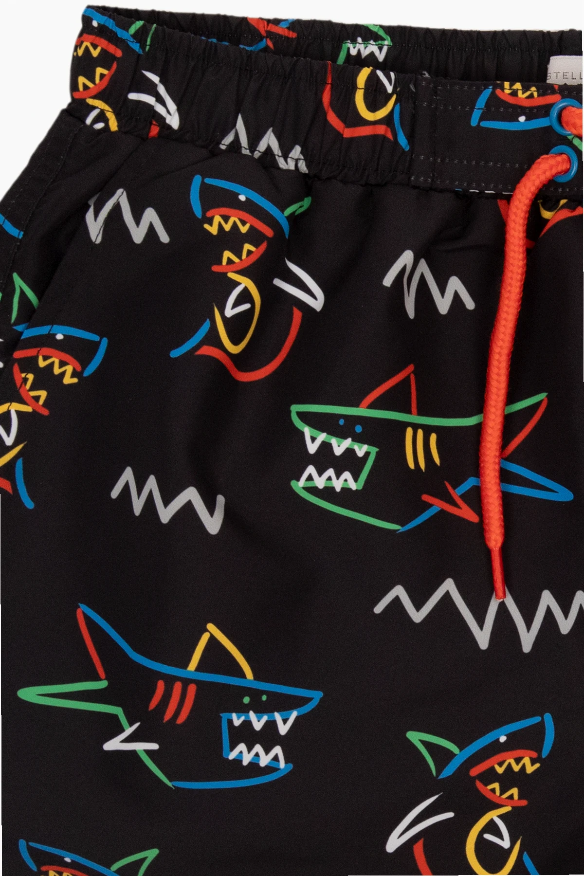 Czarne szorty kąpielowe Stella McCartney Kids. Wykonane z materiału z recyklingu. W pasie wszyta guma ściągana trokami. Ozdobione kolorowym wzorem z motywem rekinów. Trzy kieszenie: dwie wsuwane i z patką zapinaną na rzep.