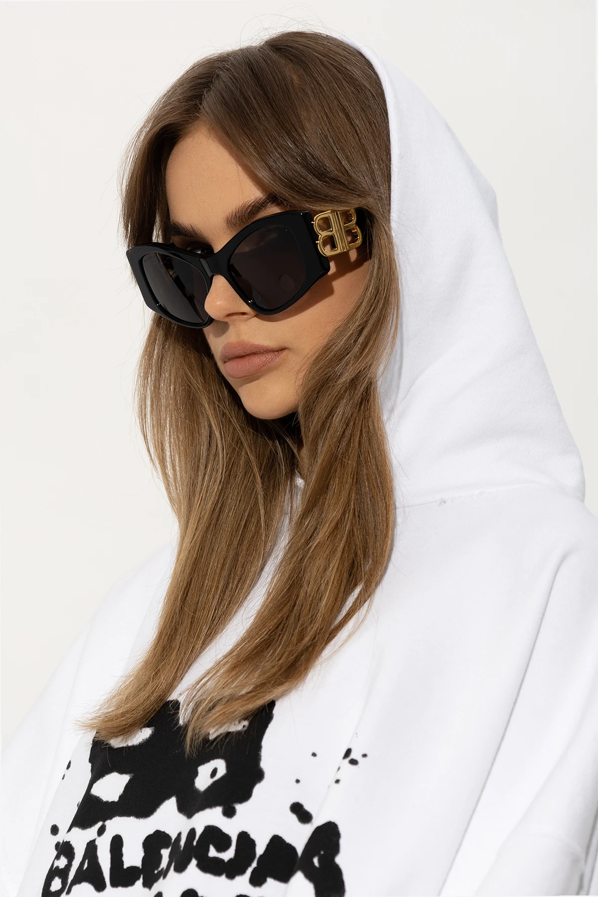 Czarne okulary przeciwsłoneczne, model ‘Dynasty XL D-Frame’ Balenciaga. Wykonane z Eastman Acetate Renew. Oprawka w kształcie litery ‘D’. Zauszniki ozdobione aplikacją w kształcie logo w kolorze złotym. Szare soczewki ze 100% ochroną przed promieniowaniem UV. Dołączone etui.