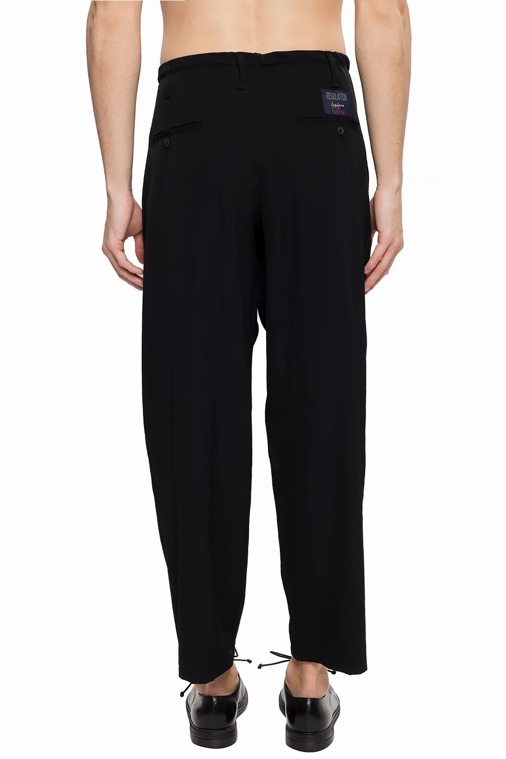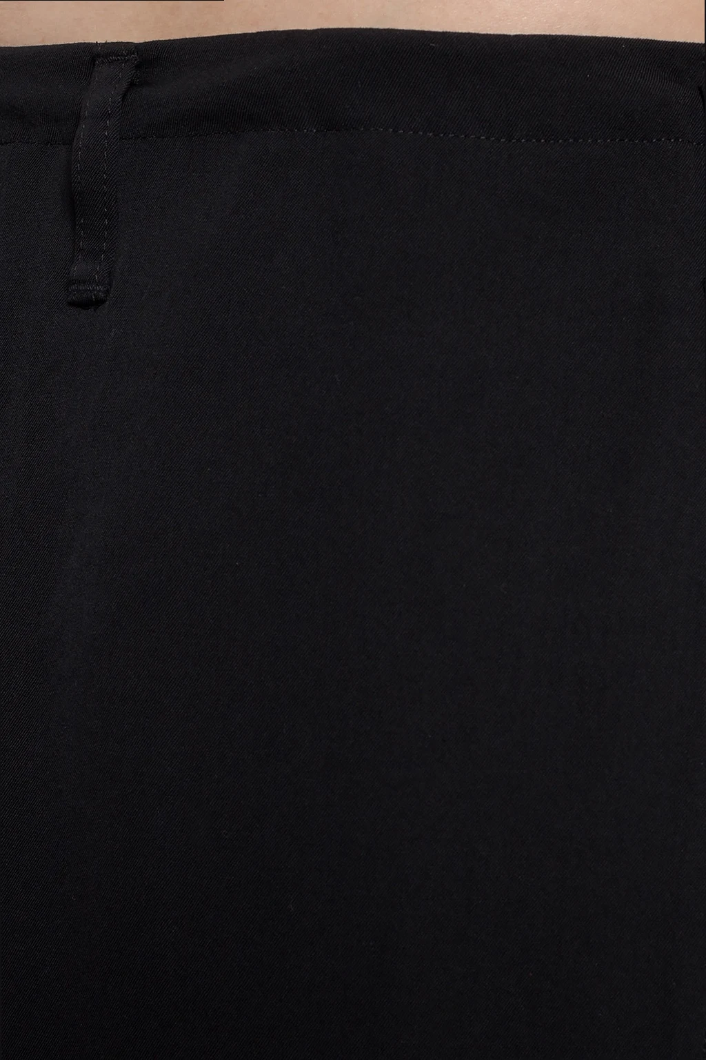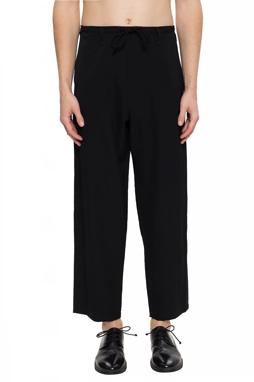Czarne, wełniane spodnie o luźnym kroju Yohji Yamamoto. W pasie ściągane trokami. Cztery kieszenie: dwie z przodu i dwie z tyłu zapinane na guzik. Zwężane nogawki długość siedem-ósmych
