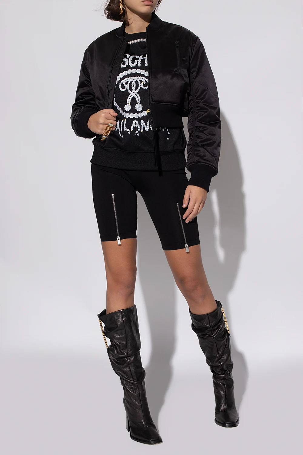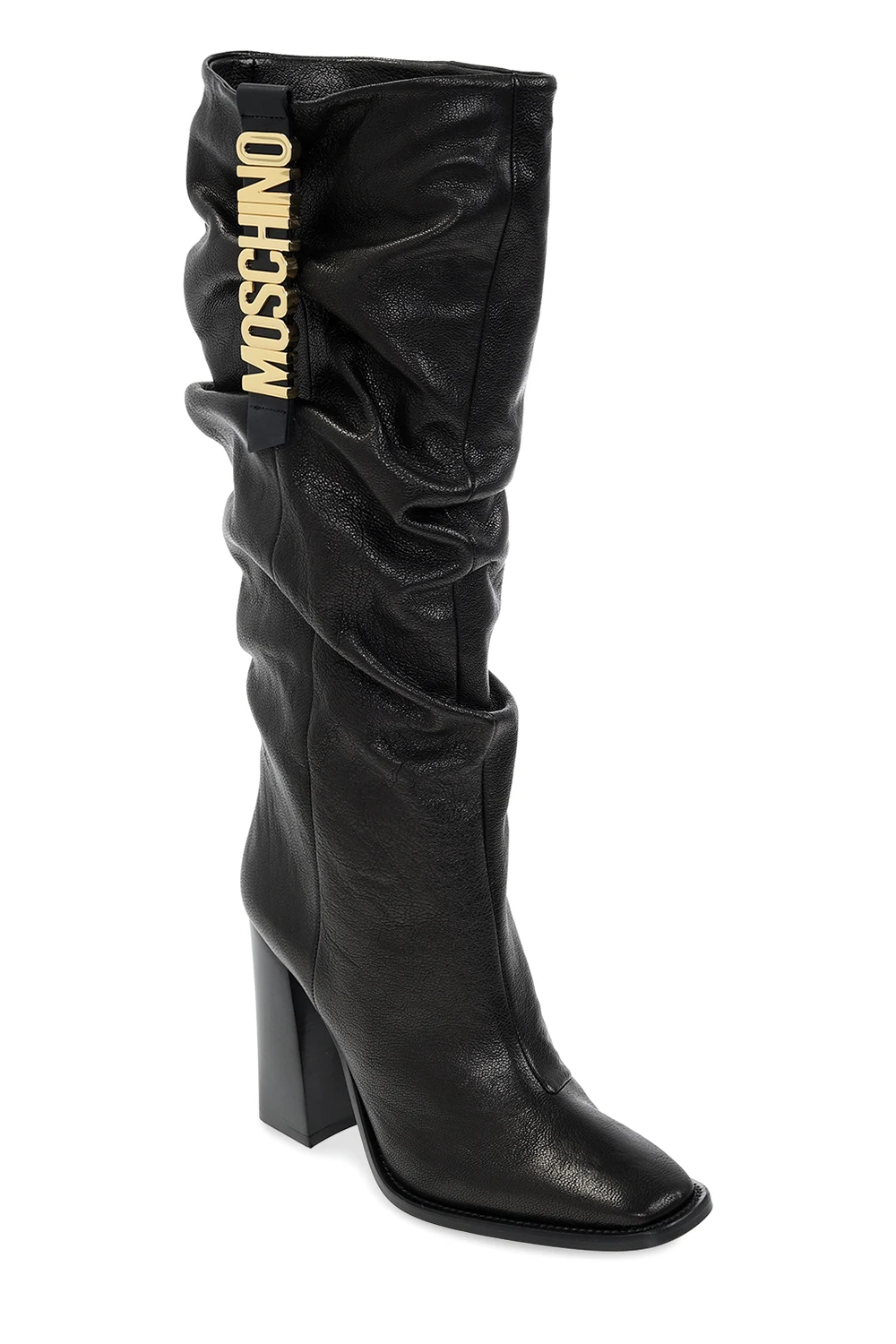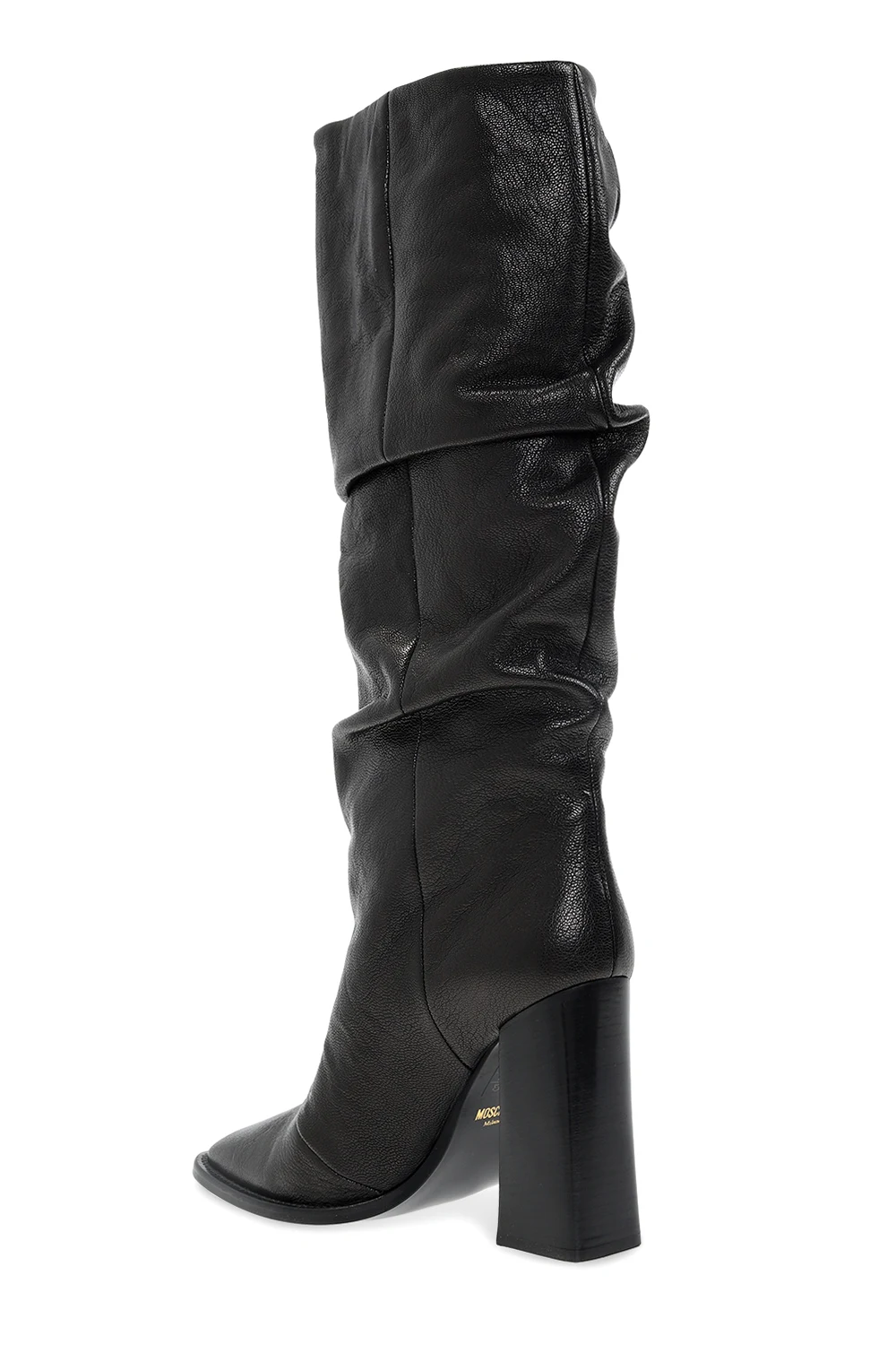 Czarne kozaki na obcasie Moschino. Wykonane ze skóry. Ozdobione marszczeniem. Z boku aplikacja z logo w kolorze złotym. Czarna, skórzana podeszwa.