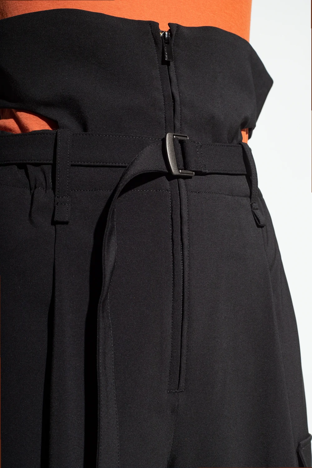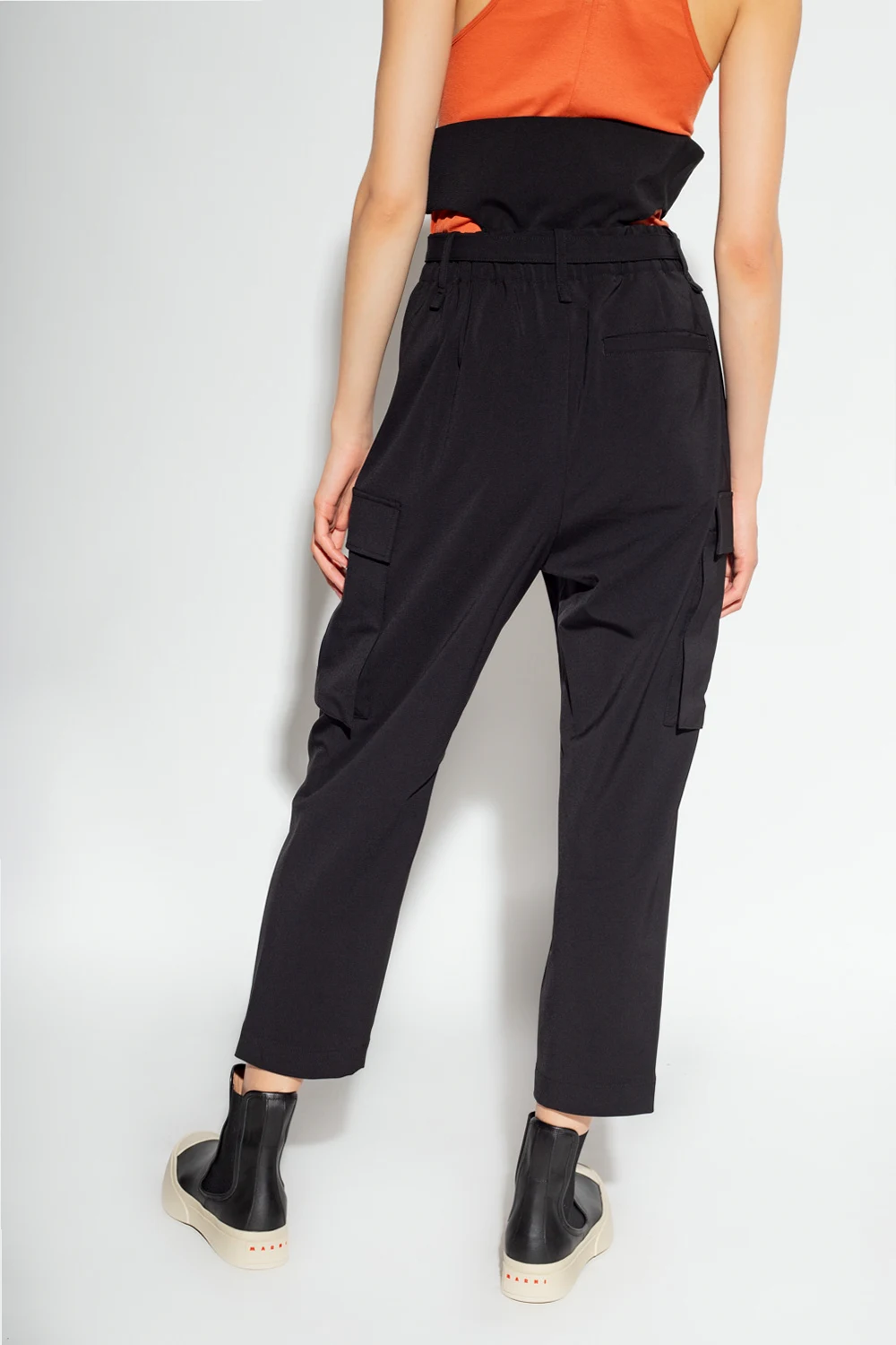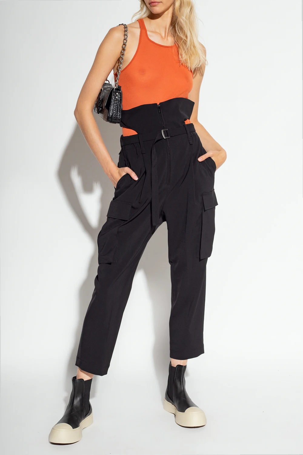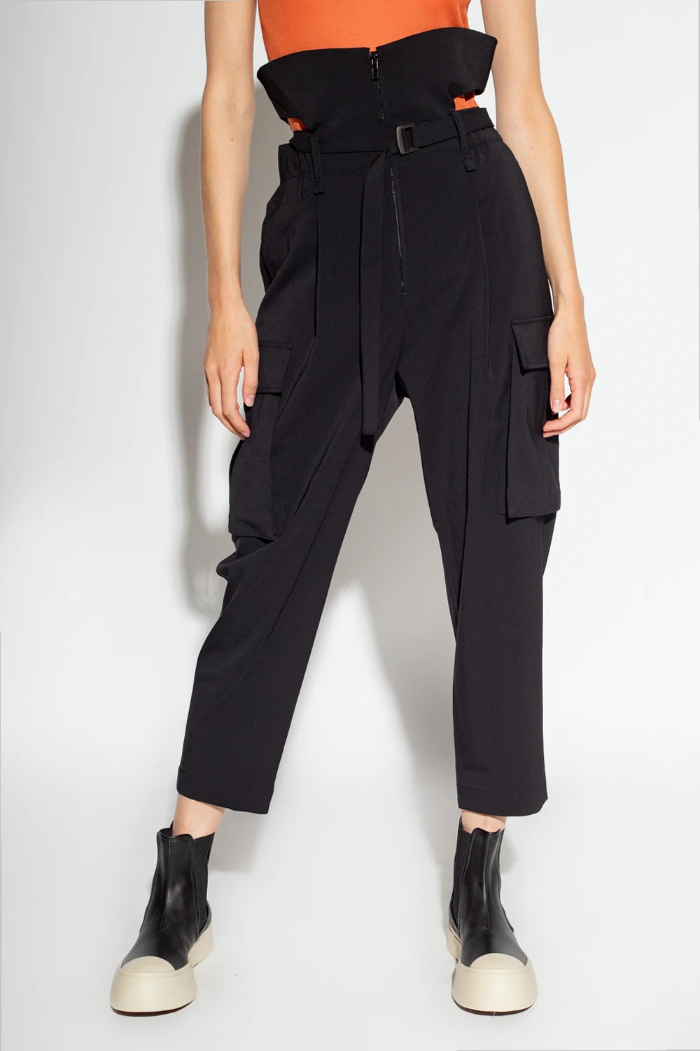 Czarne spodnie Issey Miyake Pleats Please. Zapinane na zamek oraz guzik. Pięć kieszeni: trzy wsuwane oraz dwie z patkami. Lekko zwężane nogawki.