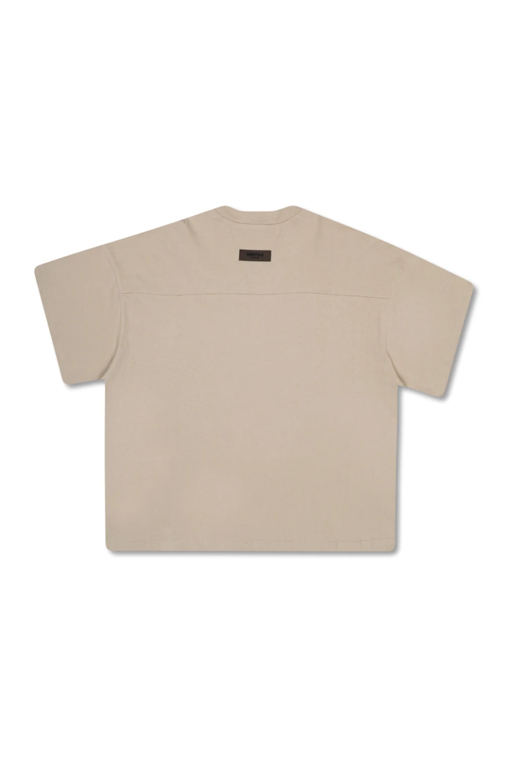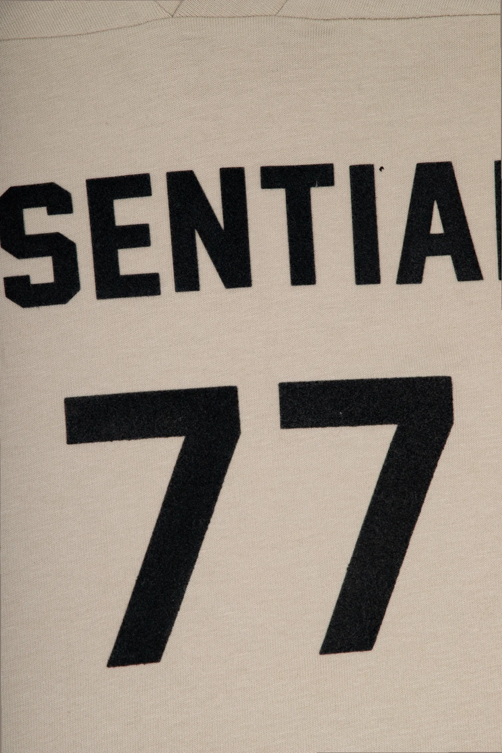 Szarobeżowy t-shirt typu ‘oversize’ Fear Of God Essentials Kids. Wykonany z bawełny. Ozdobiony wypukłym logo ‘ESSENTIALS 77’ o aksamitnym wykończeniu w kolorze ciemnoszarym. Dekolt w serek. Krótkie rękawy. Z tyłu gumowa naszywka z logo.