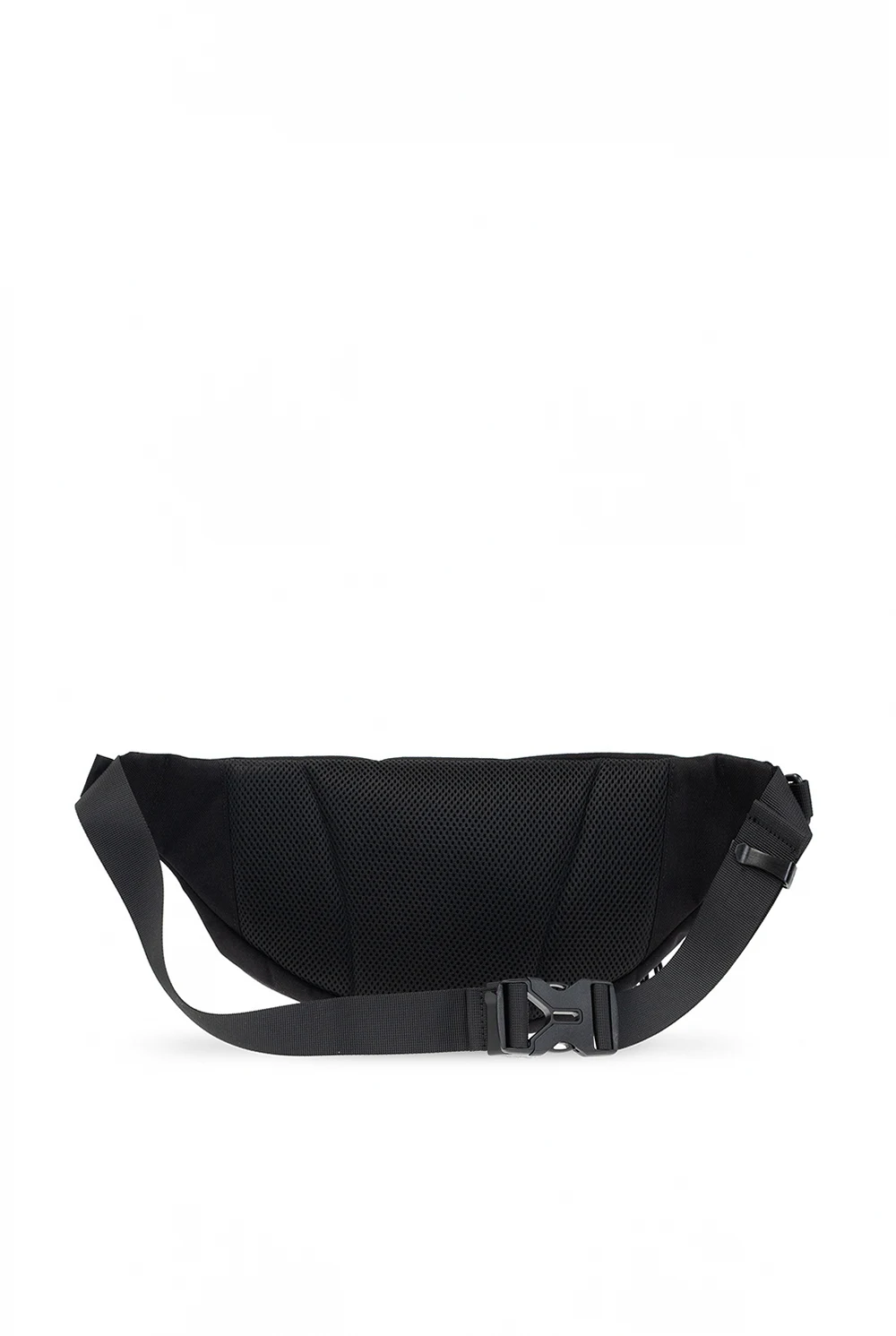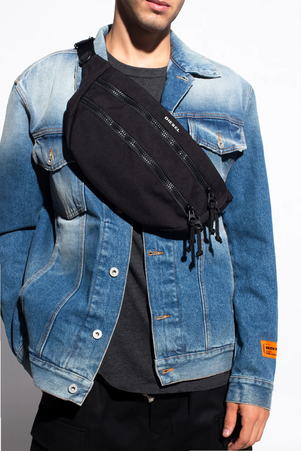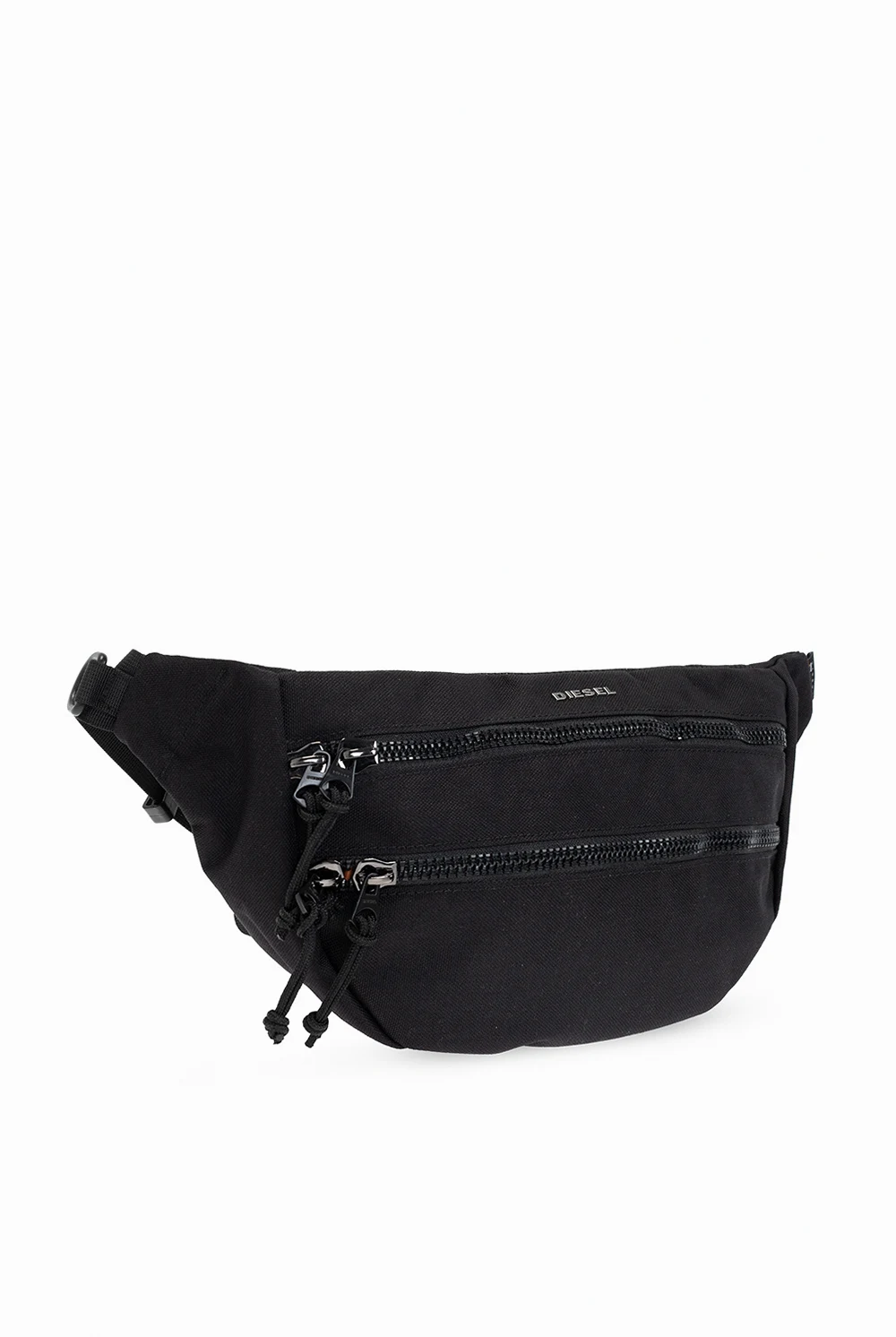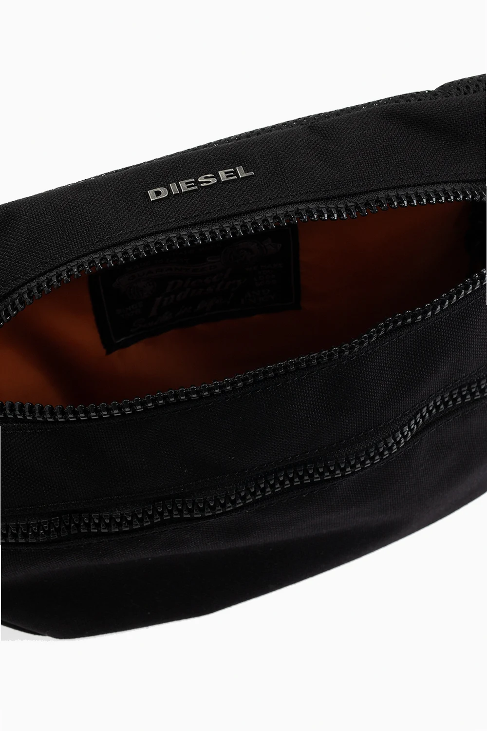 Czarna torba na pas, model ‘F-URBHANITY’ Diesel. Wykonana z wytrzymałego materiału ‘CORDURA®’. Zamykana na dwubiegunowe zamki. Ozdobiona metalową aplikacją z logo w kolorze srebrnym. Z przodu kieszeń na zamek. Pas z możliwością regulacji długości oraz dodatkowy pasek z zatrzaskiem. Wewnątrz pomarańczowa komora z kieszenią na zamek.