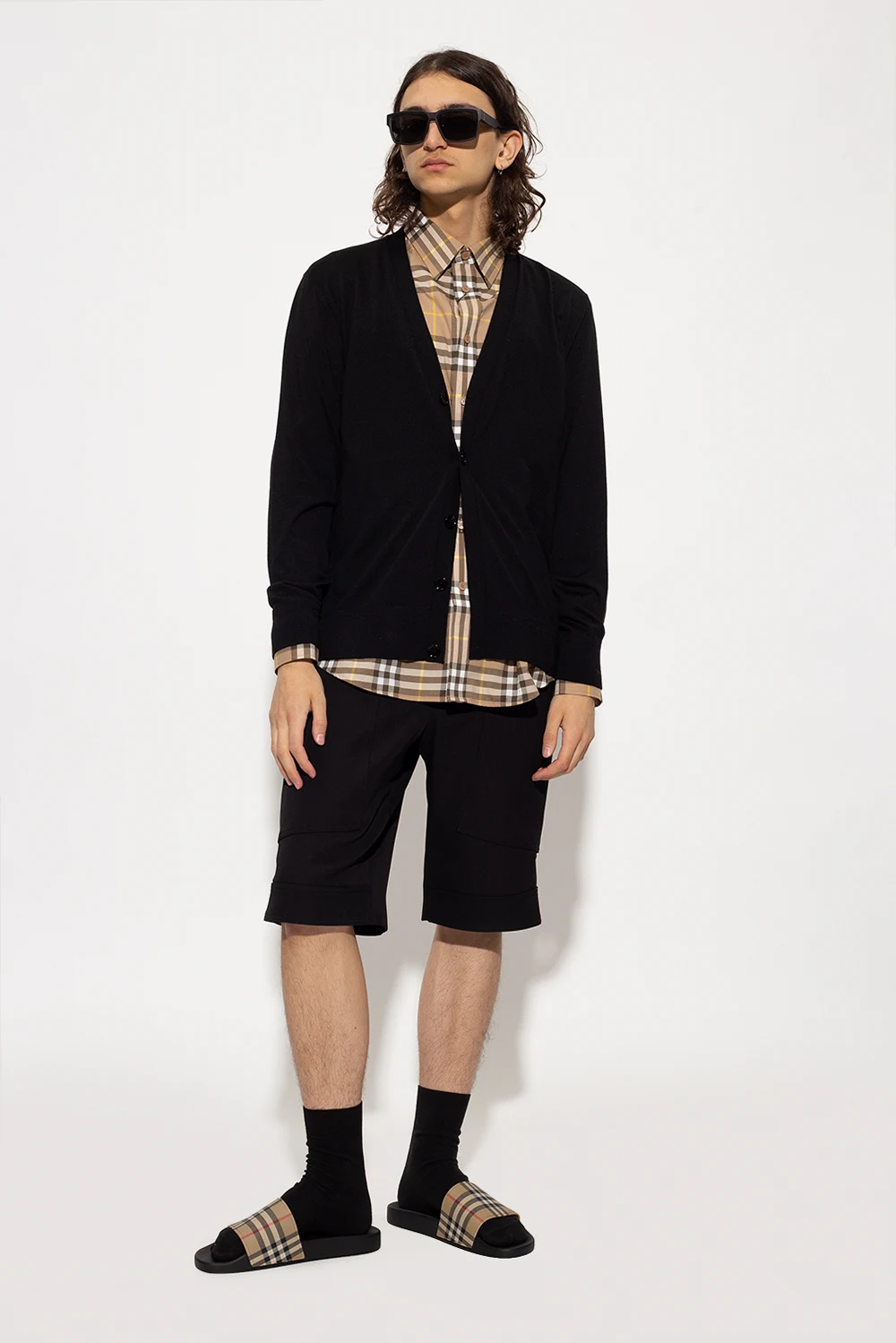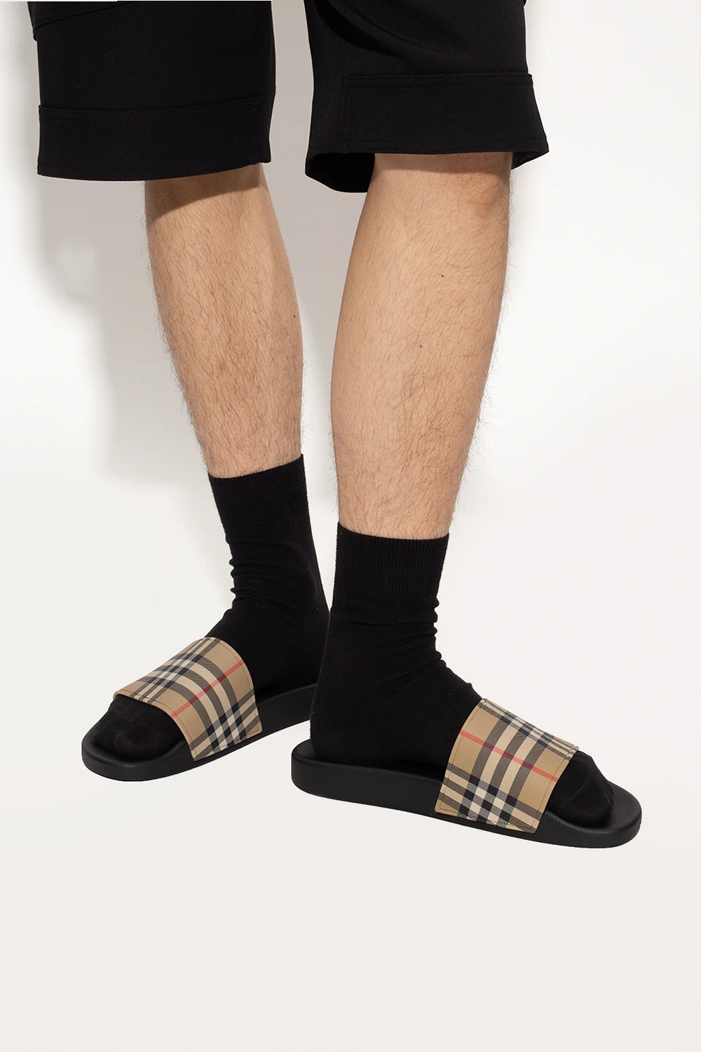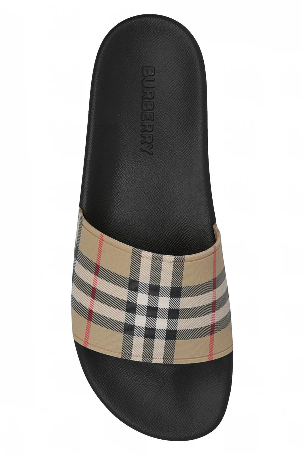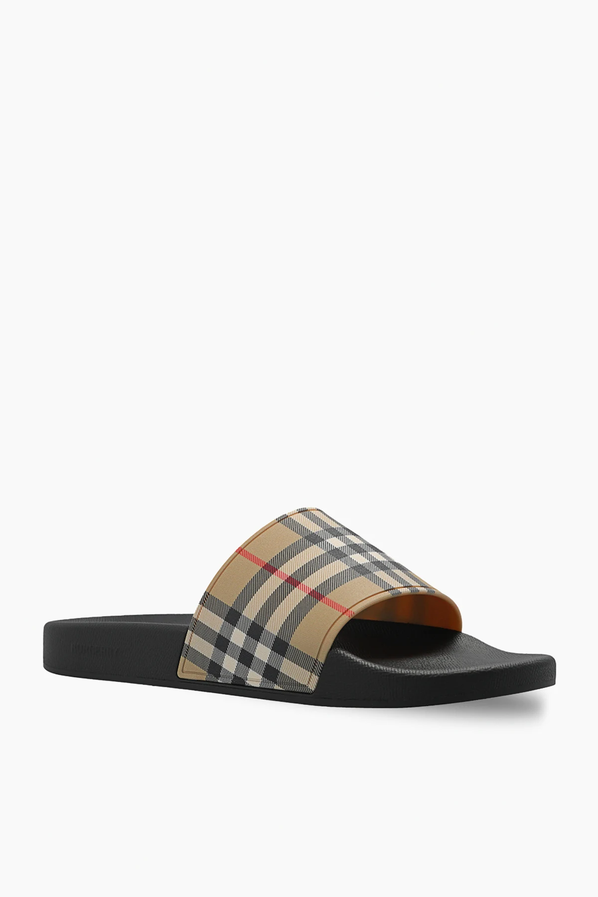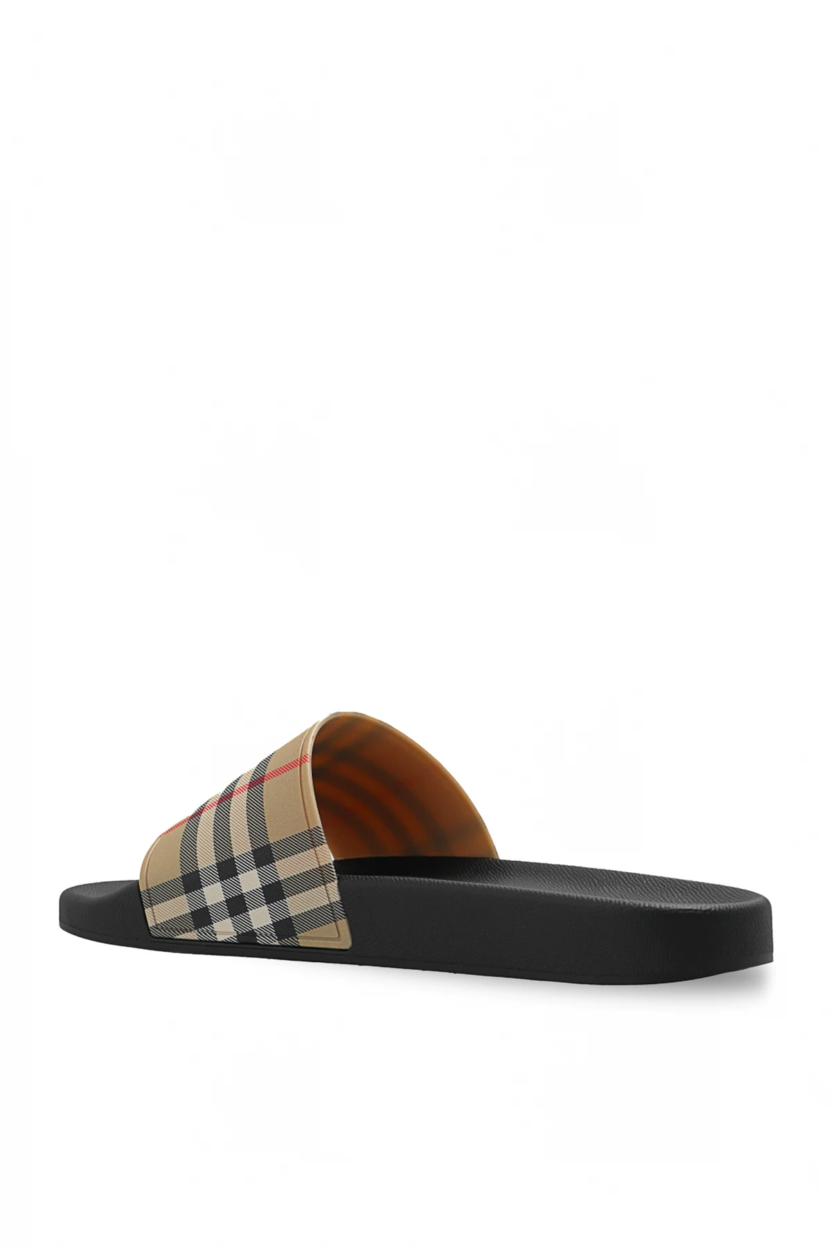 Beżowe klapki, model ‘Furley’ Burberry. Wykonane z termoplastycznego poliuretanu. Ozdobione kolorową, charakterystyczną kratą. Czarna, gumowa podeszwa z logo.