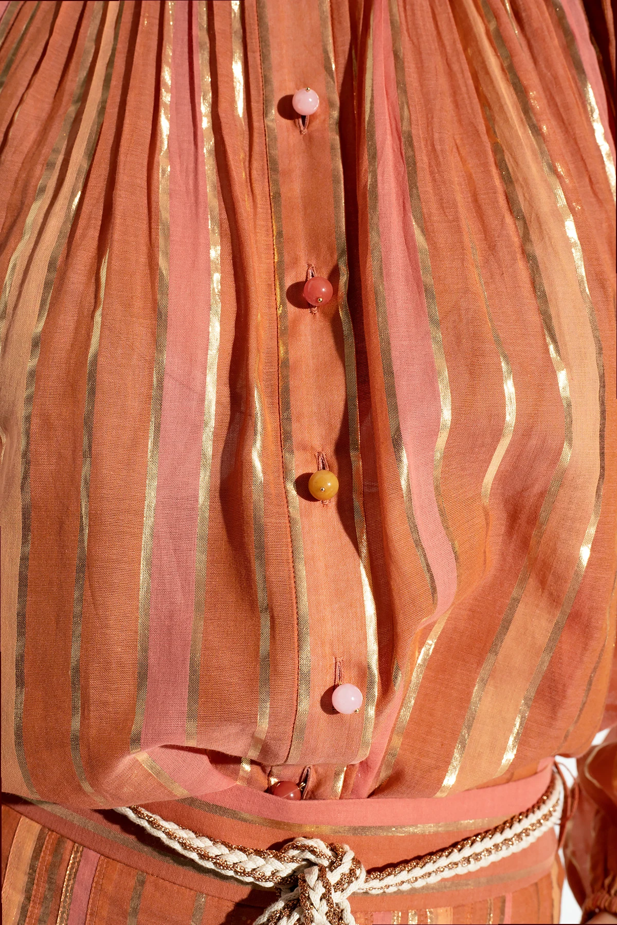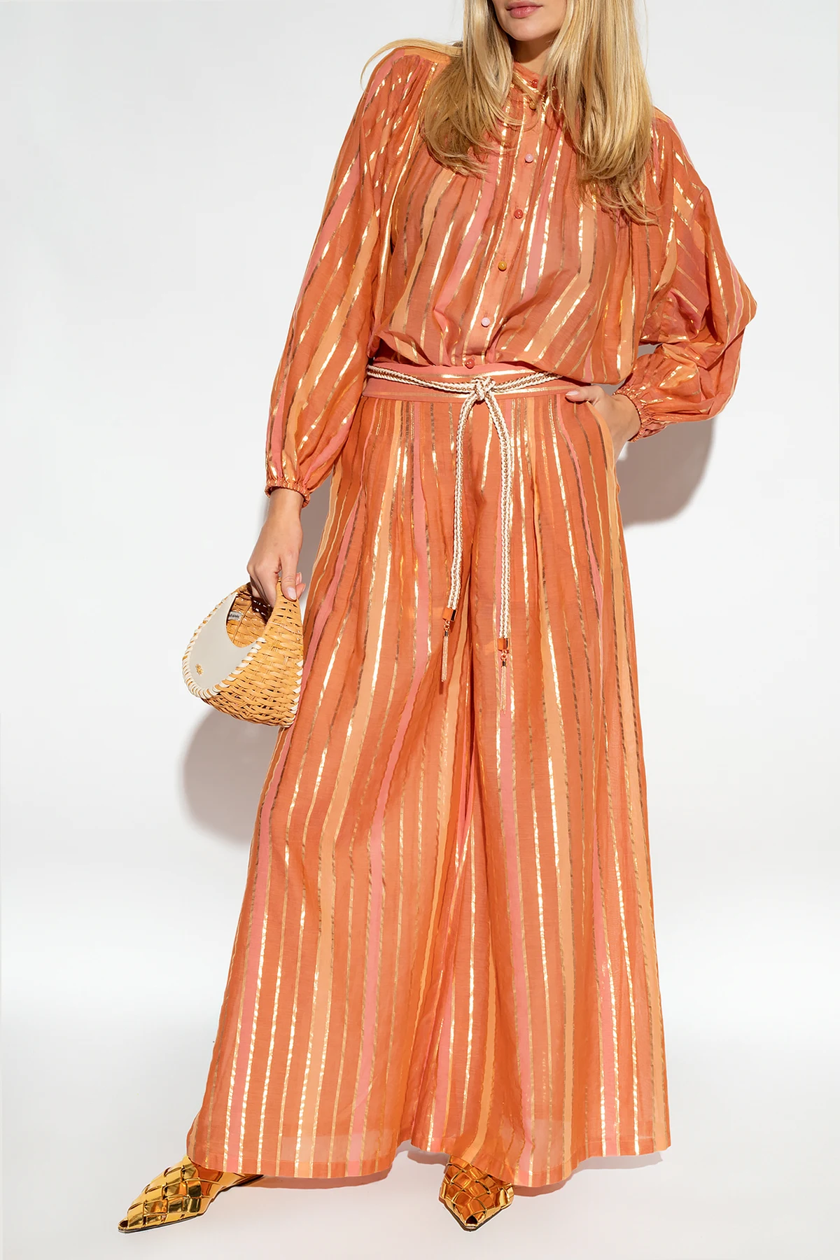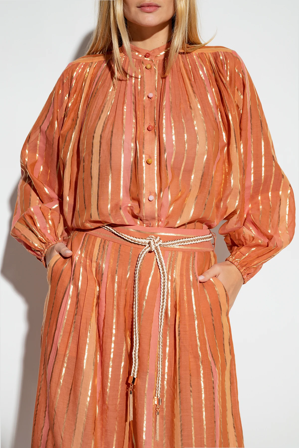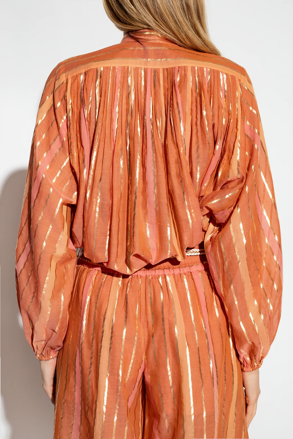 Pomarańczowo-różowo-brązowa koszula Zimmermann. Wykonana z bawełny. Zapinana na guziki. Ozdobiona wzorem w pasy wykończonym połyskującą nicią w kolorze złotym. Luźny krój ozdobiony marszczeniami z dekoltem wykończonym stójką i długimi, bufiastymi rękawami zakończonymi ściągaczem.