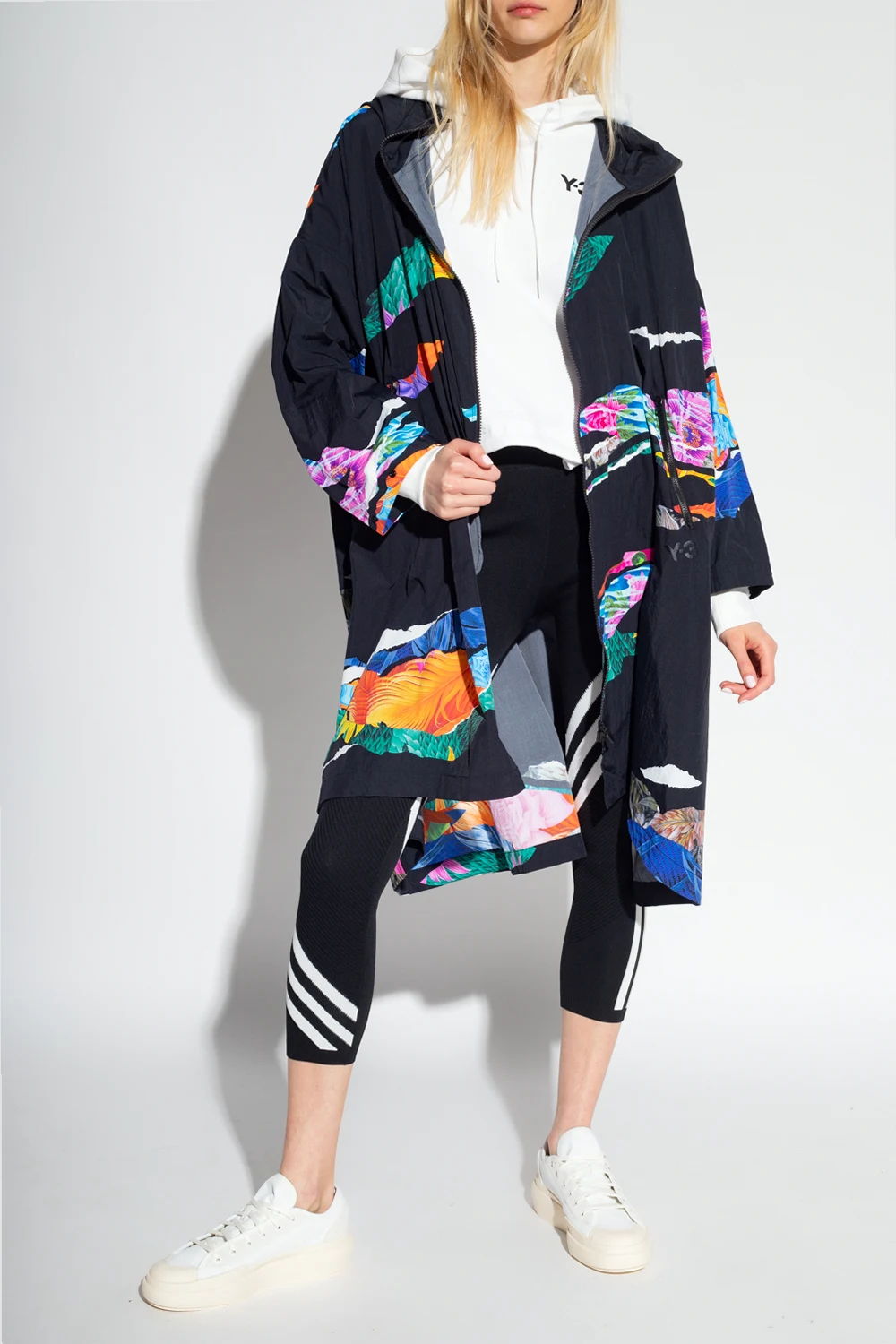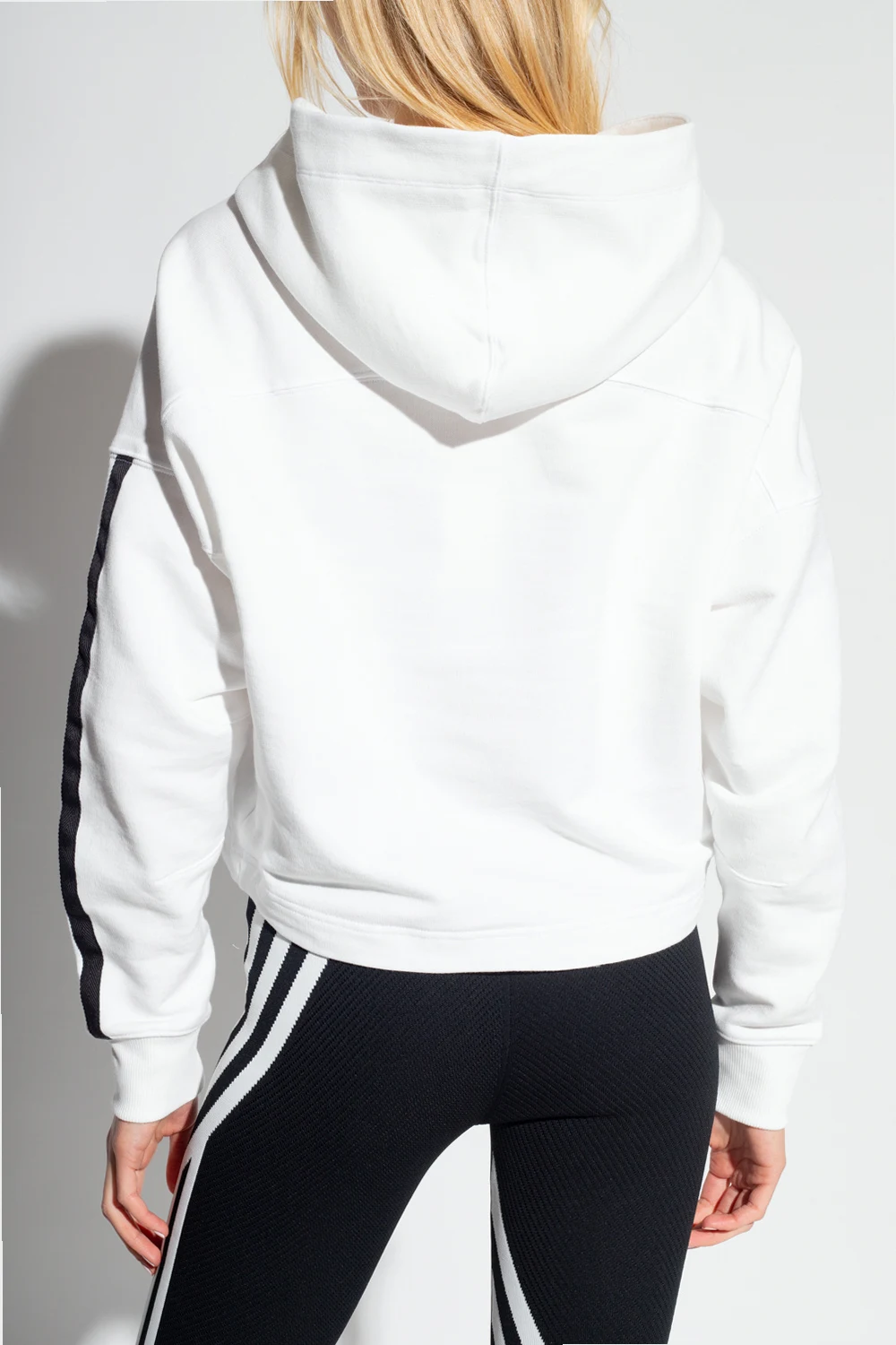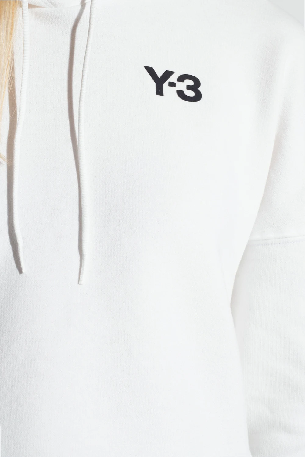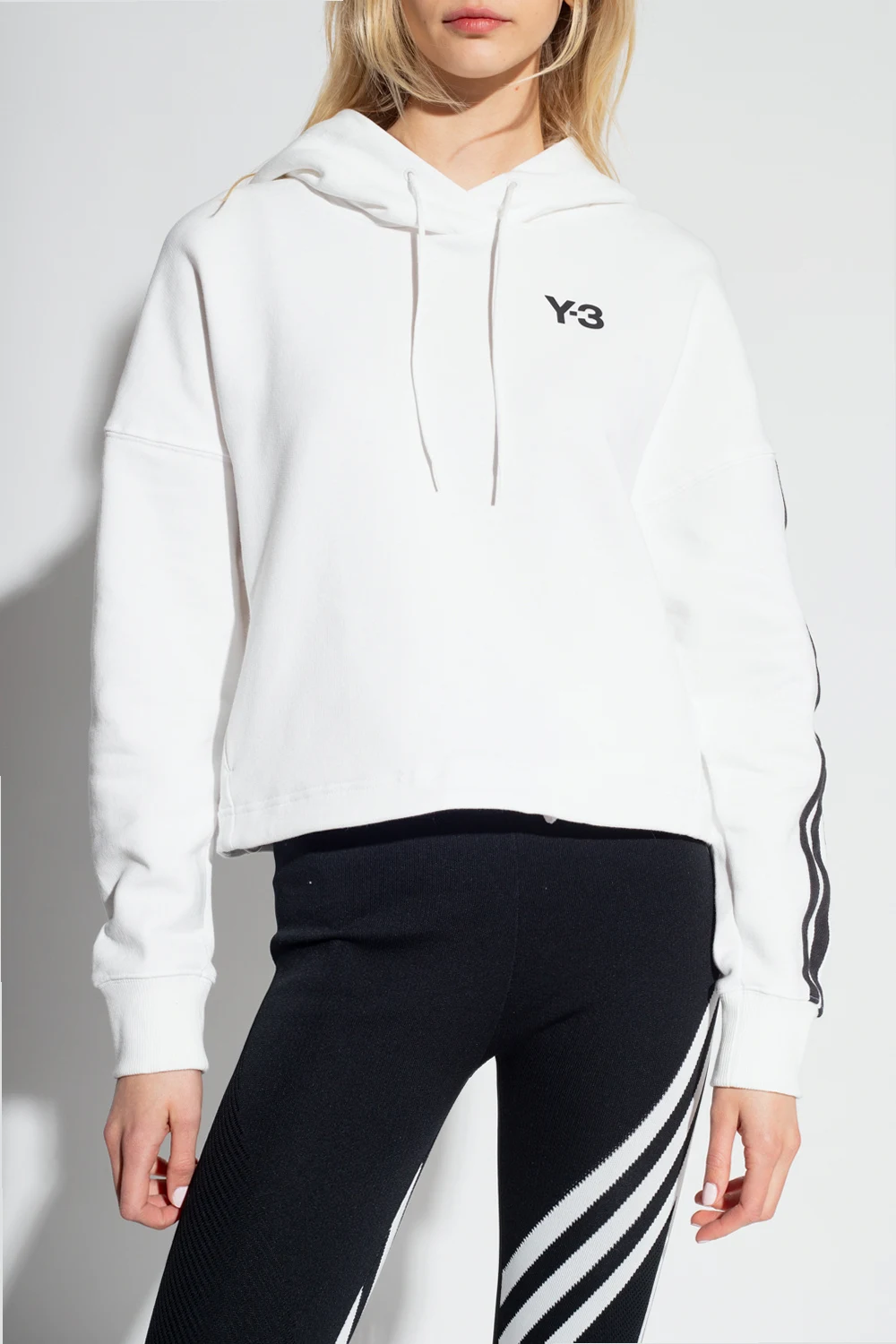 Biała, krótka bluza Y-3 Yohji Yamamoto. Wykonana z bawełny. Kaptur ściągany trokami. Logo w kolorze czarnym. Na jednym z rękawów charakterystyczne dla marki trzy paski. Dwie kieszenie zapinane na zamki. U dołu regulowana trokami.