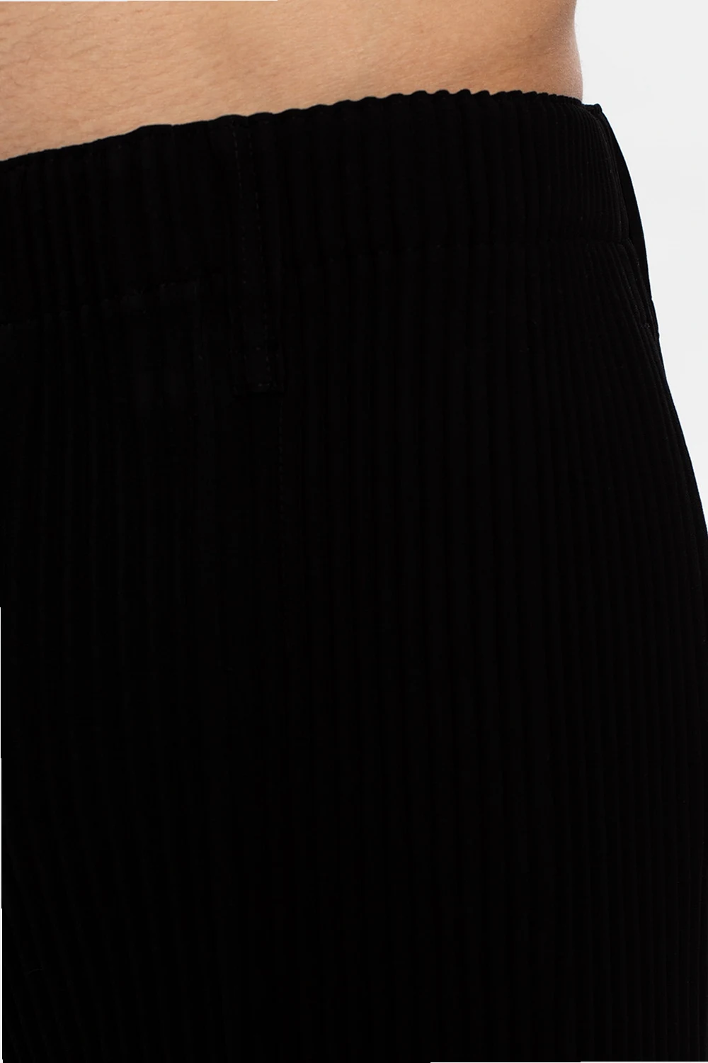Czarne, plisowane spodnie w kant Issey Miyake Homme Plissé. W pasie wszyta guma. Dwie wsuwane kieszenie. Długie, lekko zwężające się nogawki.