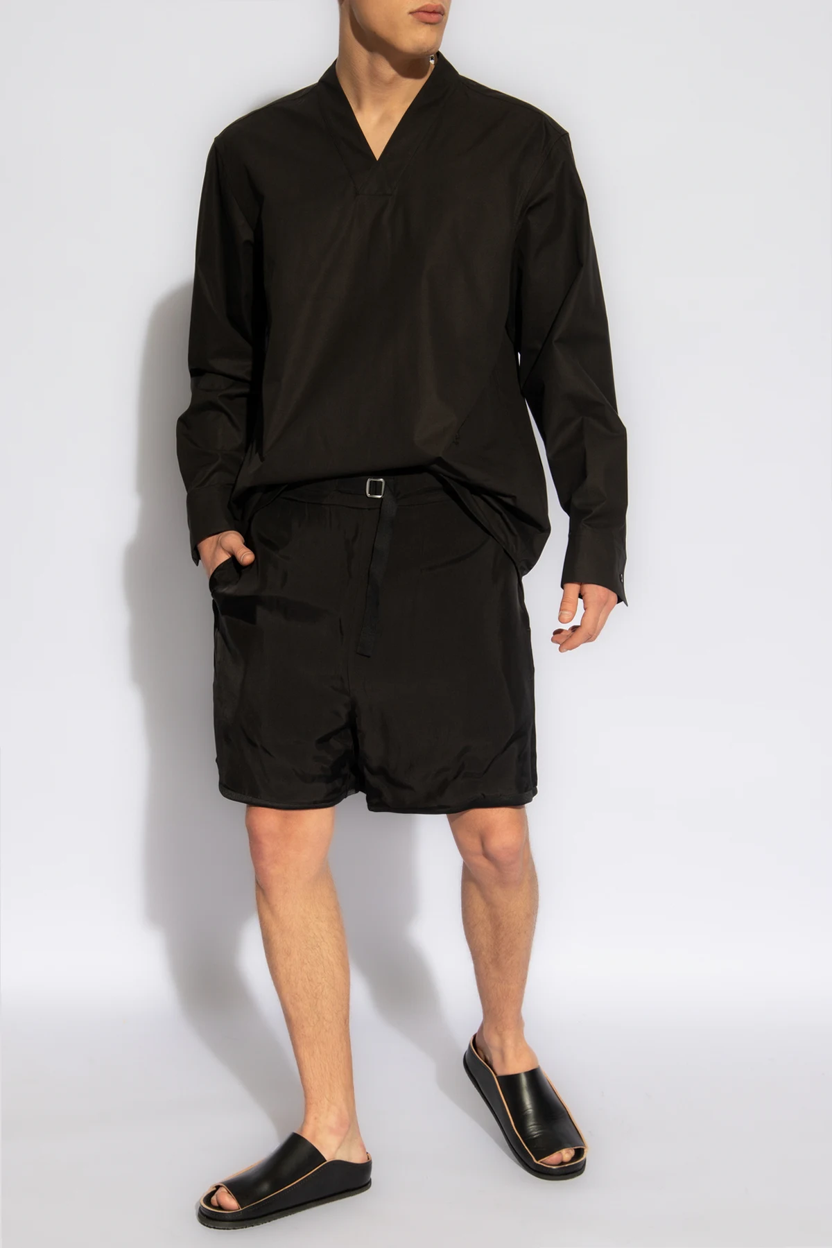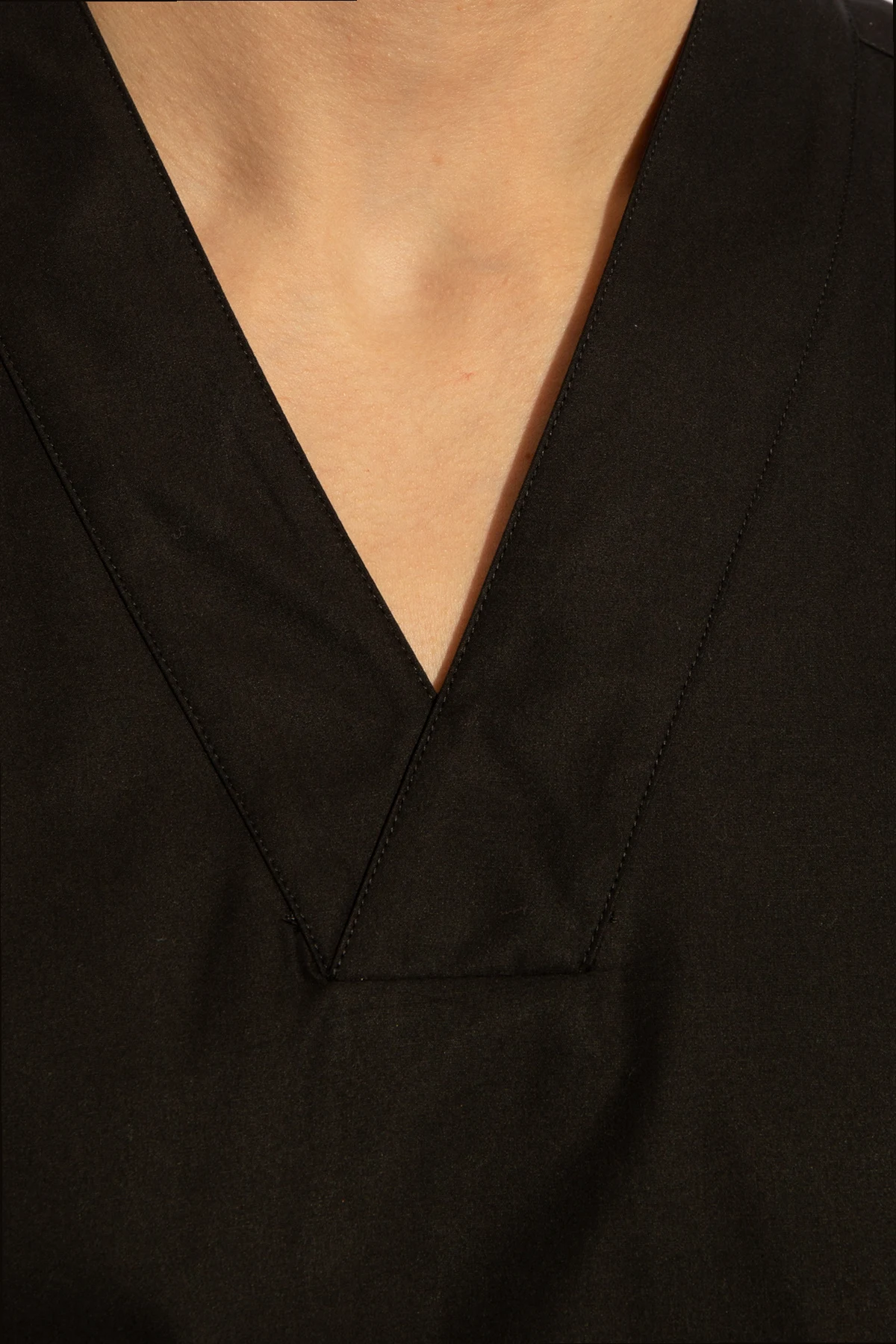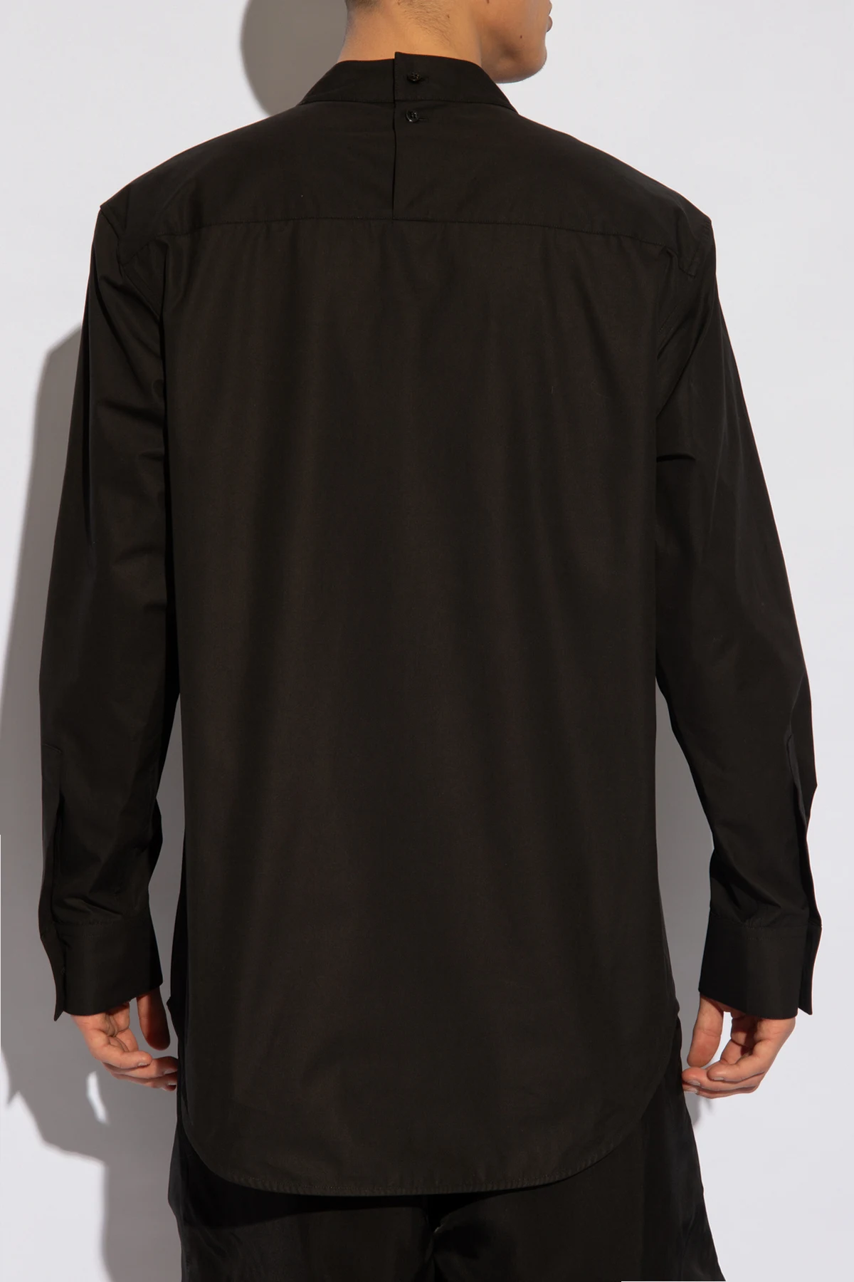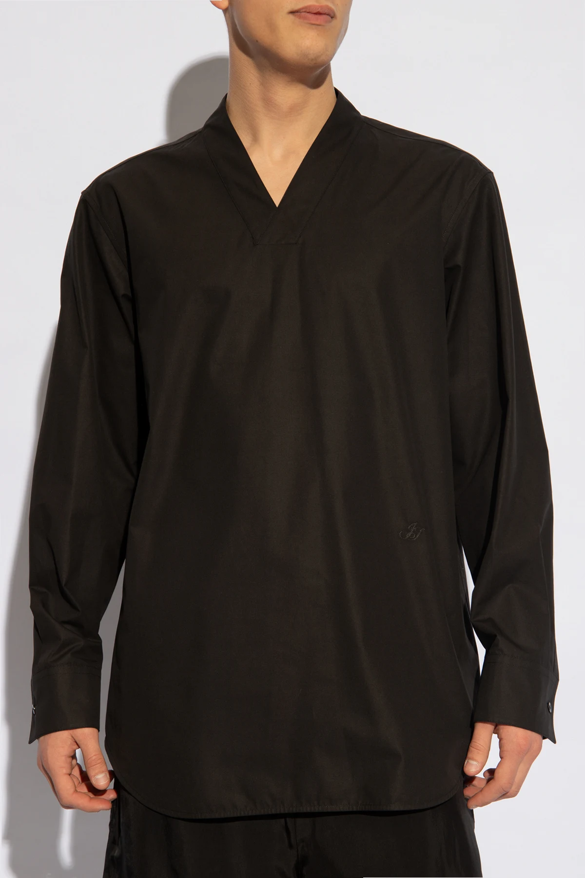 Czarna koszula o luźnym kroju, model ‘Saturday PM’ JIL SANDER. Wykonana z bawełny organicznej. Zapinana z tyłu na guziki. Z przodu wyszyte logo. Dekolt w serek. Długie rękawy zakończone mankietami zapinanymi na guziki.