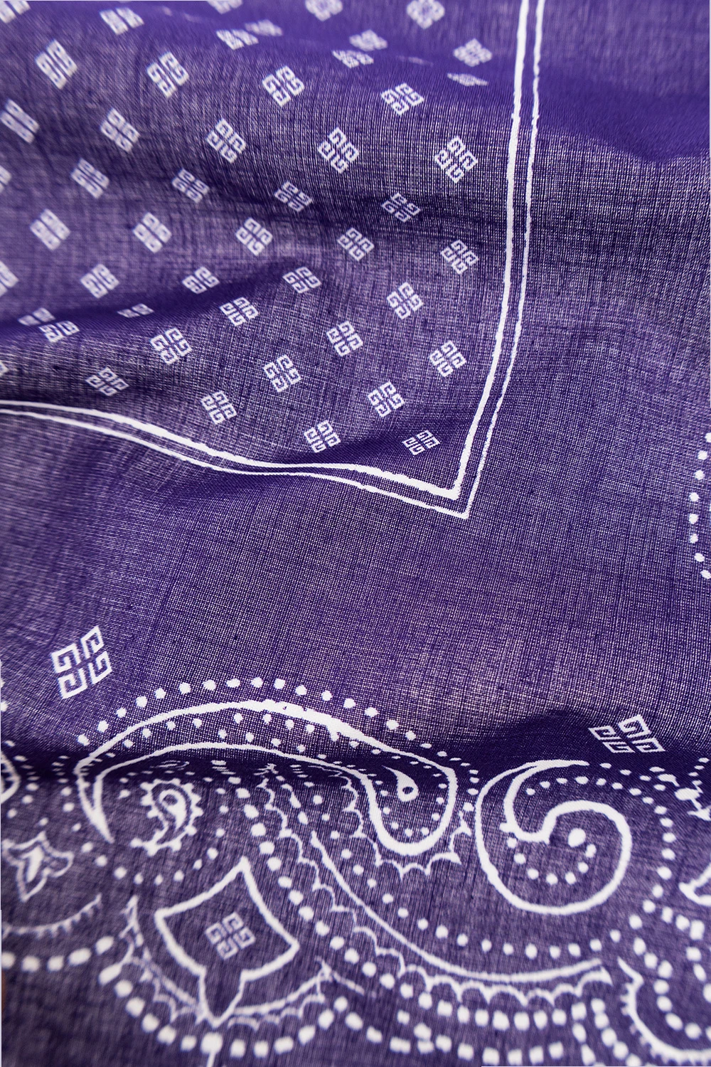 Fioletowa, bawełniana chusta Givenchy. Ozdobiona wzorem z motywem ‘paisley’ oraz z logo ‘4G’ w kolorze białym.