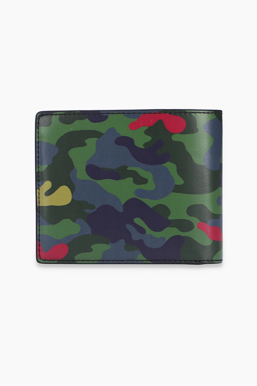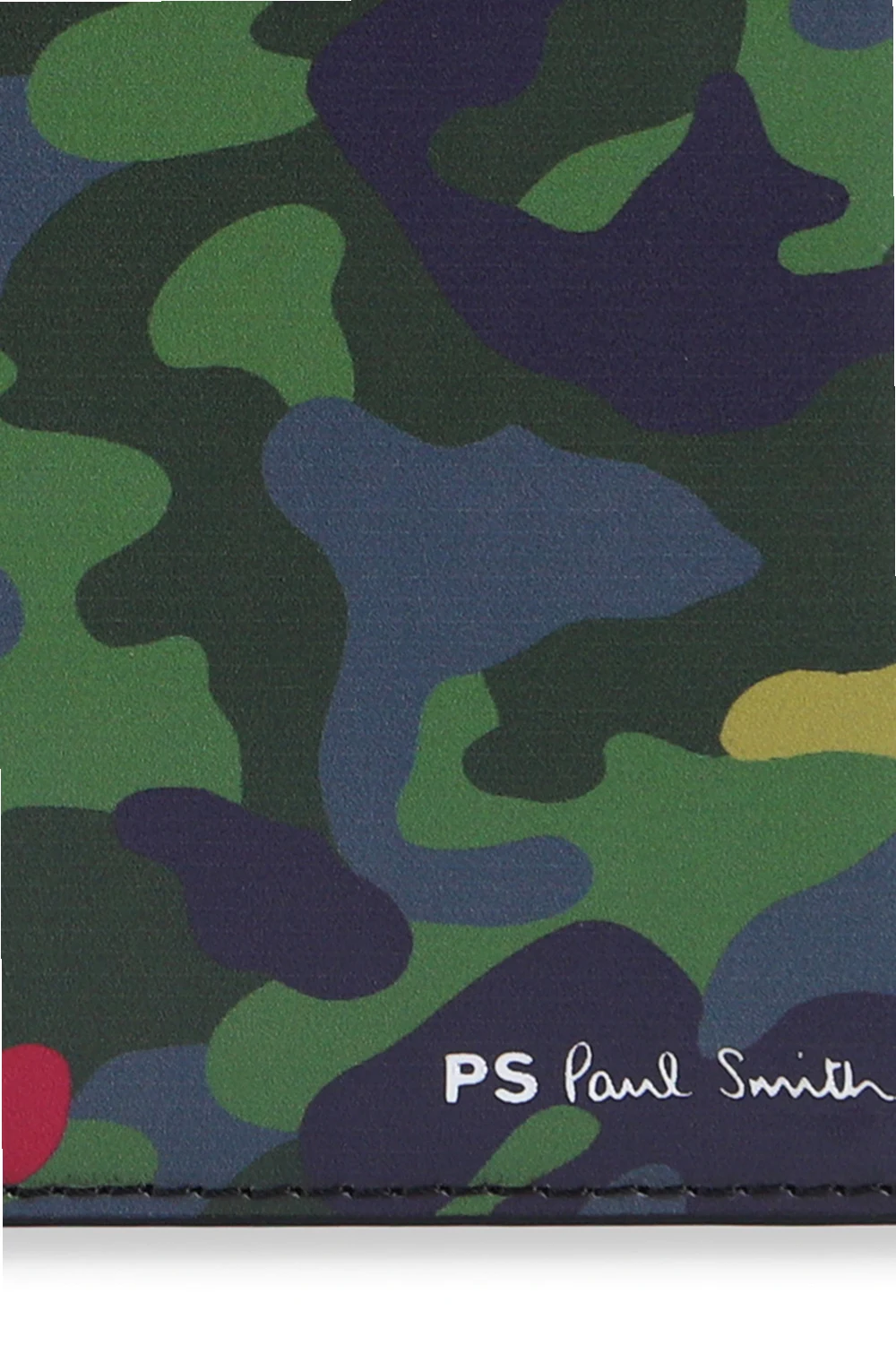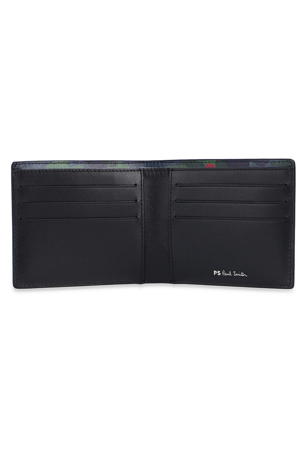 Kolorowy, składany portfel PS Paul Smith. Wykonany z krowiej skóry. Ozdobiony wzorem z motywem moro. Z przodu wytłoczone logo w kolorze białym. Czarna warstwa wewnętrzna. Wewnątrz przegroda na banknoty, dwie wsuwane kieszenie oraz sześć miejsc na karty.
