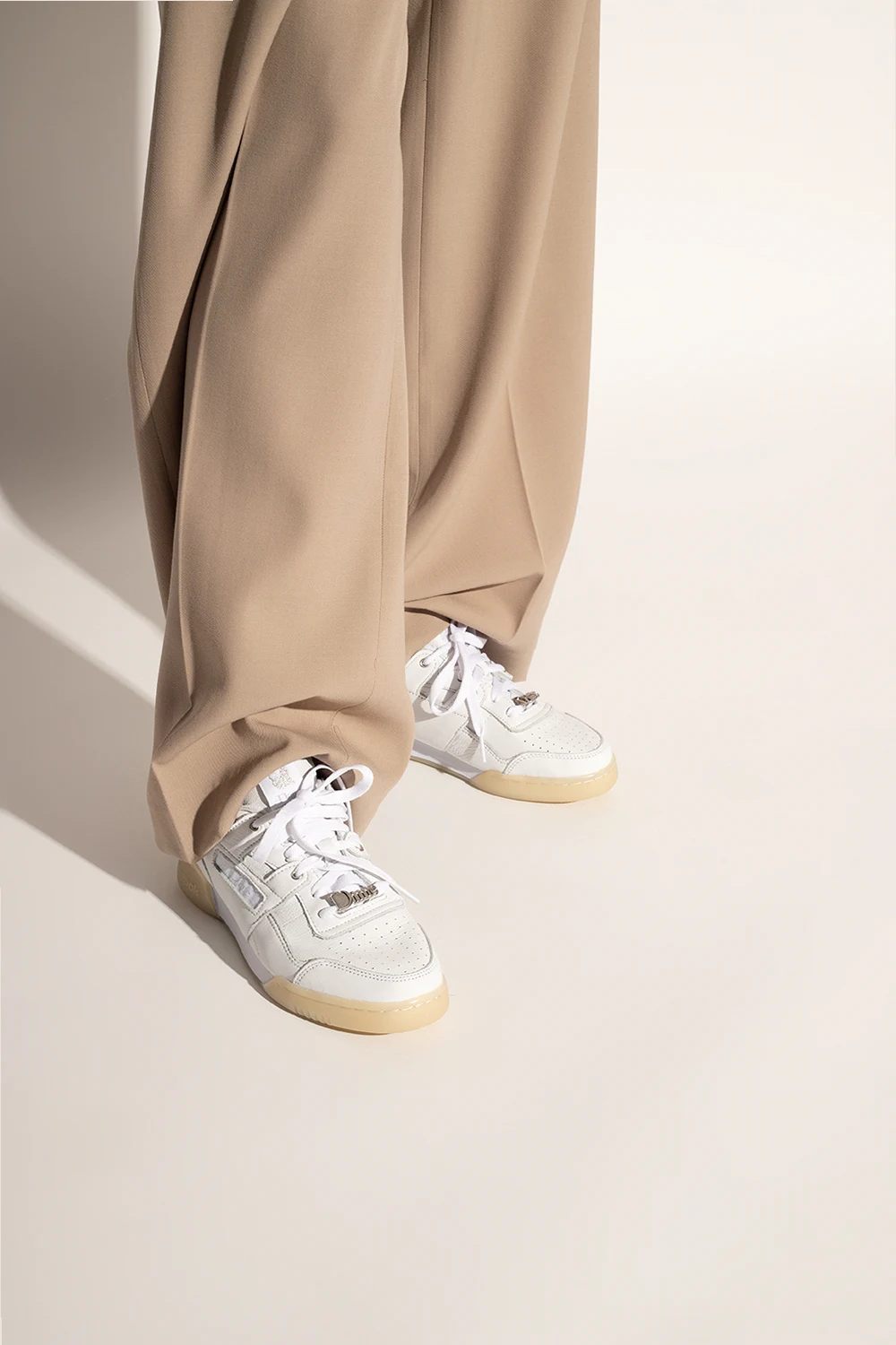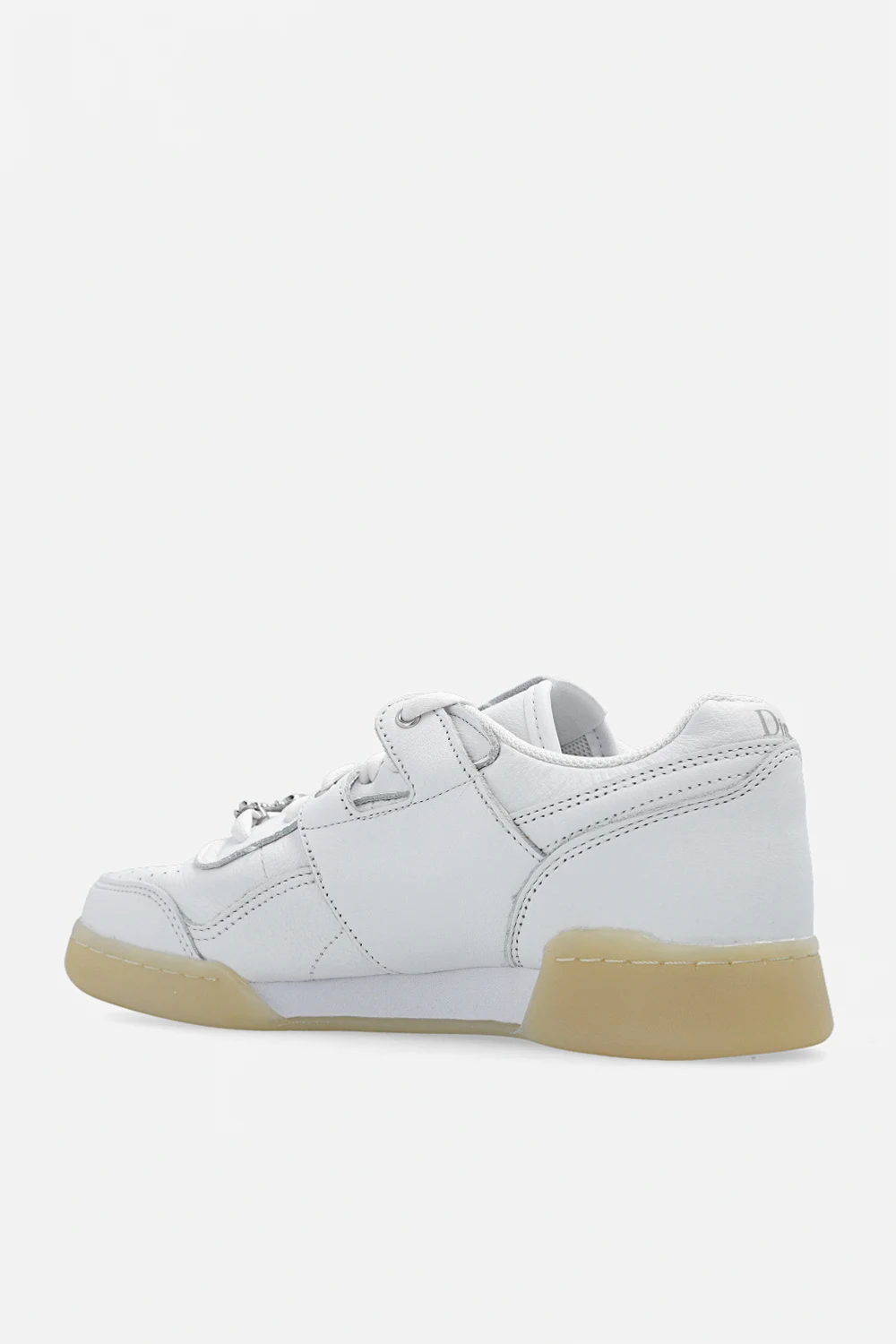 Białe, sznurowane buty sportowe, model ‘WORKOUT PLUS’ Reebok x Dime. Wykonane ze skóry i materiału. Ozdobione naszywką z logo nawiązującej do zniekształconego fresku 'Ecce Homo'. Biało-kremowa, gumowa podeszwa.