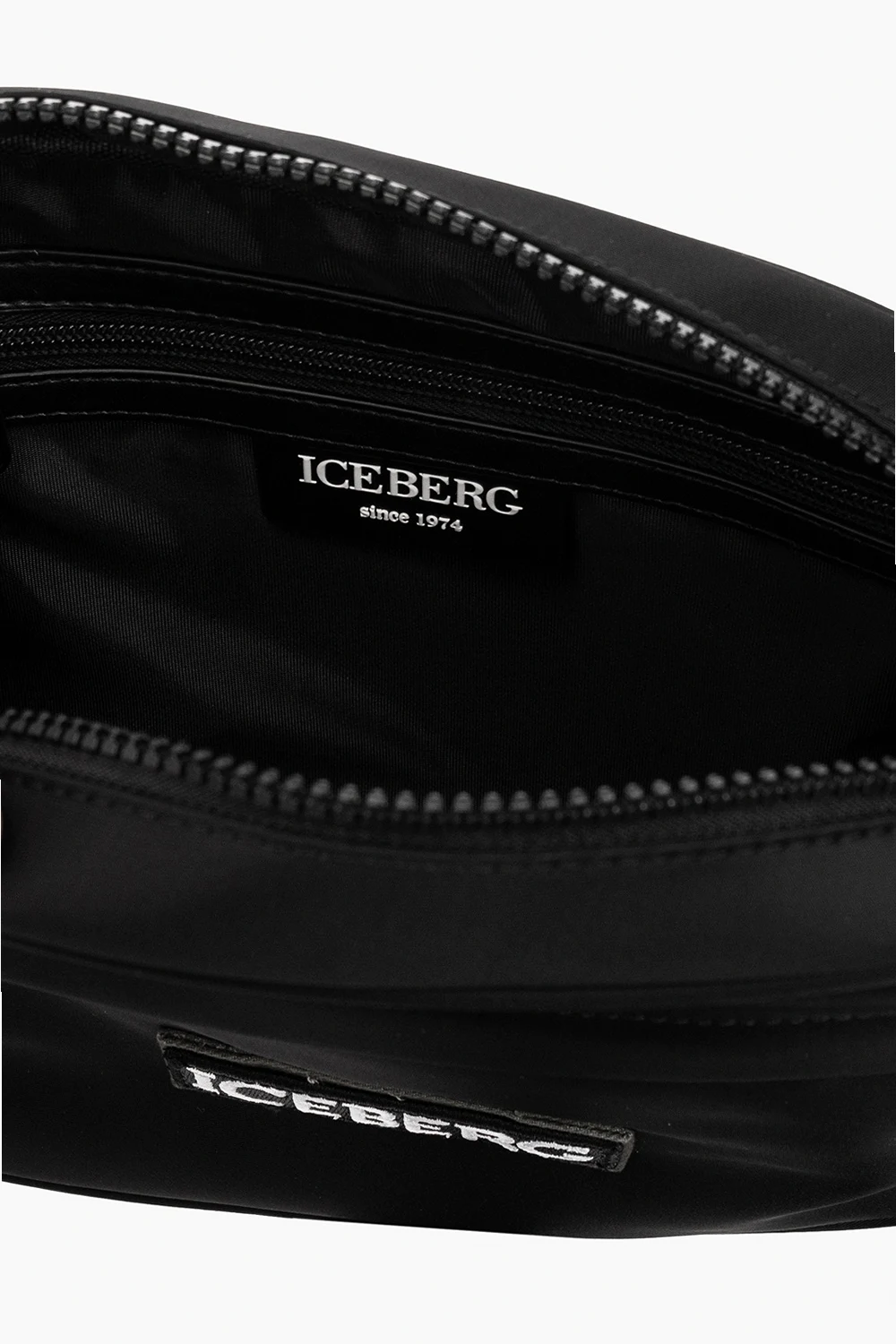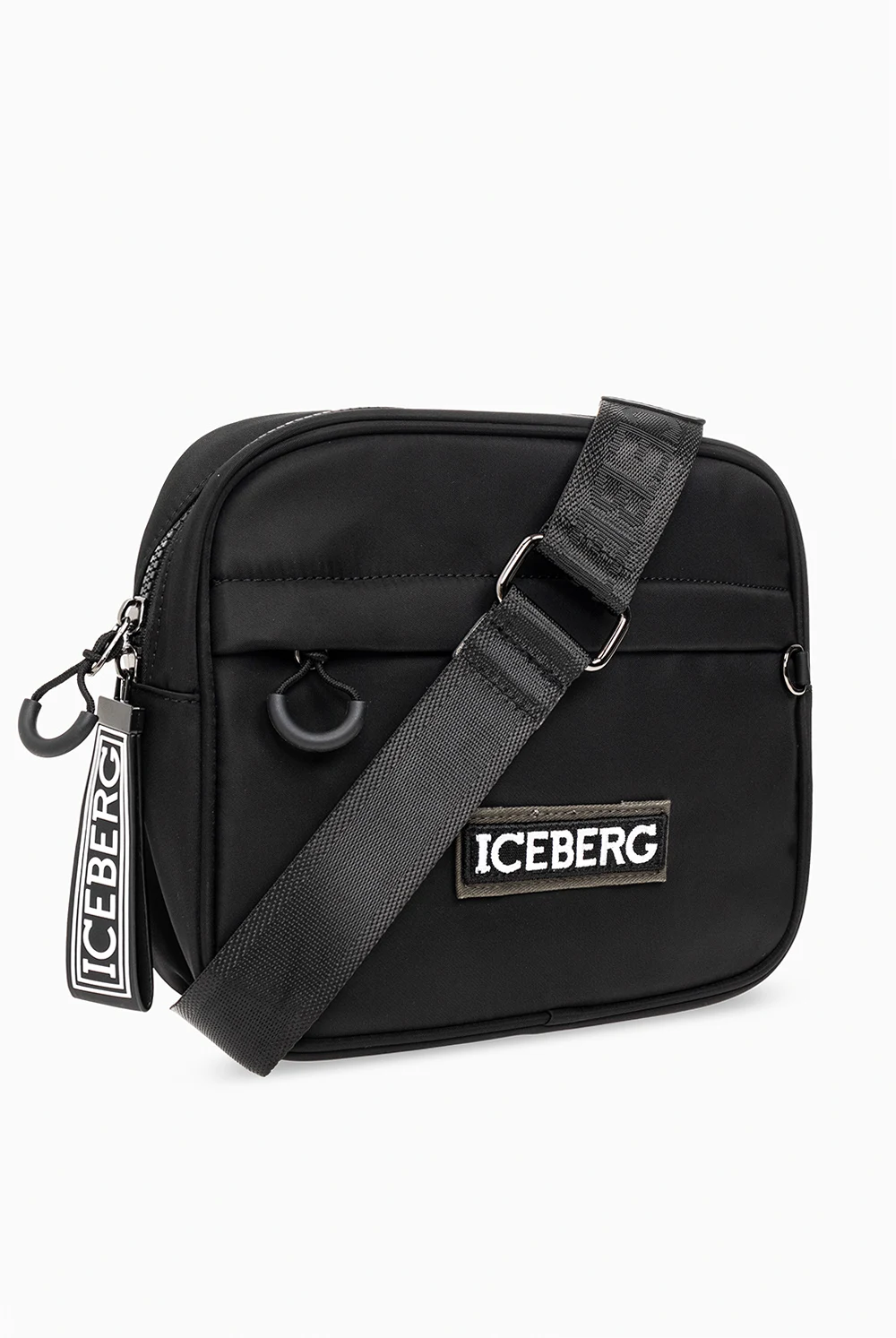 Czarna torba na ramię Iceberg. Zamykana na zamek. Ozdobiona naszywką z logo w kolorze biało-czarnym. Z przodu kieszeń zamykana na zamek. Wewnątrz komora oraz kieszeń zamykana na zamek. Metalowe wykończenie w kolorze srebrnym.