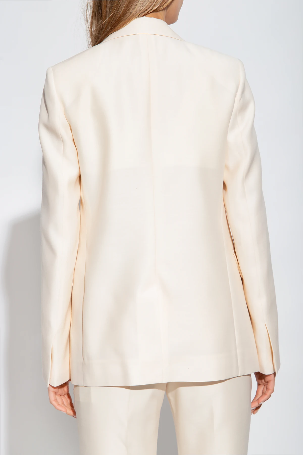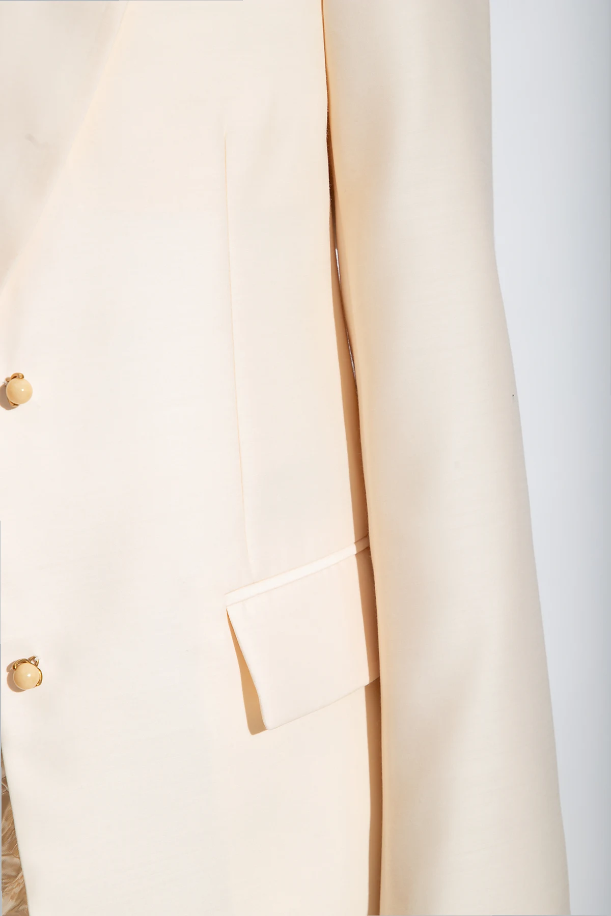 Kremowa, jednorzędowa marynarka Lanvin. Wykonana z mieszanki wełny dziewiczej i jedwabiu. Zapinana na dekoracyjne guziki. Kołnierz wykończony otwartymi klapami. Trzy kieszenie: wsuwana oraz dwie z patkami. Długie rękawy i tył wykończone pojedynczym rozcięciem.