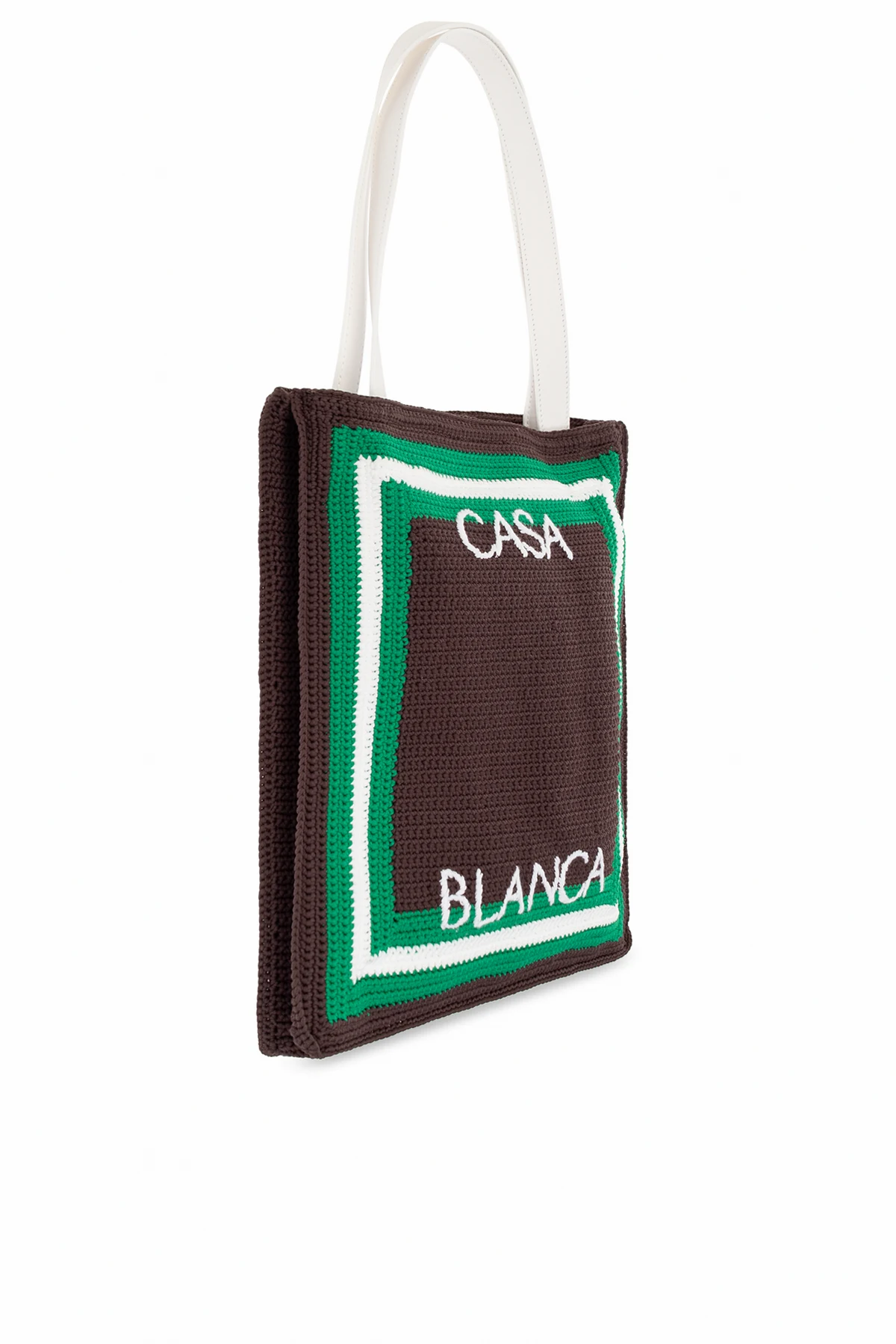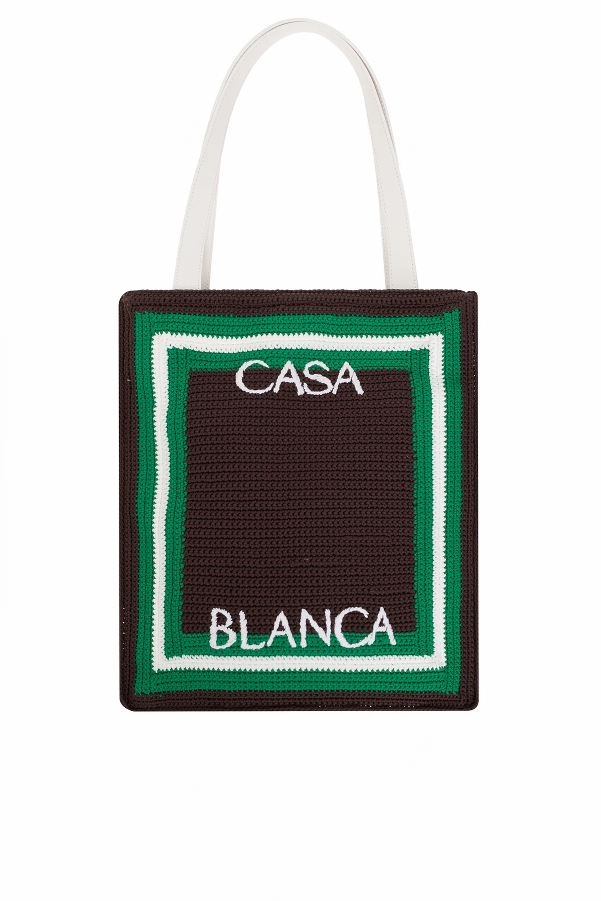 Brązowo-biało-zielona torba typu ‘shopper’ Casablanca. Wykonana z materiału. Wykończona skórą. Ozdobiona logo. Dwa półokrągłe paski. Wewnątrz komora.
