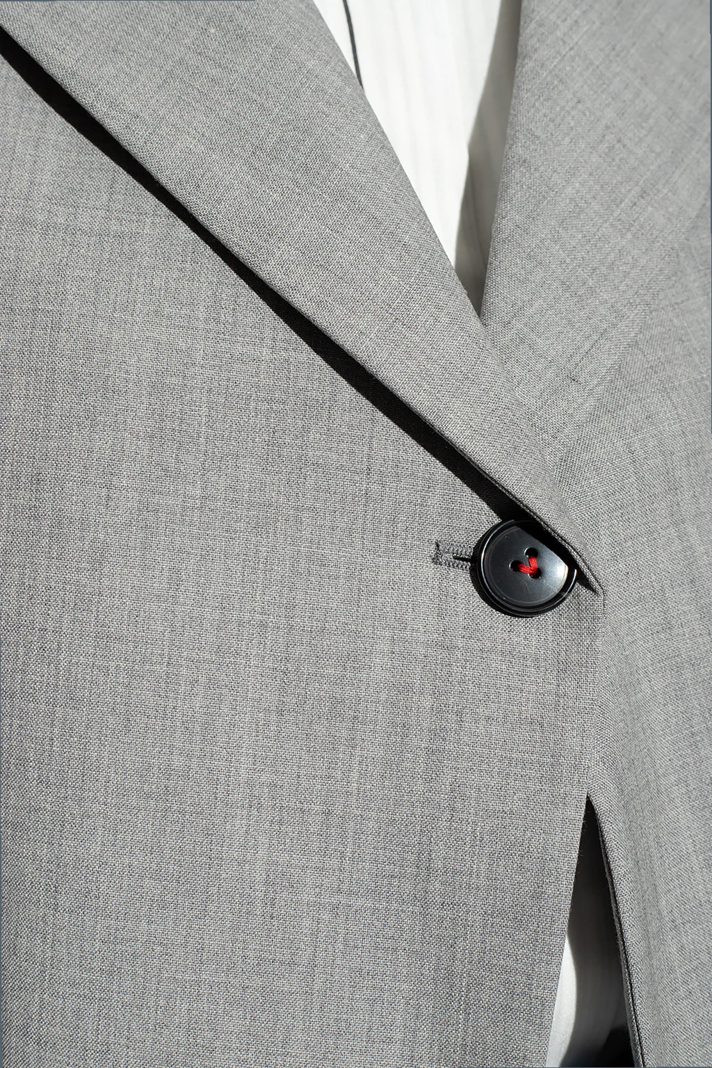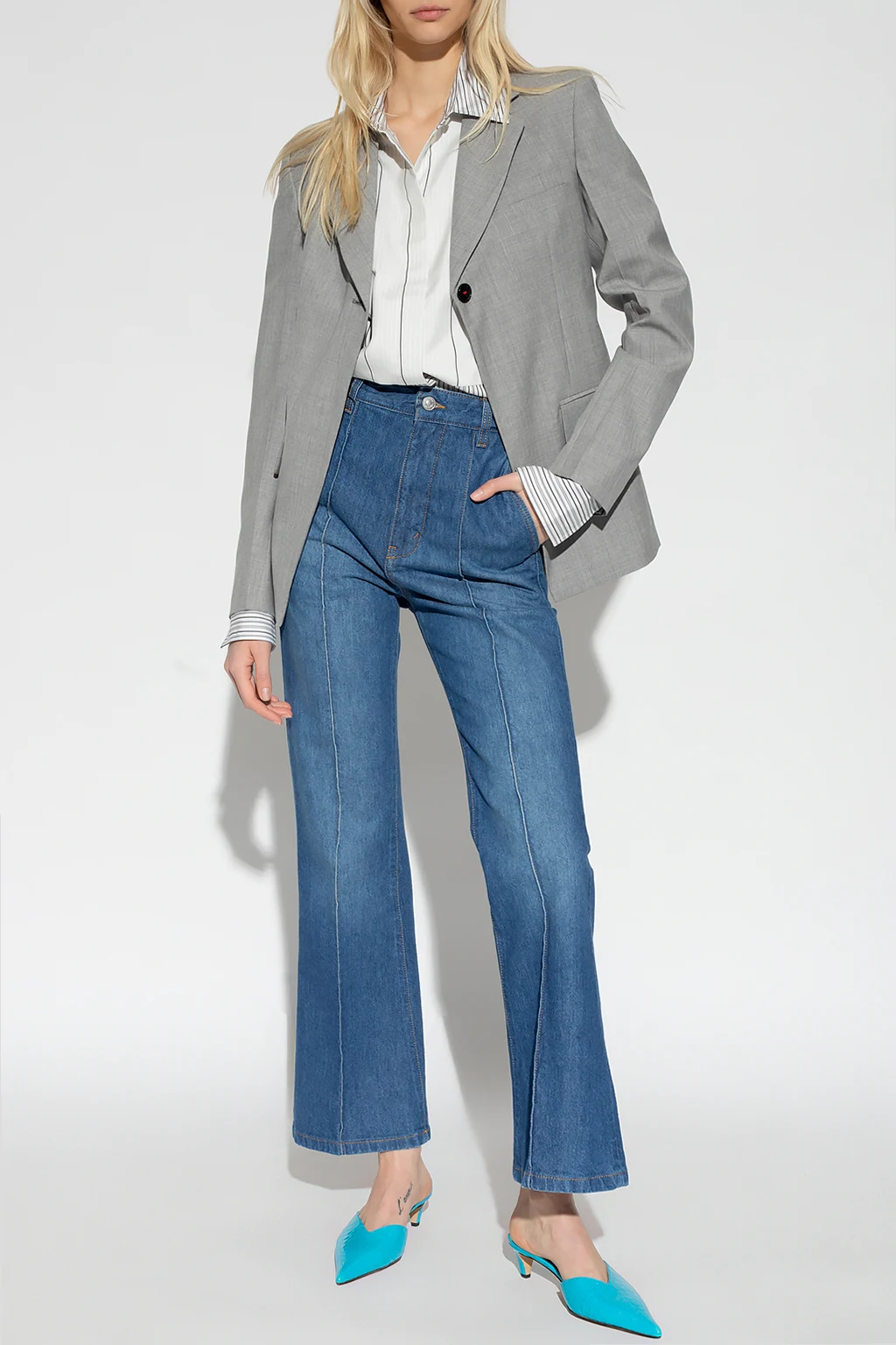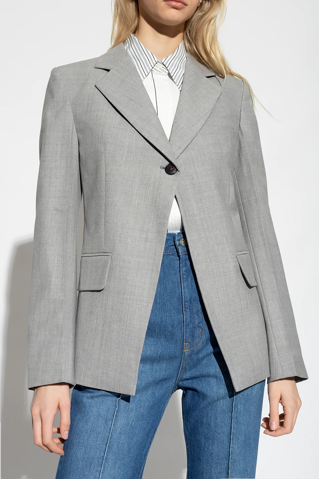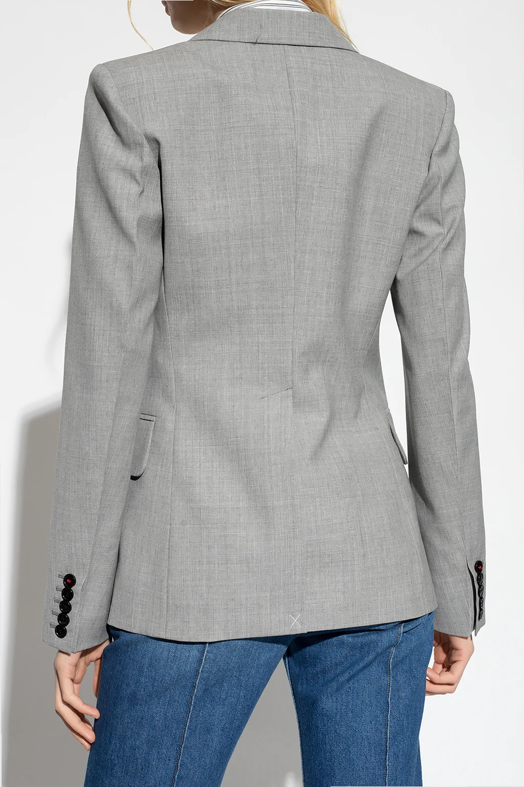 Jasnoszara marynarka Victoria Beckham. Wykonana z wełny. Zapinana na guzik. Otwarte klapy.